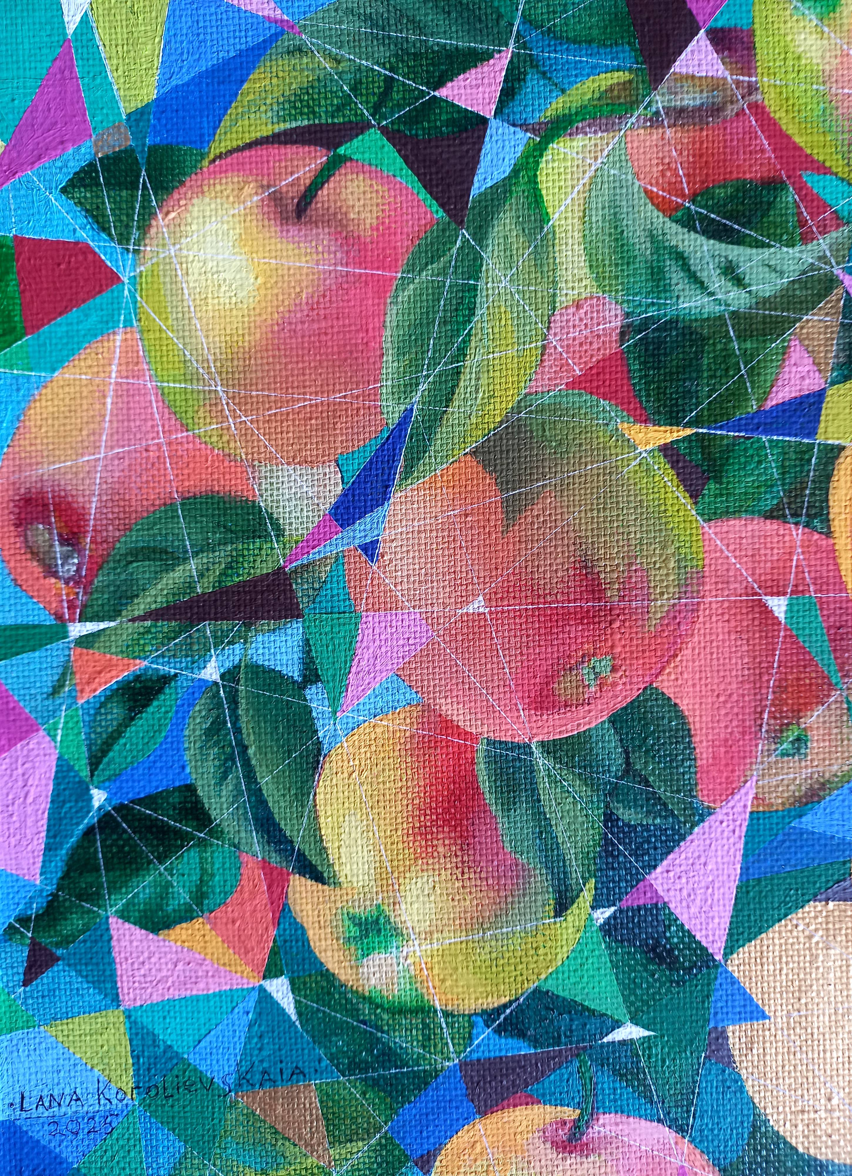 This small work is a continuation of the creative approach that I started in the painting "Dance of butterflies around a flower" (2020), combining a realistic image of flora and abstract geometric structures that dot everything like a web and turn real objects of objective reality into a kind of stained glass or mosaic. A similar principle was implemented by me in the paintings "Diffusion of rose scent" (2020) and "Metaphysical still life of passing autumn" (2024). Suddenly returning to the established approach after the landscapes, I am supplementing my series with this new artwork created on the basis of the developed patterns. And again, as in most of my works, despite the apparent superficiality under the mask of purely visual appeal, one may not notice the fullness of hidden meaning. The contradictory symbol of the apple is shown here in an absolutely benevolent key, without a hint of