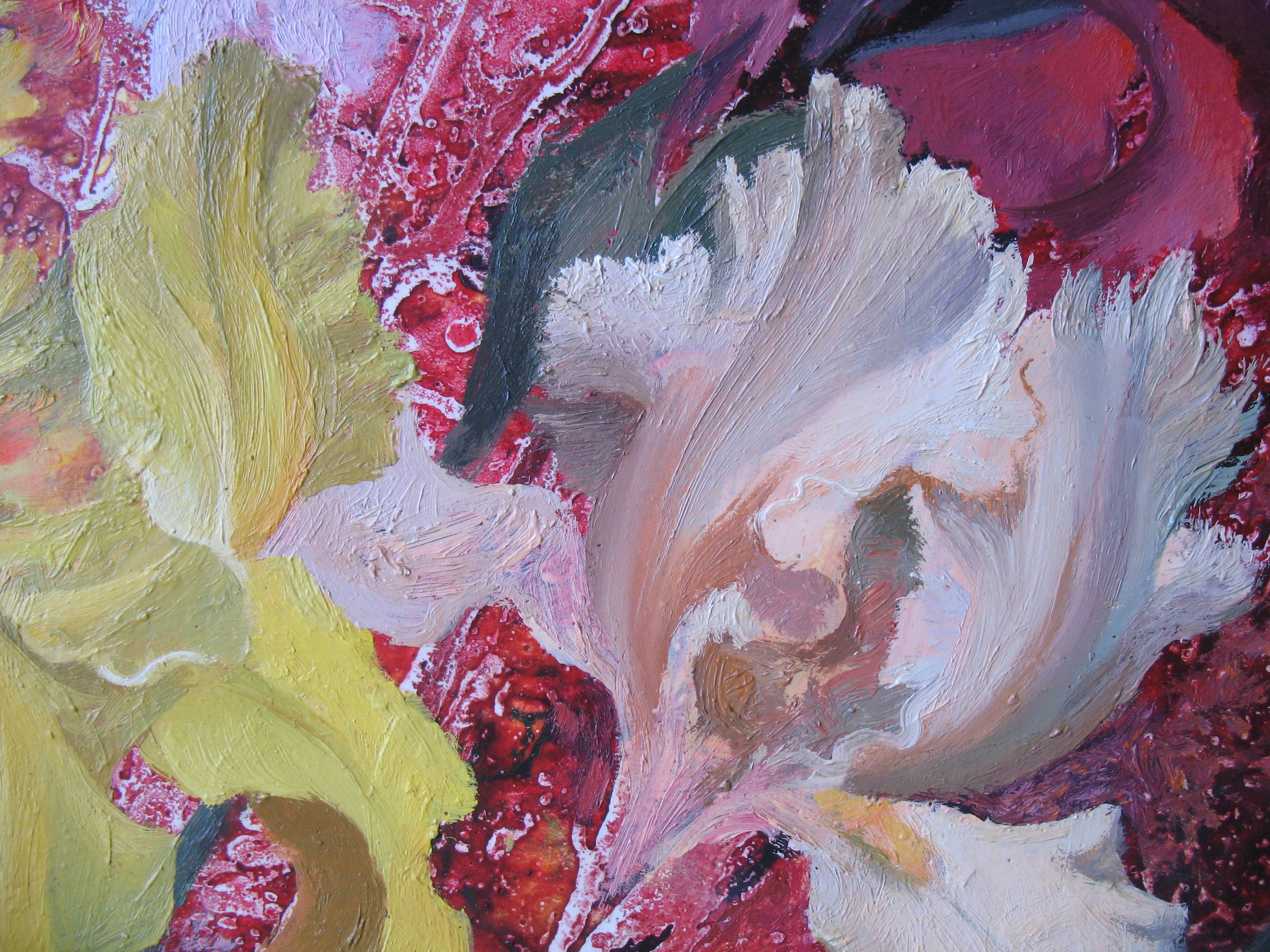Iris is a symbol of rainbow and pacification. Bright soft iris petals, shimmering in different colors, are dedicated to the Greek goddess of the rainbow Iris. Iris is a messenger from heaven, transmitting news to people from the Olympic gods, flying so fast that a mere mortal can only see the rainbow light from her flight. So iris is a rainbow flower. Flowers fascinate the artist. She again paints luxurious flowers against a pulsating burgundy background. Irises strive to fill the space of the canvas, filling it with their beauty. In the teaching and art of organizing living space, irises mean wisdom and endless youth, a life that does not know old age. Irises harmonize well the space where the family gathers. This is a wonderful symbol of good relations and friendship, so giving iris flowers is appropriate for various celebrations for people of all ages.