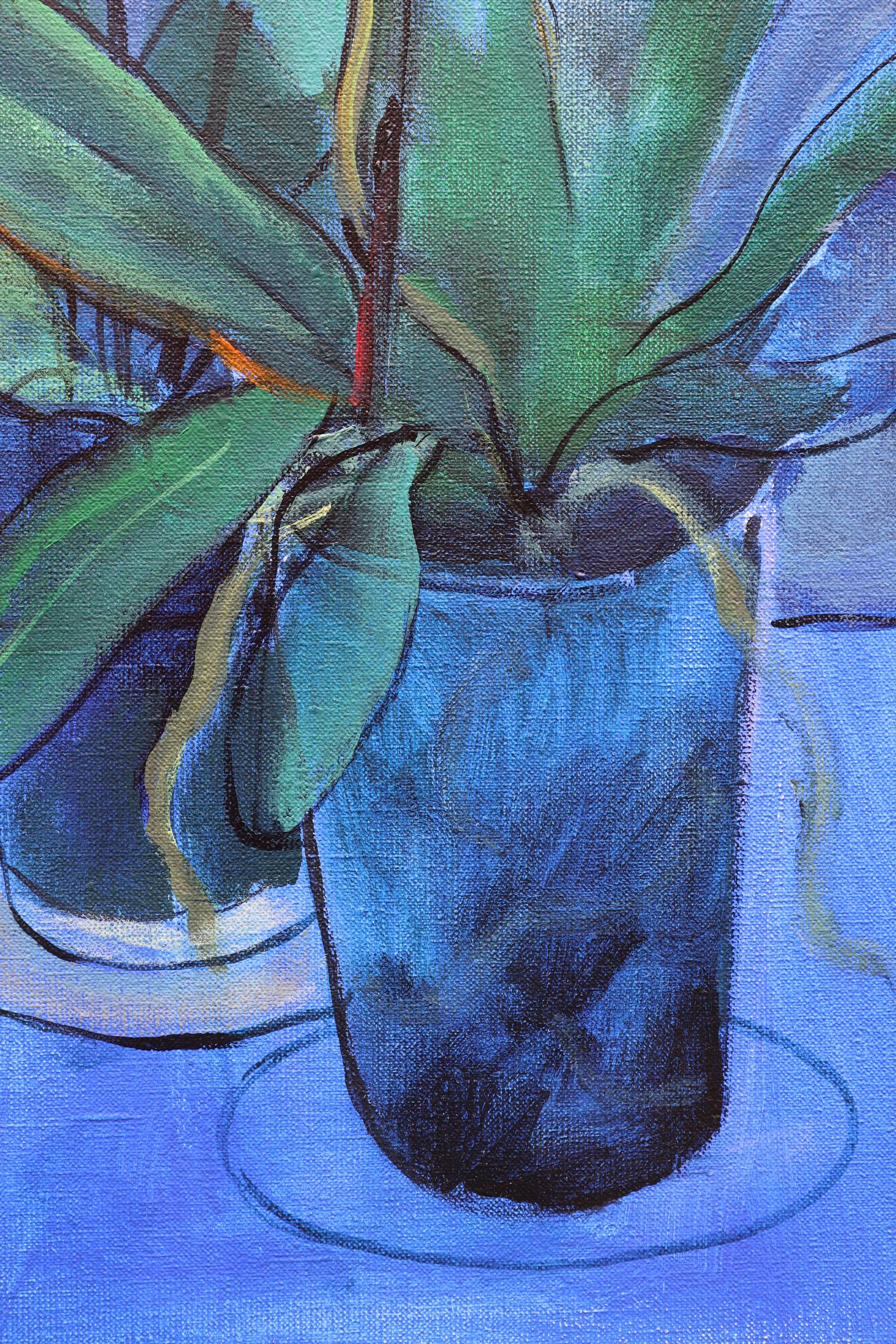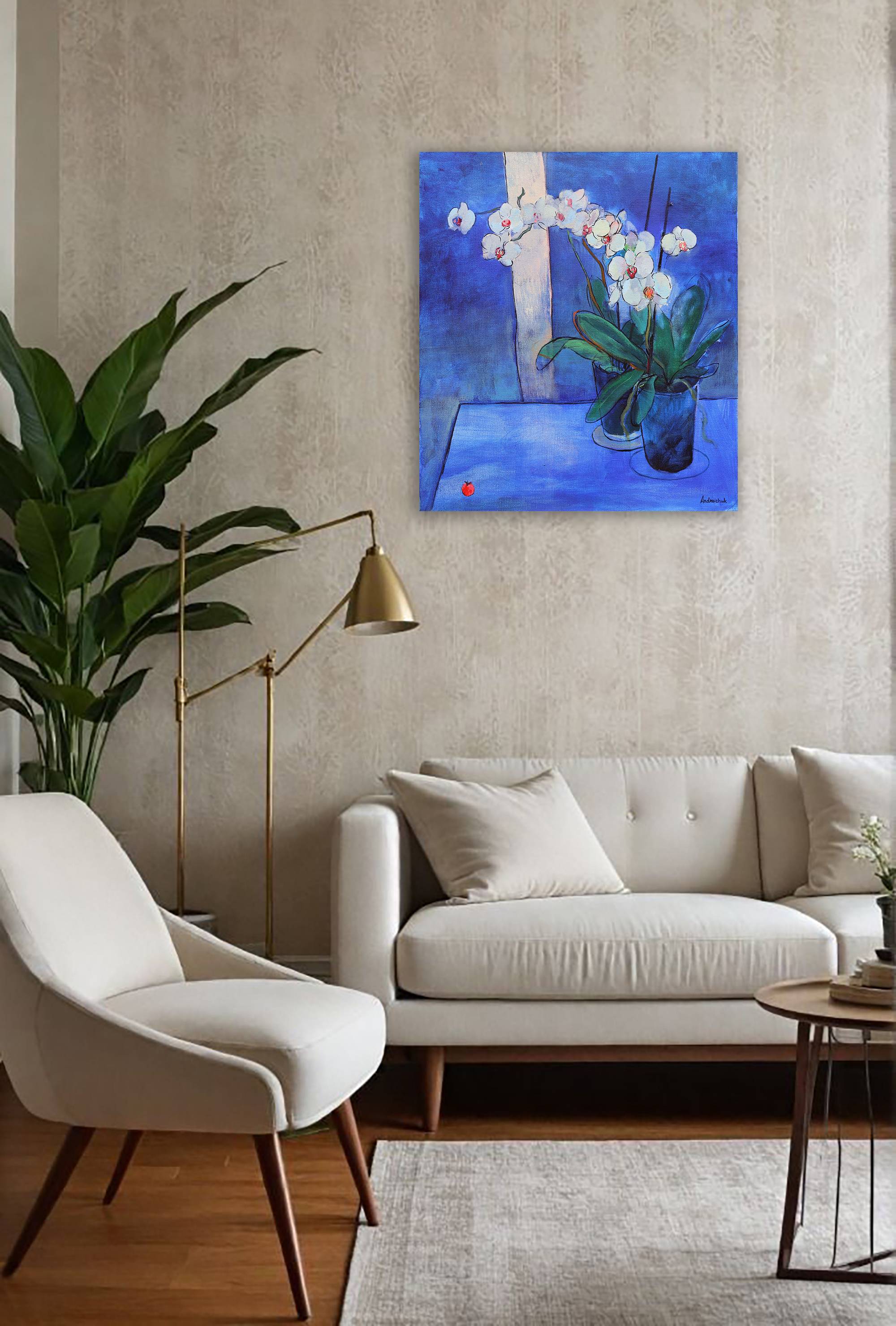 “Orchid and Little Tomato” (2025) is a contemplative still life in acrylic on canvas, where elegance meets quiet playfulness. The graceful white orchids stretch across a luminous blue background, their fragility softened by tender green leaves. At the bottom of the canvas, a single small tomato rests — a whimsical yet profound counterpoint to the solemn beauty of the flowers. This contrast between the refined and the ordinary turns the composition into a meditation on harmony, impermanence, and the poetry of everyday details.