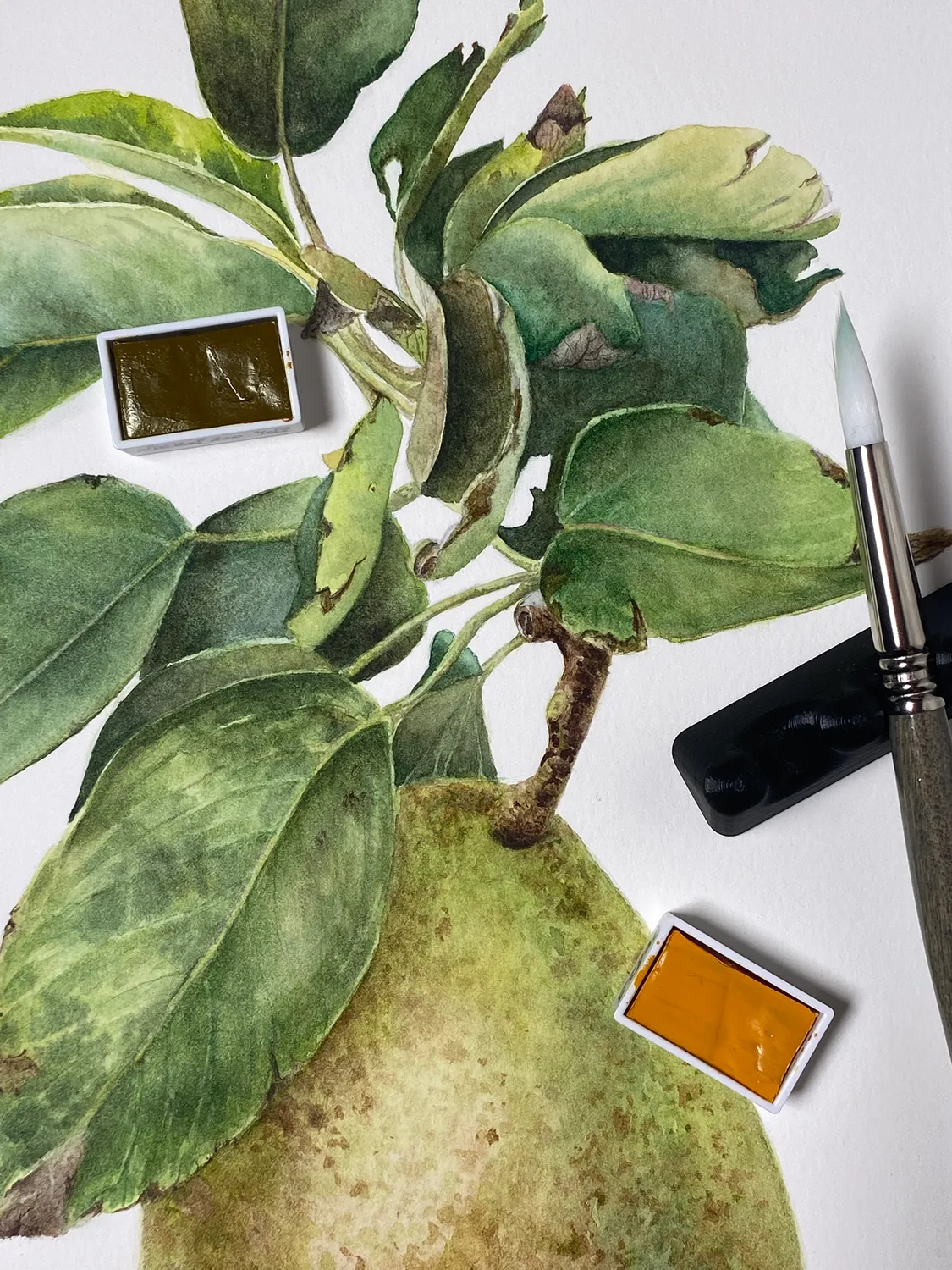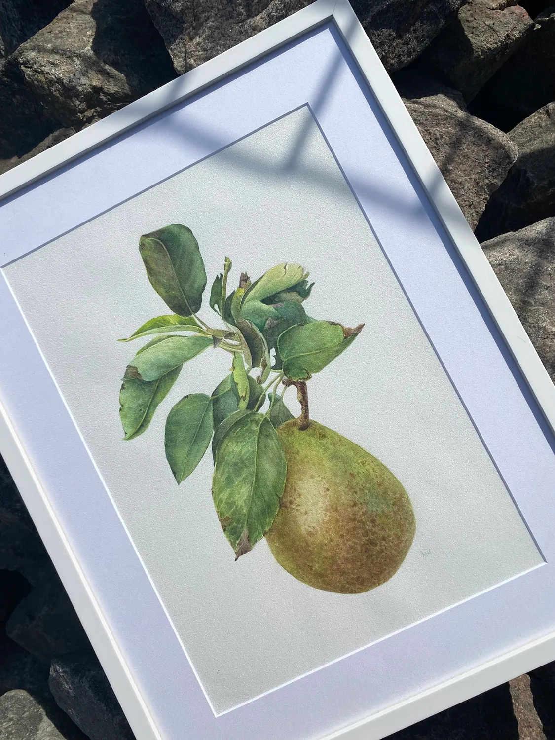 The pear branch depicted in the painting came from a tree that grows in my parents’ garden. For many years, it bore no fruit, and my father wanted to cut it down. I convinced him to wait — and in time, the tree gifted us not only with sweet fruit but also with artistic inspiration. One day, the wind broke off a branch, and I decided to preserve it through watercolor.