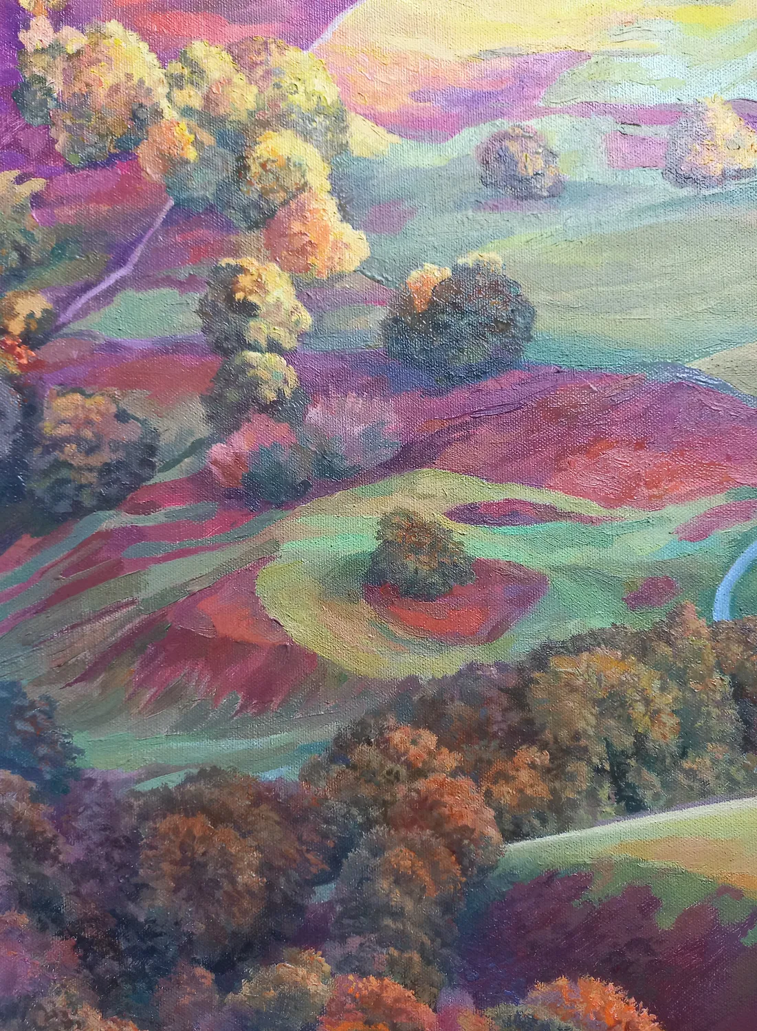 In this landscape, the sun no longer reigns above the earth — it dissolves within it. Light turns into sound, warmth, and breath — into a quiet presence that remains after the day is gone. Here begins the first whisper of autumn — not yet cold, but a subtle shift in the air, a lucid transparency that hints at change. The painting captures not a moment but a resonance — the way nature responds to the departing sun. The palette moves through gentle transitions of golds and purples, carrying the breath of evening. Everything seems to sound — the grass, the hills, the silence — as if the earth itself answers the light with its final chord.