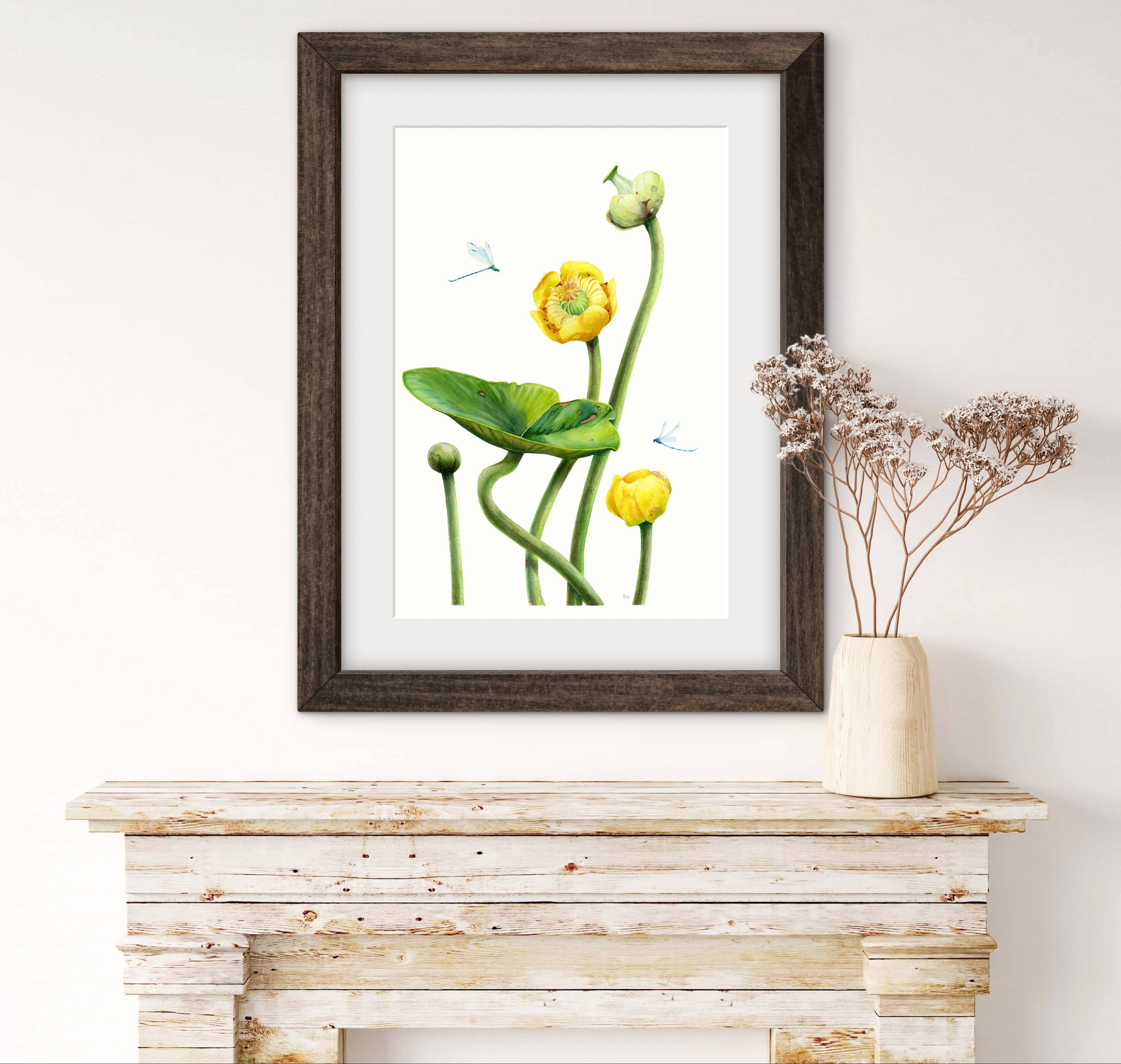The water lily, with stems, embodies feminine energy, femininity born from the depths. Painted with professional lightfast paints on high-quality cotton paper, this work ensures long-lasting brightness and preserves sunny mood for years to come. Cheerful green leaves add realism to work.