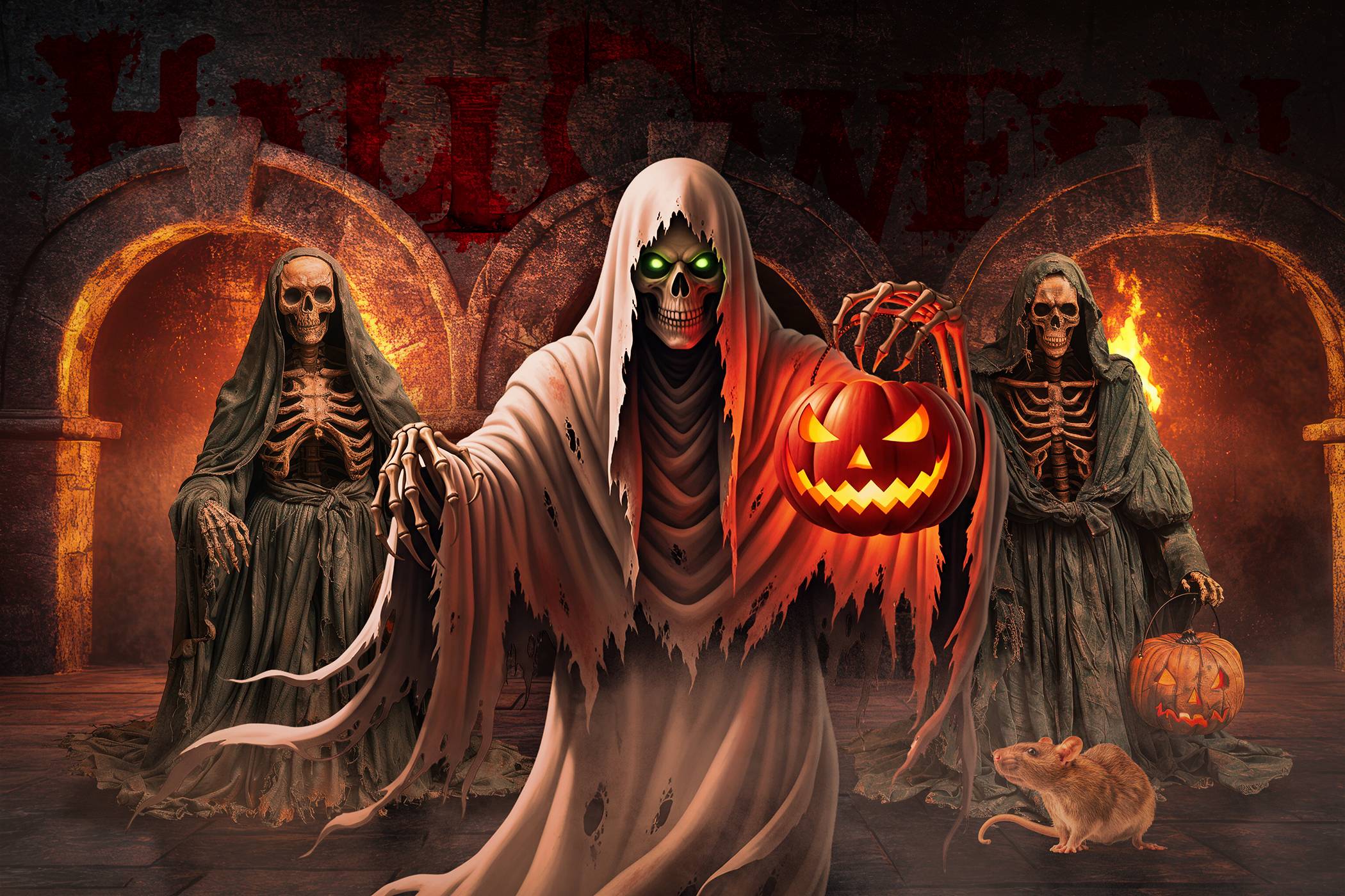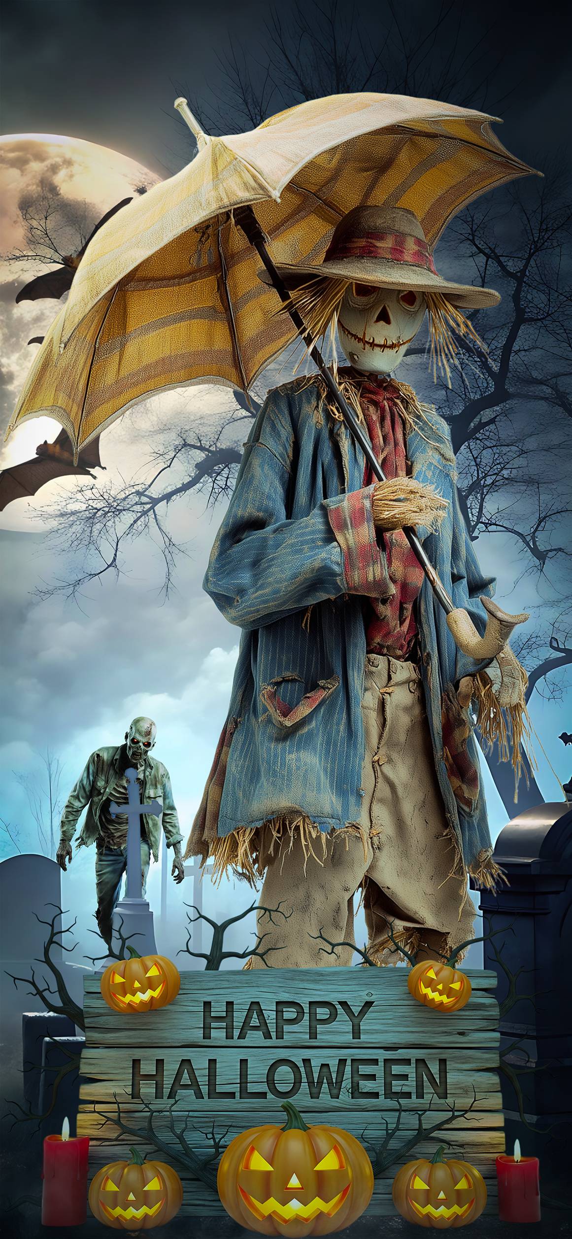 A scarecrow with fork next to some pumpkins in a graveyard with a zombie in the background.