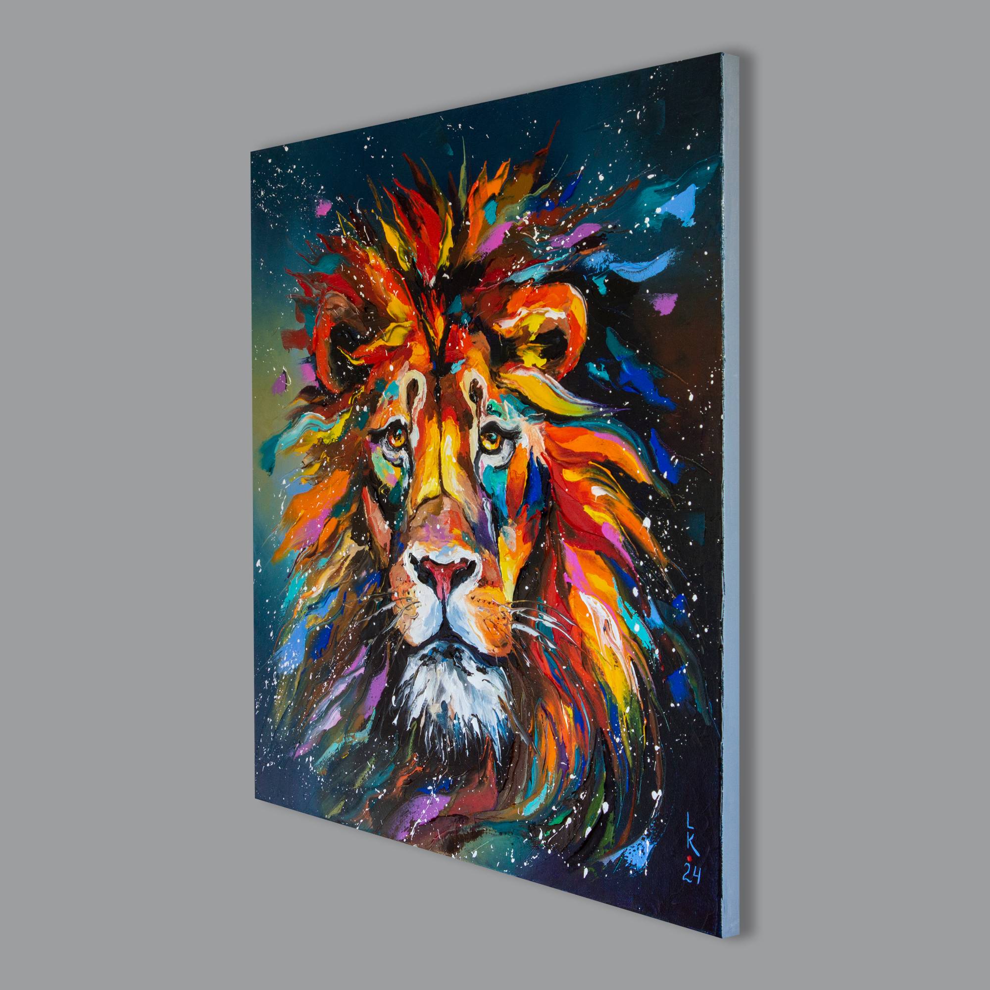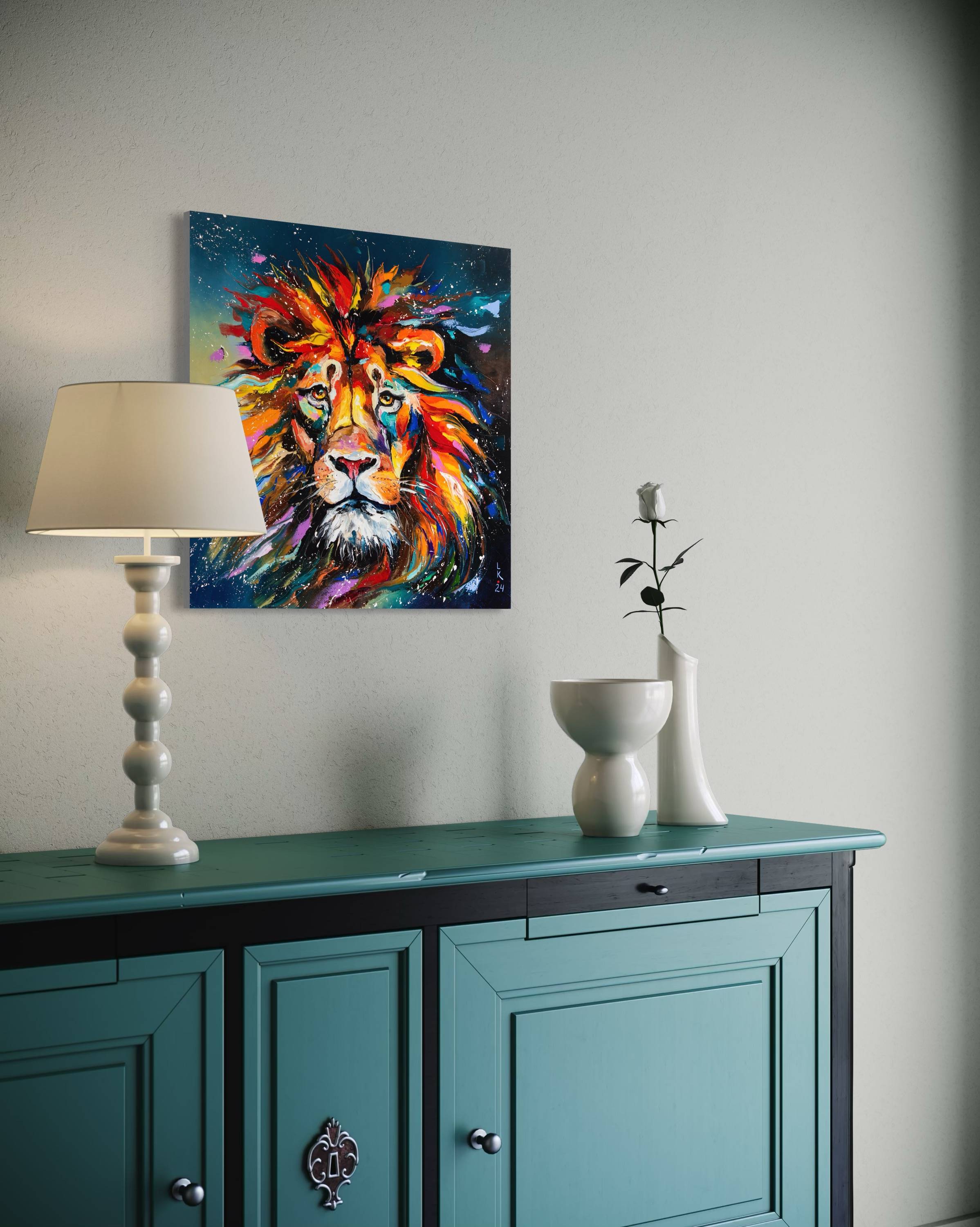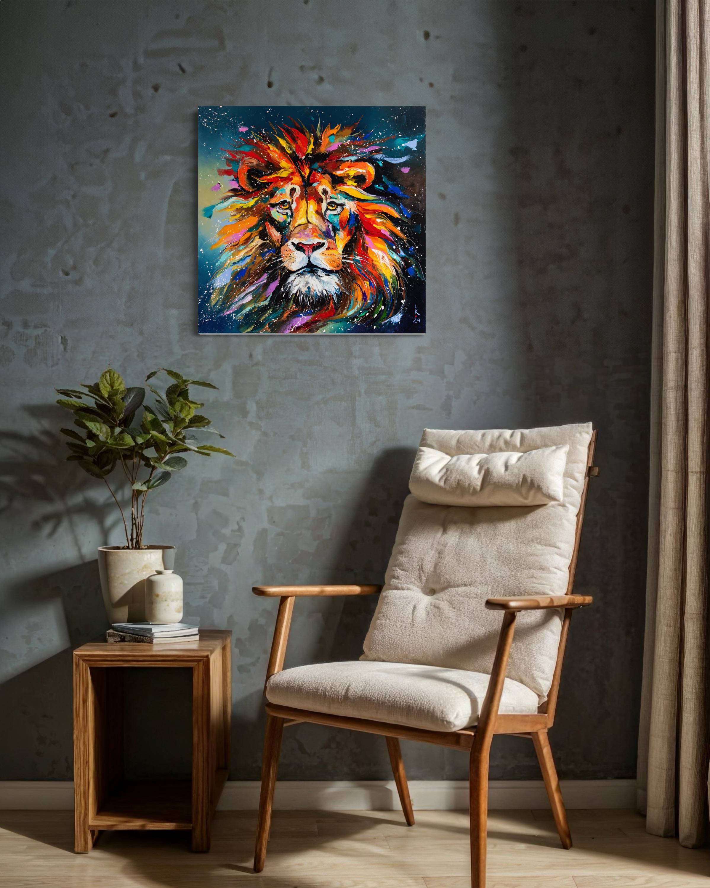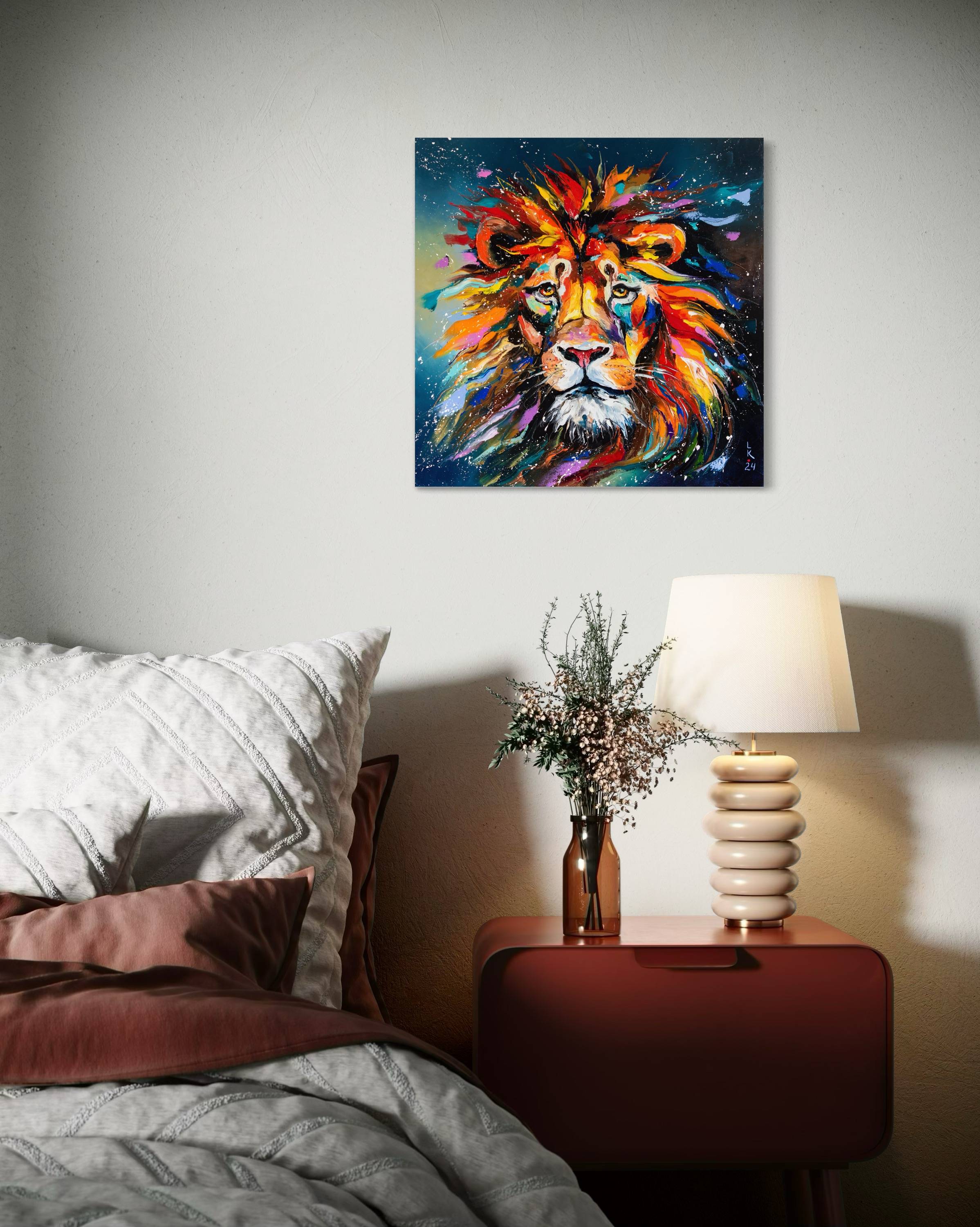 This painting depicts a majestic lion, embodying strength, confidence, and natural beauty. His mane bursts with vibrant colors, symbolizing the energy hidden within each of us. This artwork is full of motion and life, with every brushstroke adding dynamism and emotional depth to the image.
