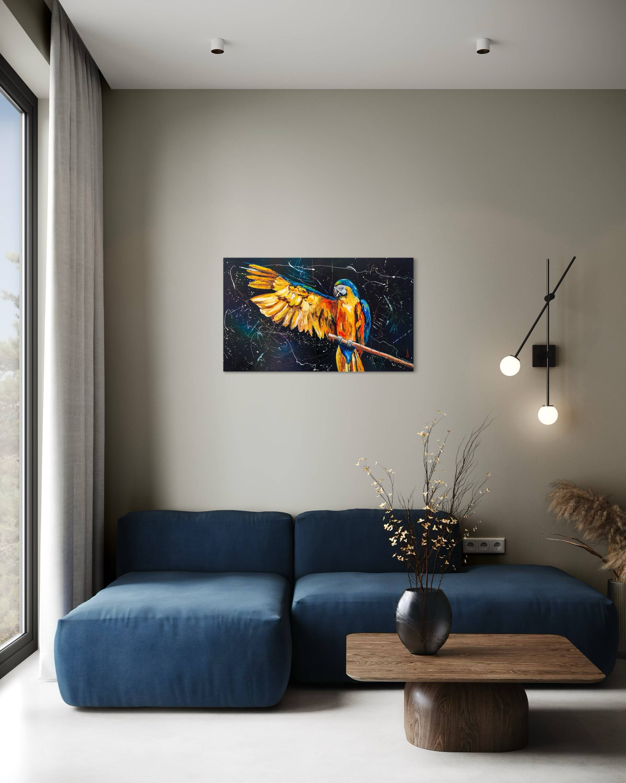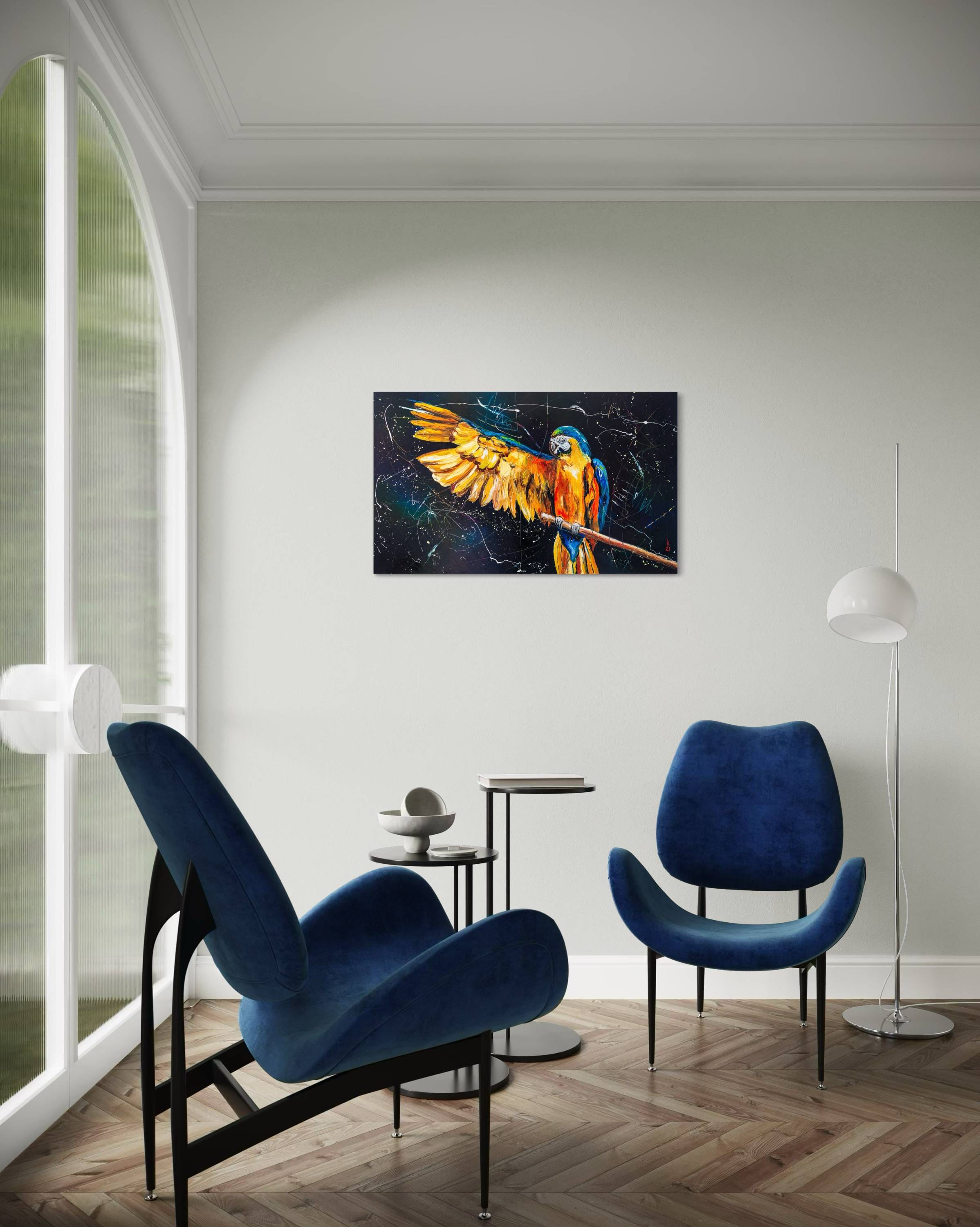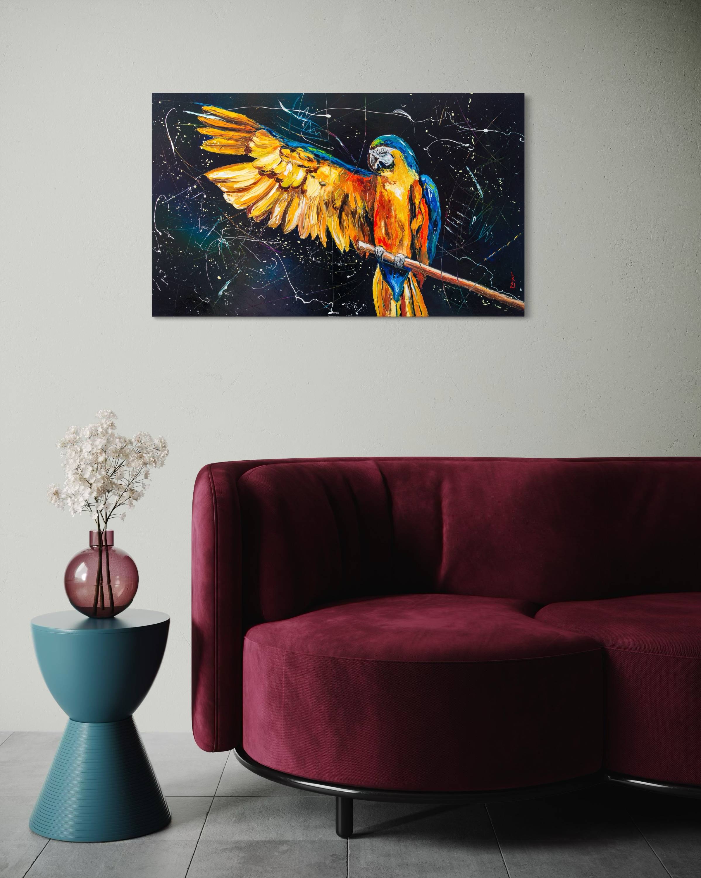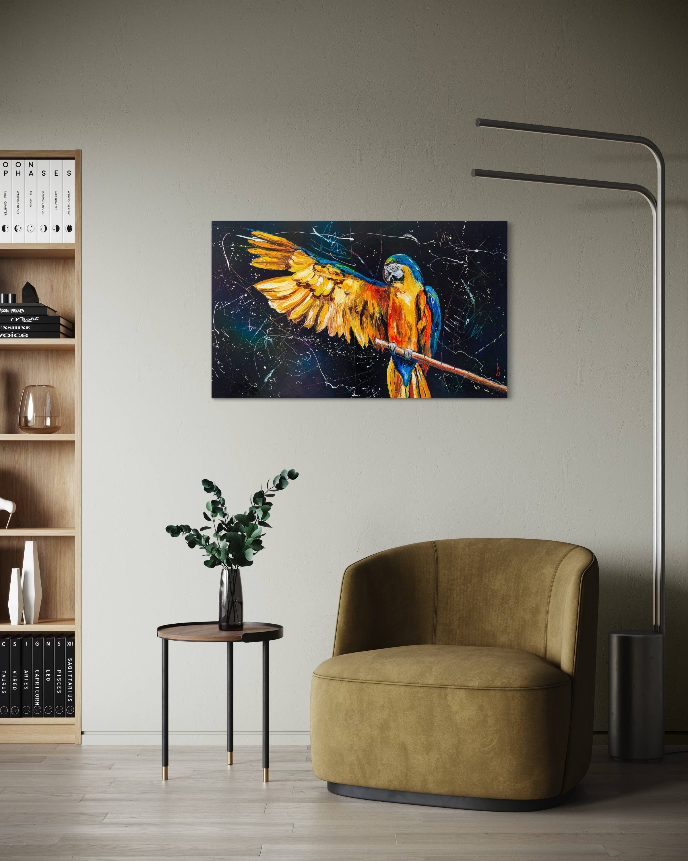 The dramatic dark background is sprinkled with abstract splashes and cosmic energy, adding a sense of depth and freedom. It feels as if the parrot is not just in a tropical setting, but in its own universe — a space where it reigns with colour and charisma.
