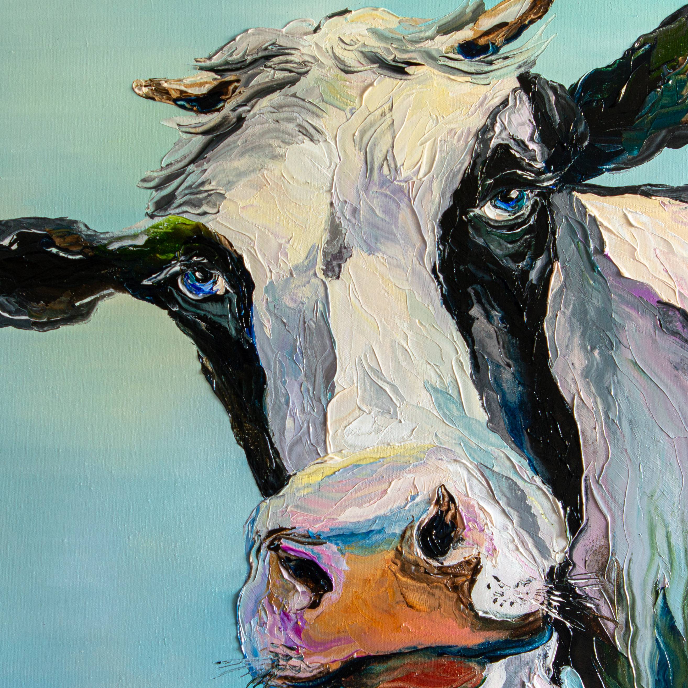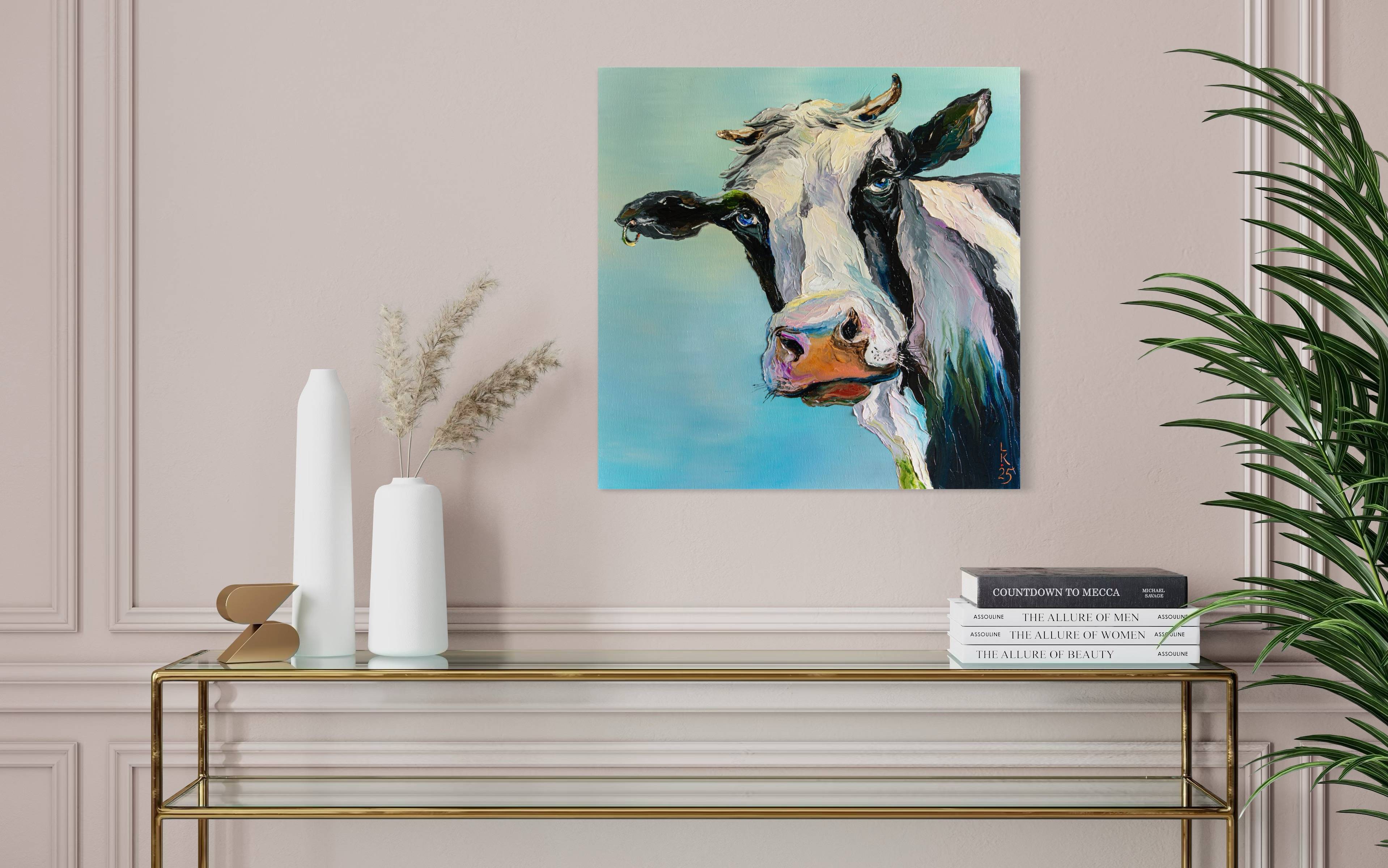 In this expressive portrait, I wanted to capture the gentle yet curious nature of a cow. The vivid blue eyes meet the viewer with a quiet charm, while the textured palette-knife strokes give life and character to every detail. The fresh color palette and playful composition turn this work into a joyful and modern take on a classic countryside subject. This unique original painting is created to bring warmth and personality to any space, becoming a true centerpiece of your interior.