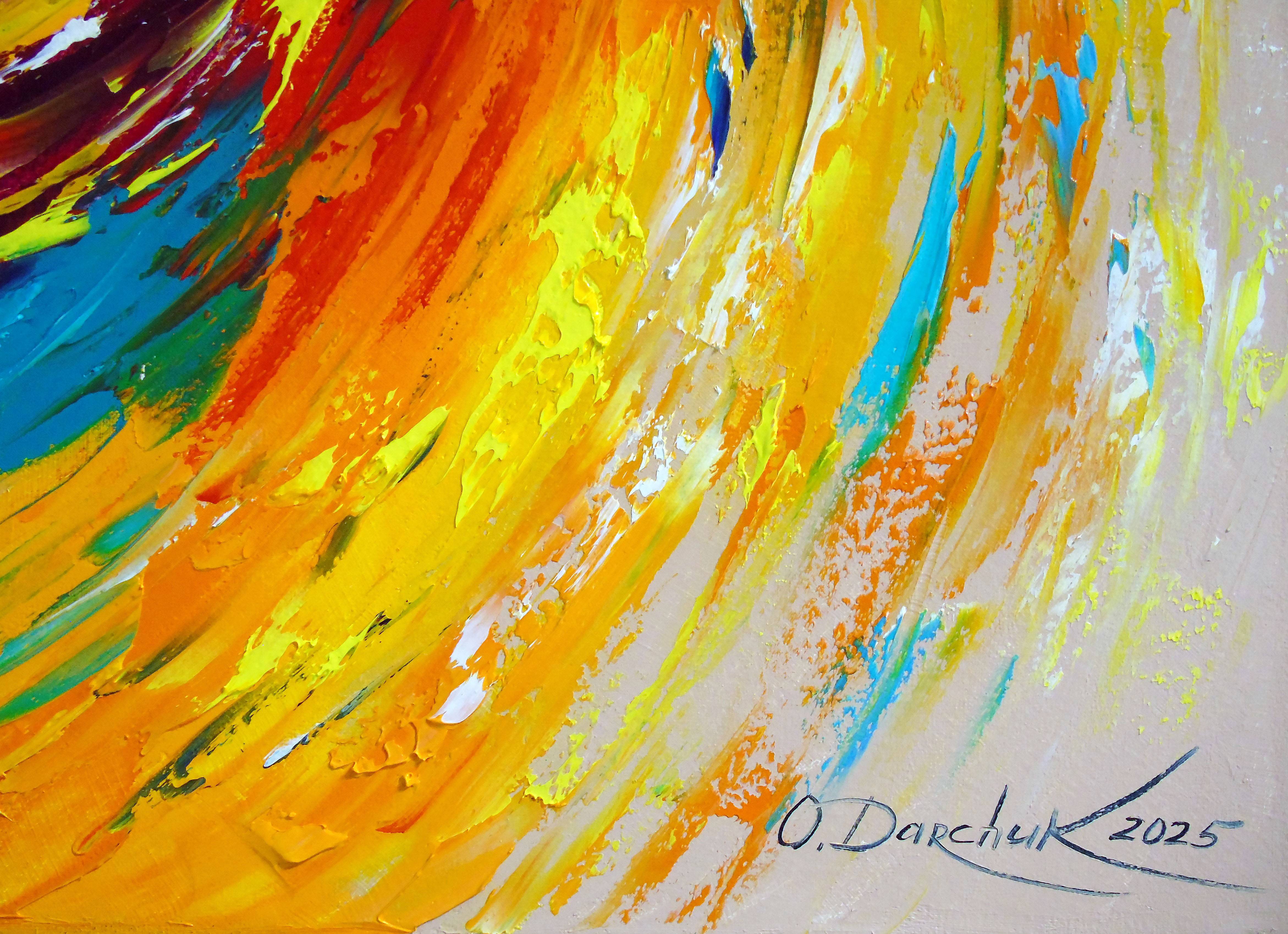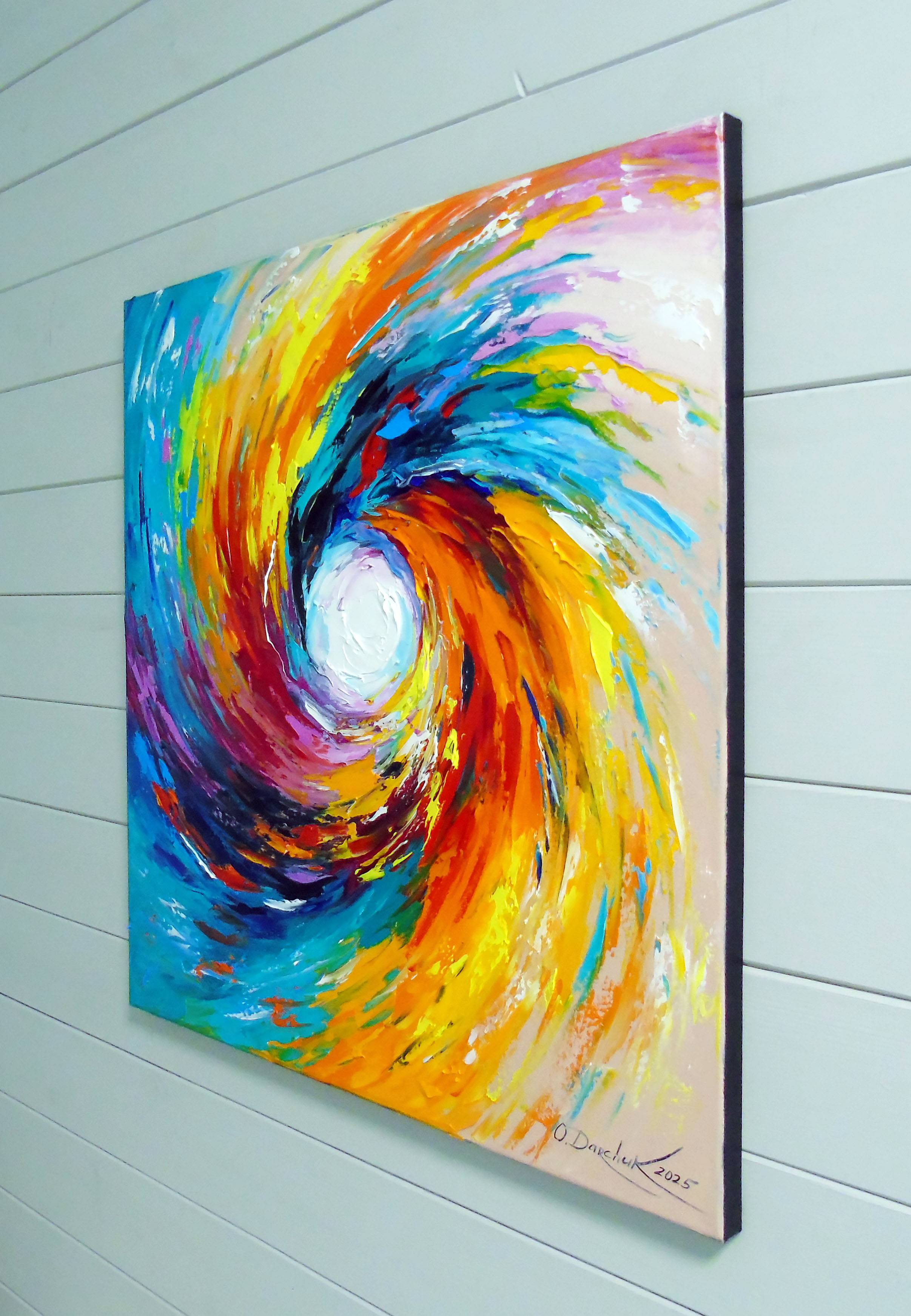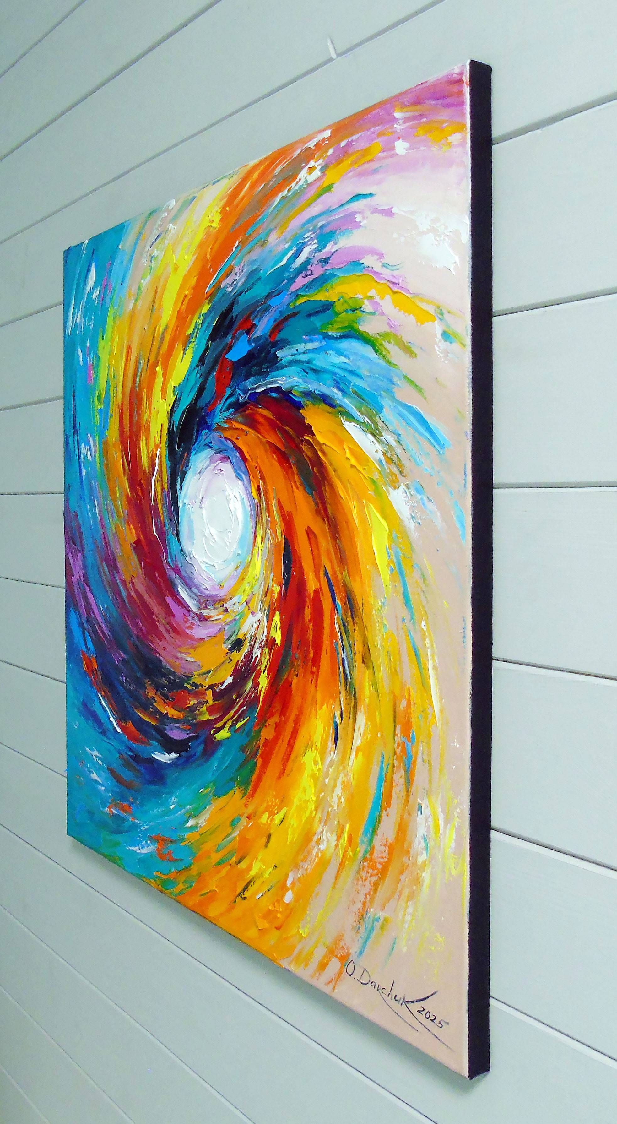 Energy of the Universe, a 100% handmade oil painting on canvas with high-quality oil on canvas, painted sides, perfect for interior decoration or as a gift. It will decorate your home and bring joy to you and your loved ones for a long time. Ready to hang. Dynamic swirls of color blend seamlessly across the canvas, creating an intense sense of motion. The mix of blues, reds, and yellows catches the eye with a striking visual impact.
