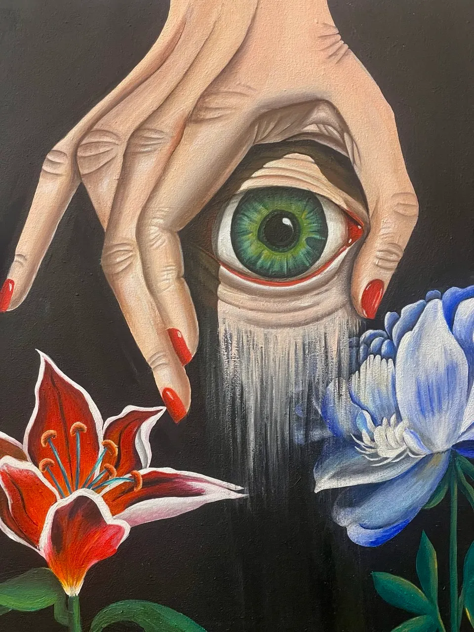 A hand holds an eye between blooming flowers — a reminder that beauty fades when overlooked, and that to truly see is an act of attention, not habit.