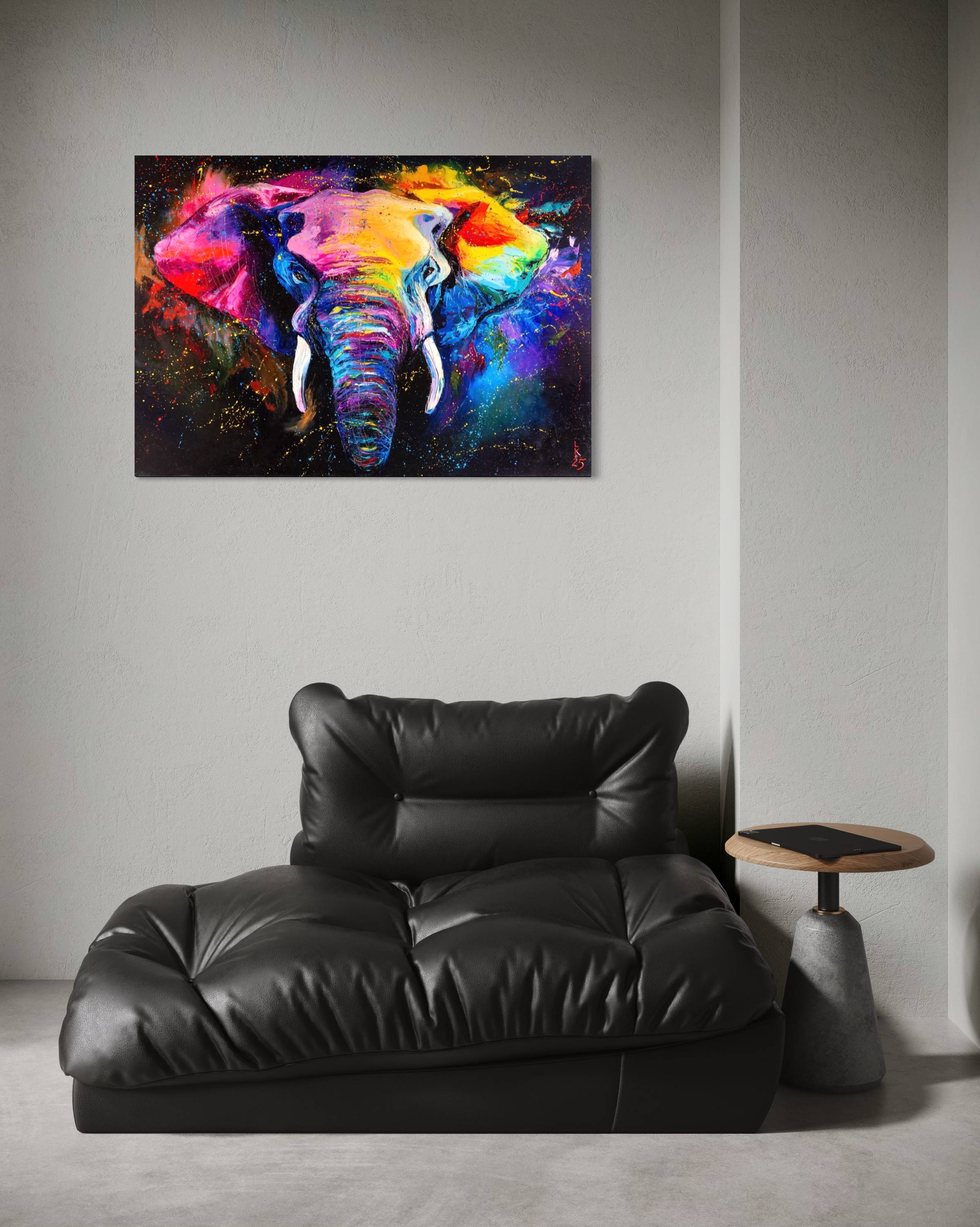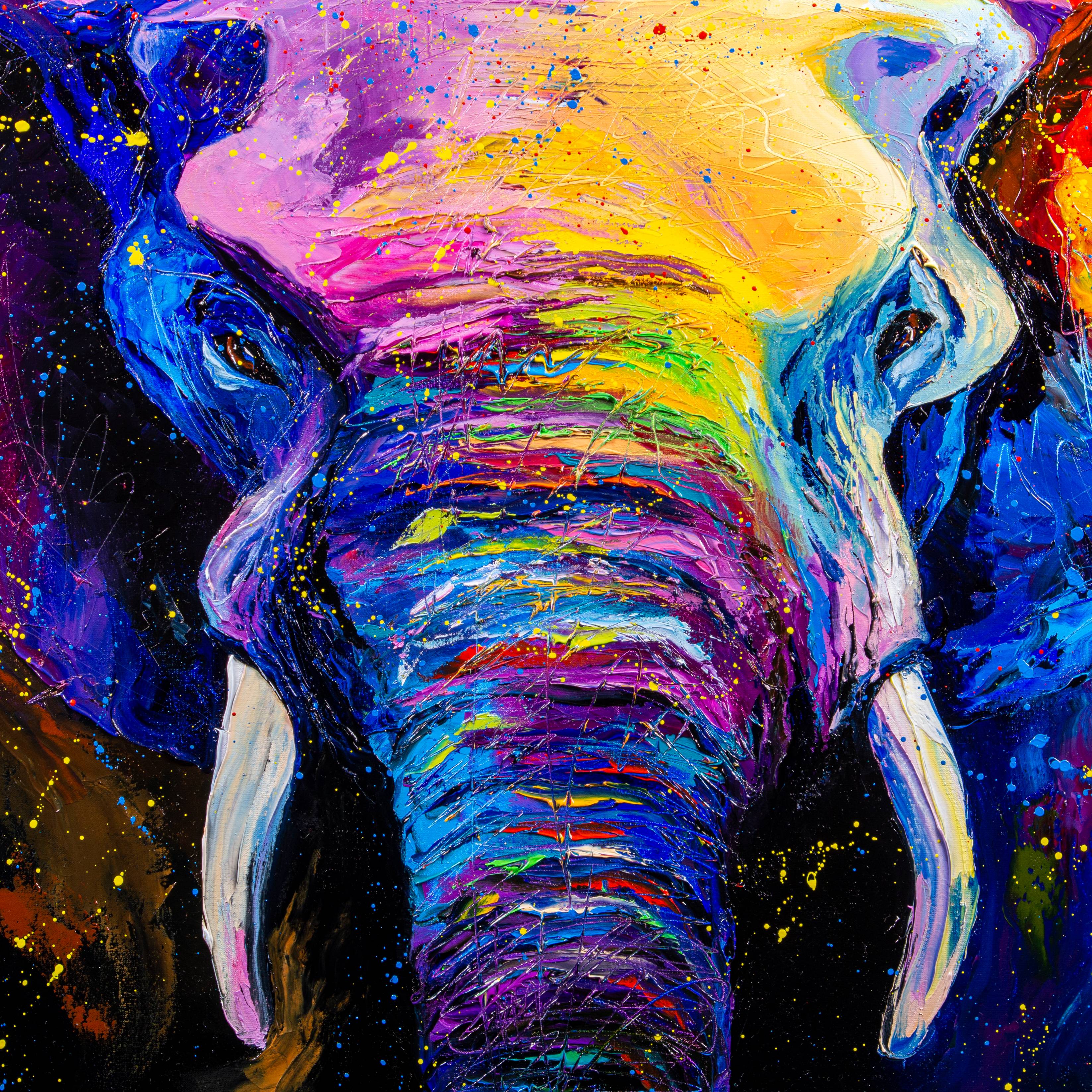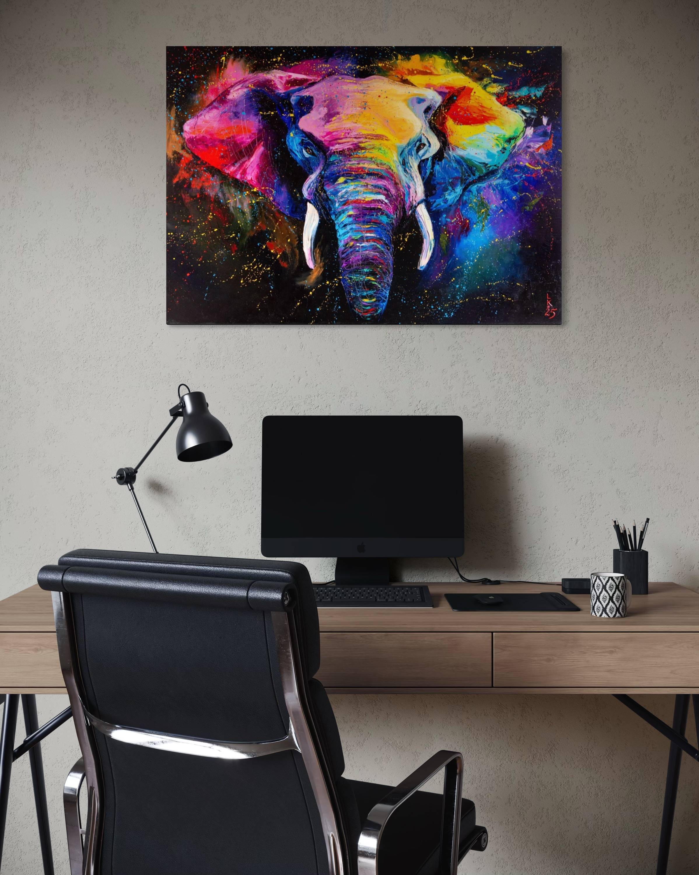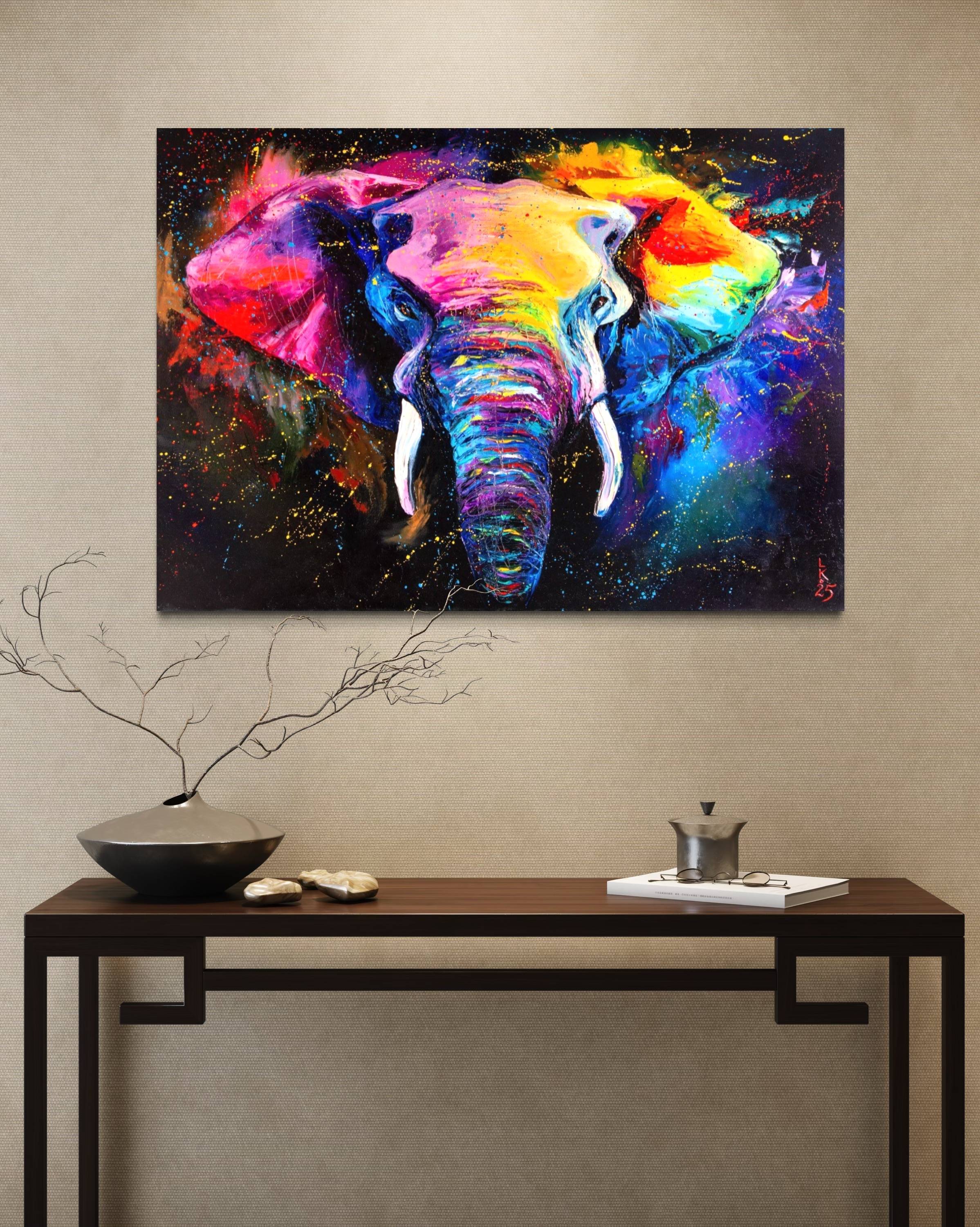 Painted with oils on canvas, this artwork uses expressive strokes to bring the animal to life. The vibrant colors create a visually stunning piece, perfect for adding a touch of the exotic to any room. The colorful elephant becomes a symbol of the radiant, fearless, and full-of-life spirit within us all.