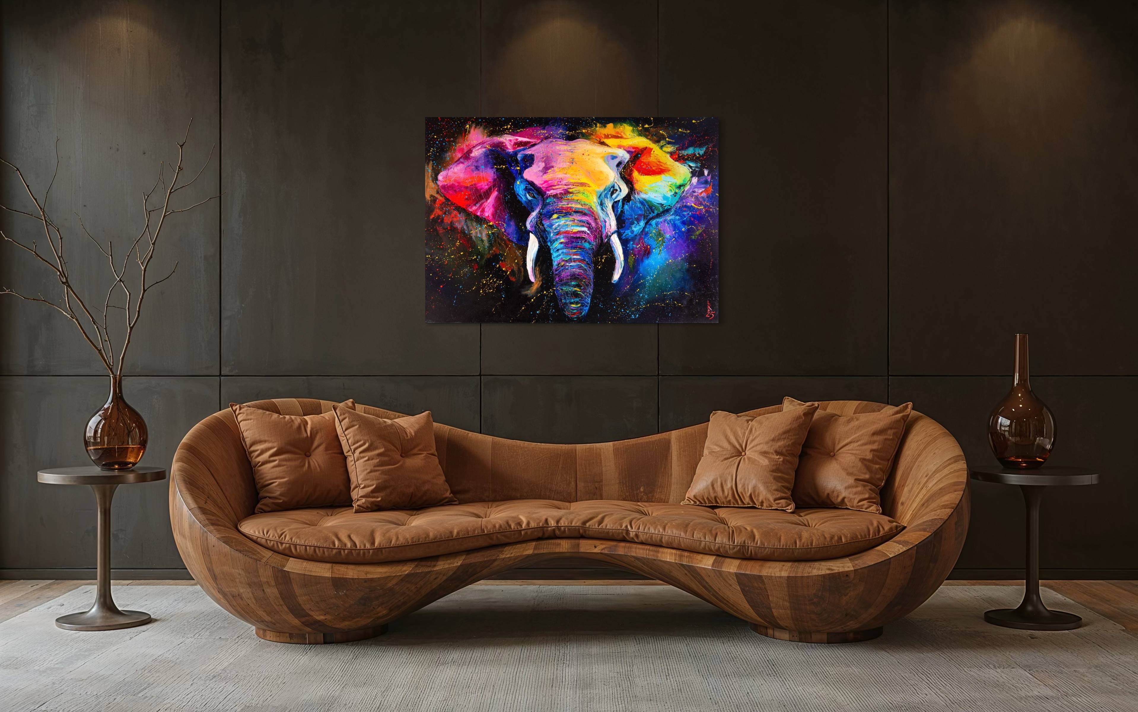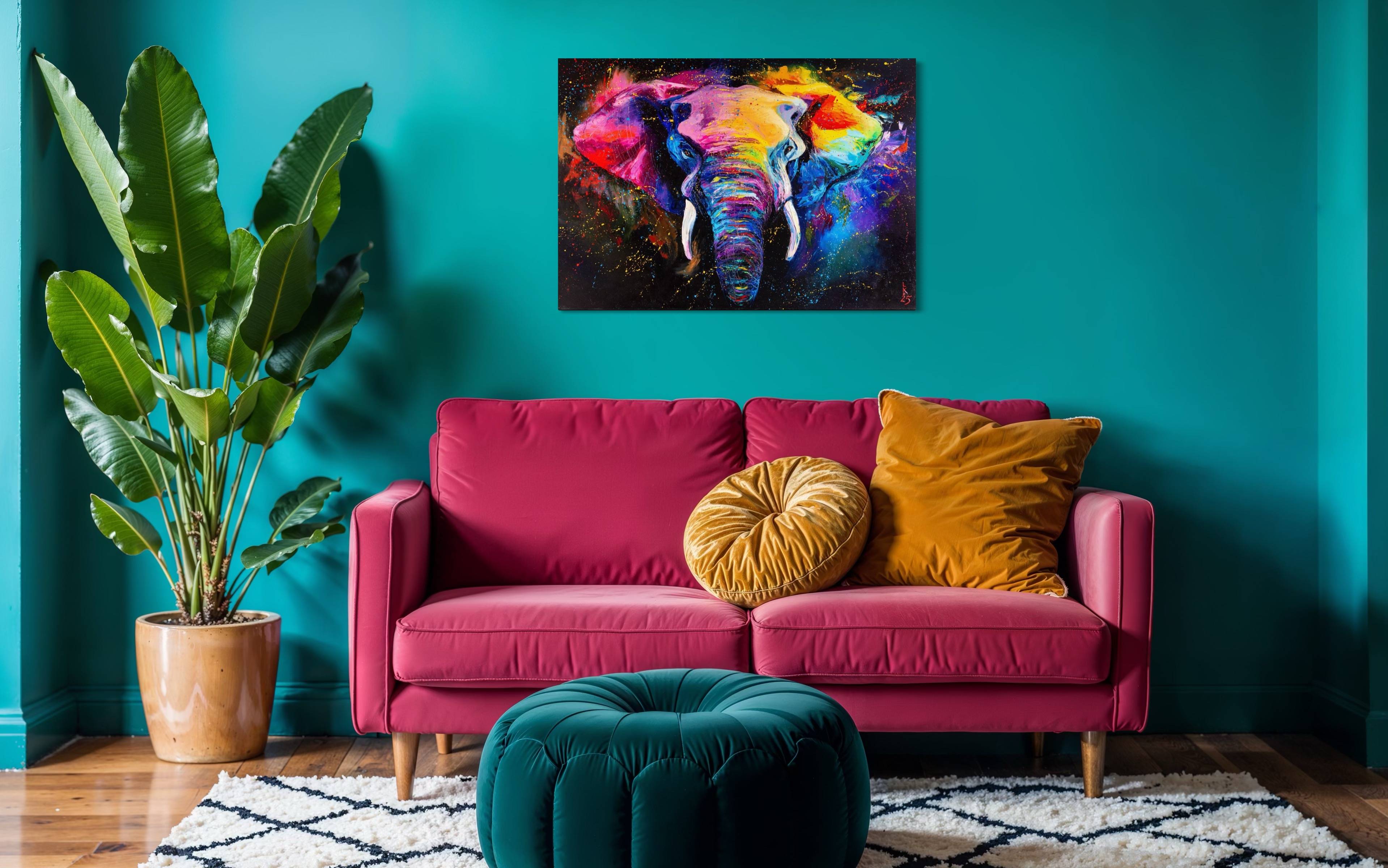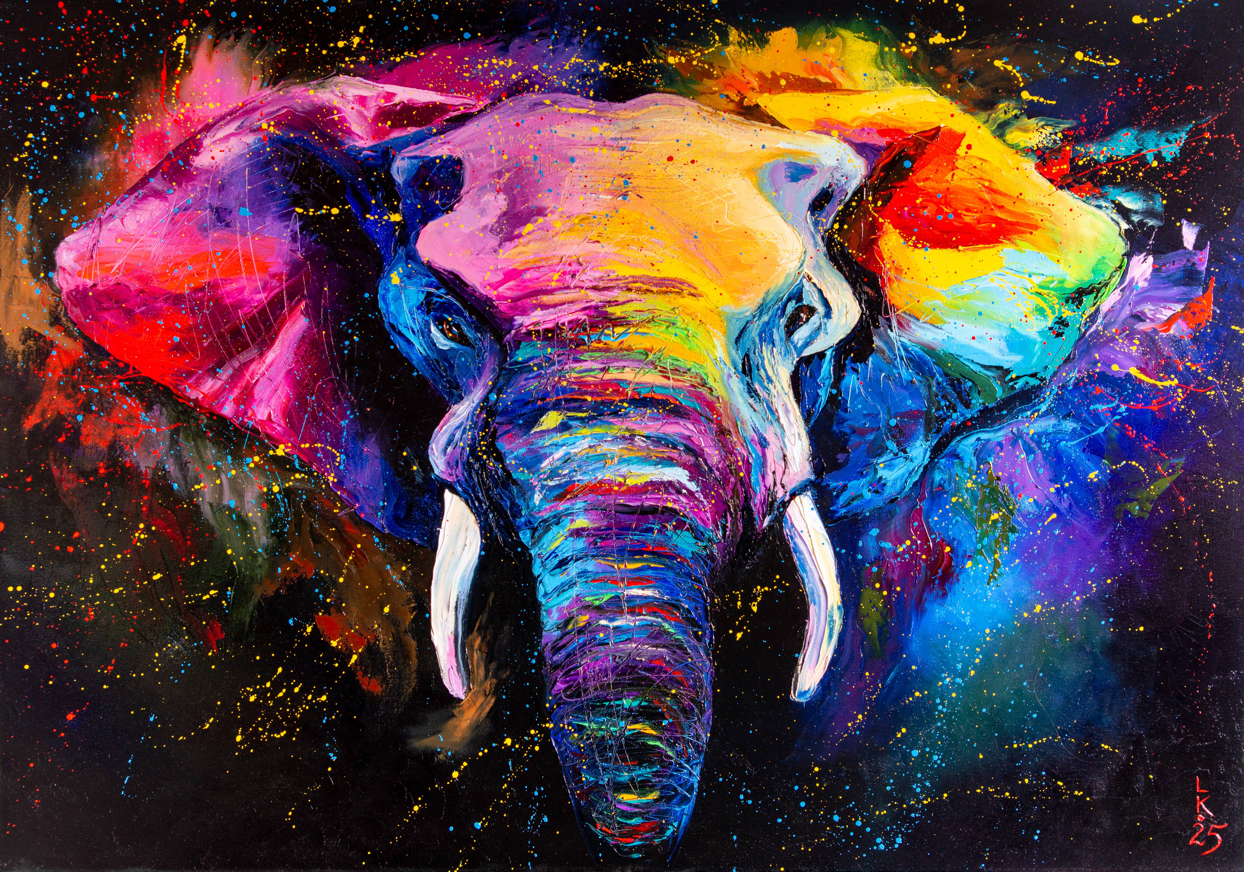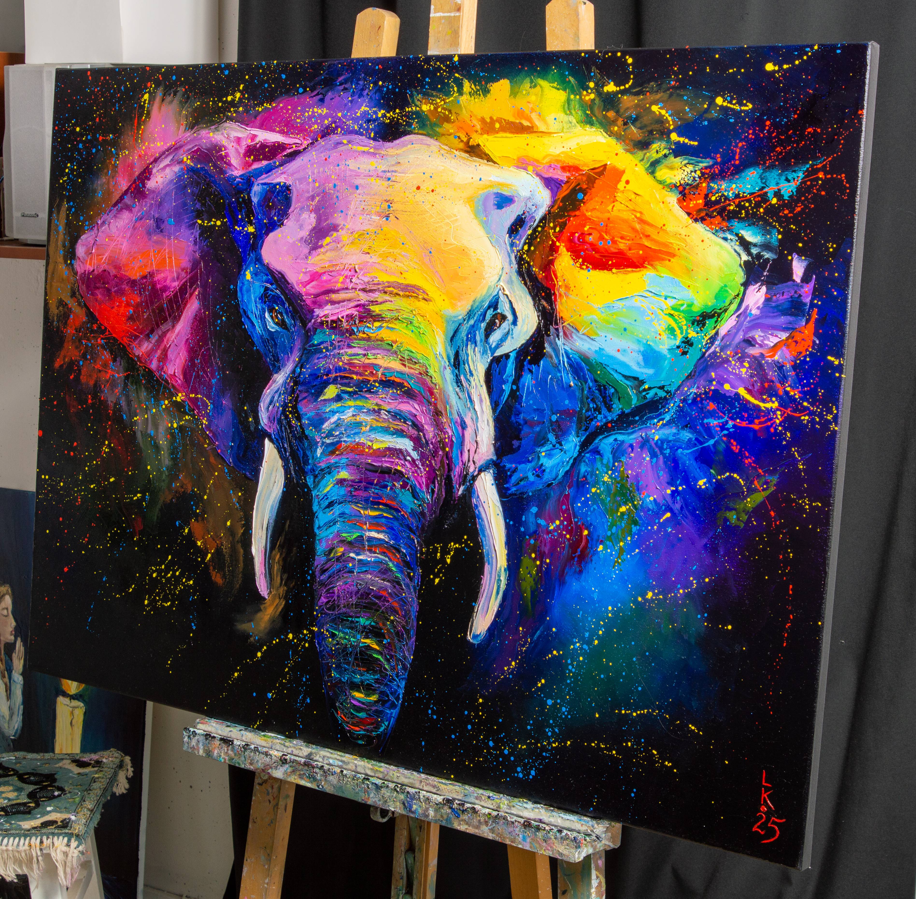 Painted with oils on canvas, this artwork uses expressive strokes to bring the animal to life. The vibrant colors create a visually stunning piece, perfect for adding a touch of the exotic to any room. The colorful elephant becomes a symbol of the radiant, fearless, and full-of-life spirit within us all.