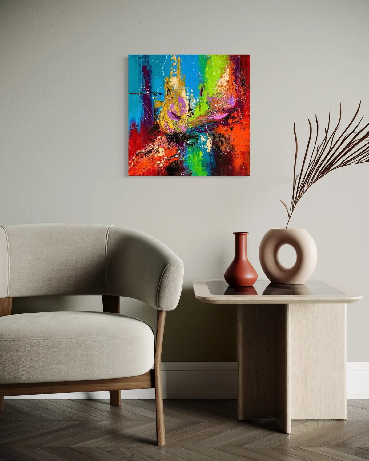 In this work, I let pure emotion guide every movement of the palette knife. “Symphony of Color” is an explosion of energy where bright tones and dynamic textures merge into a single vibrant rhythm. The interplay of red, blue, green, and yellow creates a sense of harmony within chaos — a reminder that beauty often arises from spontaneity.