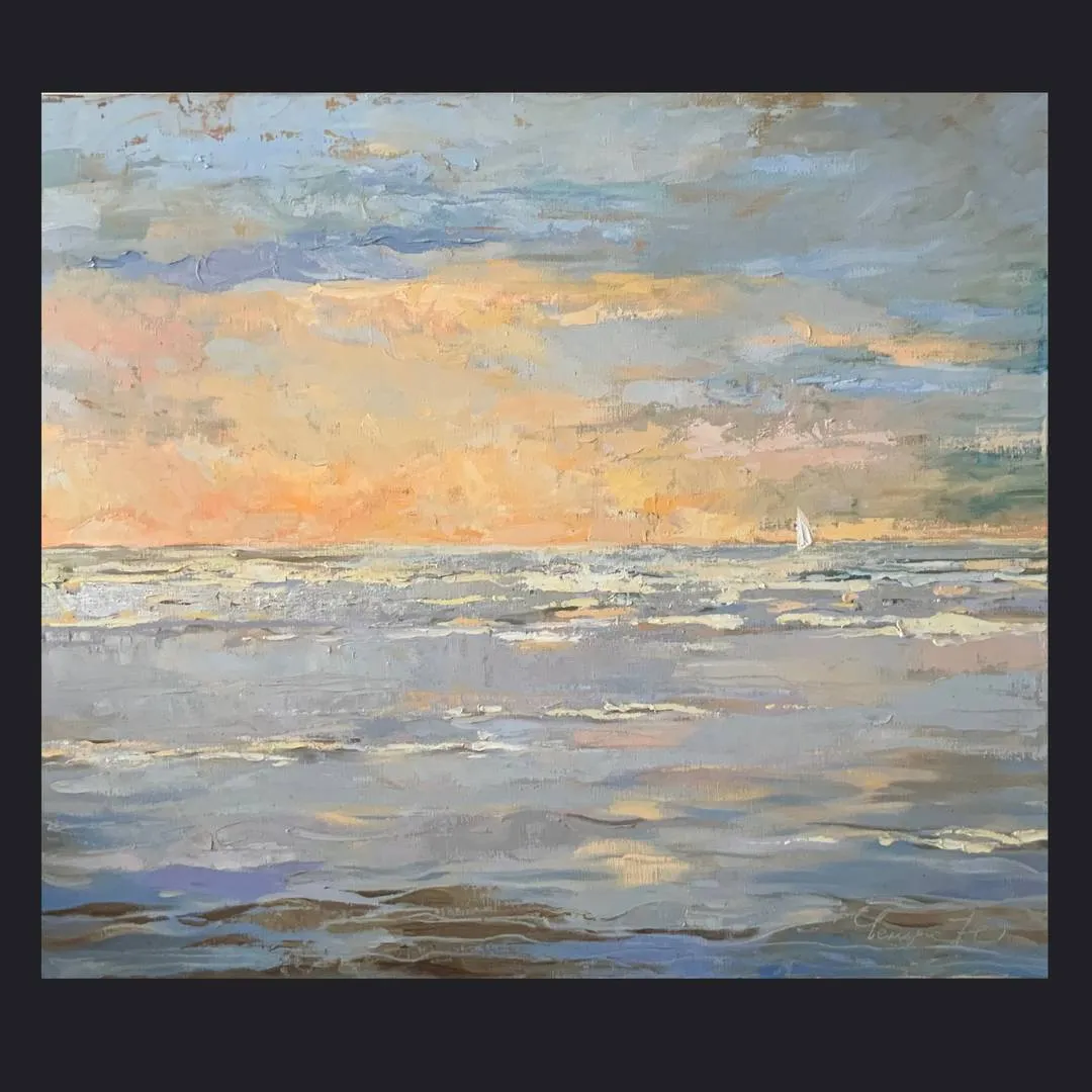 Sunset on the sea. Light and color are the main theme of the plot. To convey the changing mood and mysticism, the silver patali technique is used in the painting.