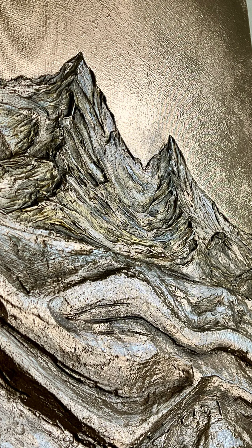 Texture art where mountains meet their reflection in layered, tactile waves. The monochromatic gold palette creates a serene atmosphere, while heavy impasto technique brings dramatic dimension to life.