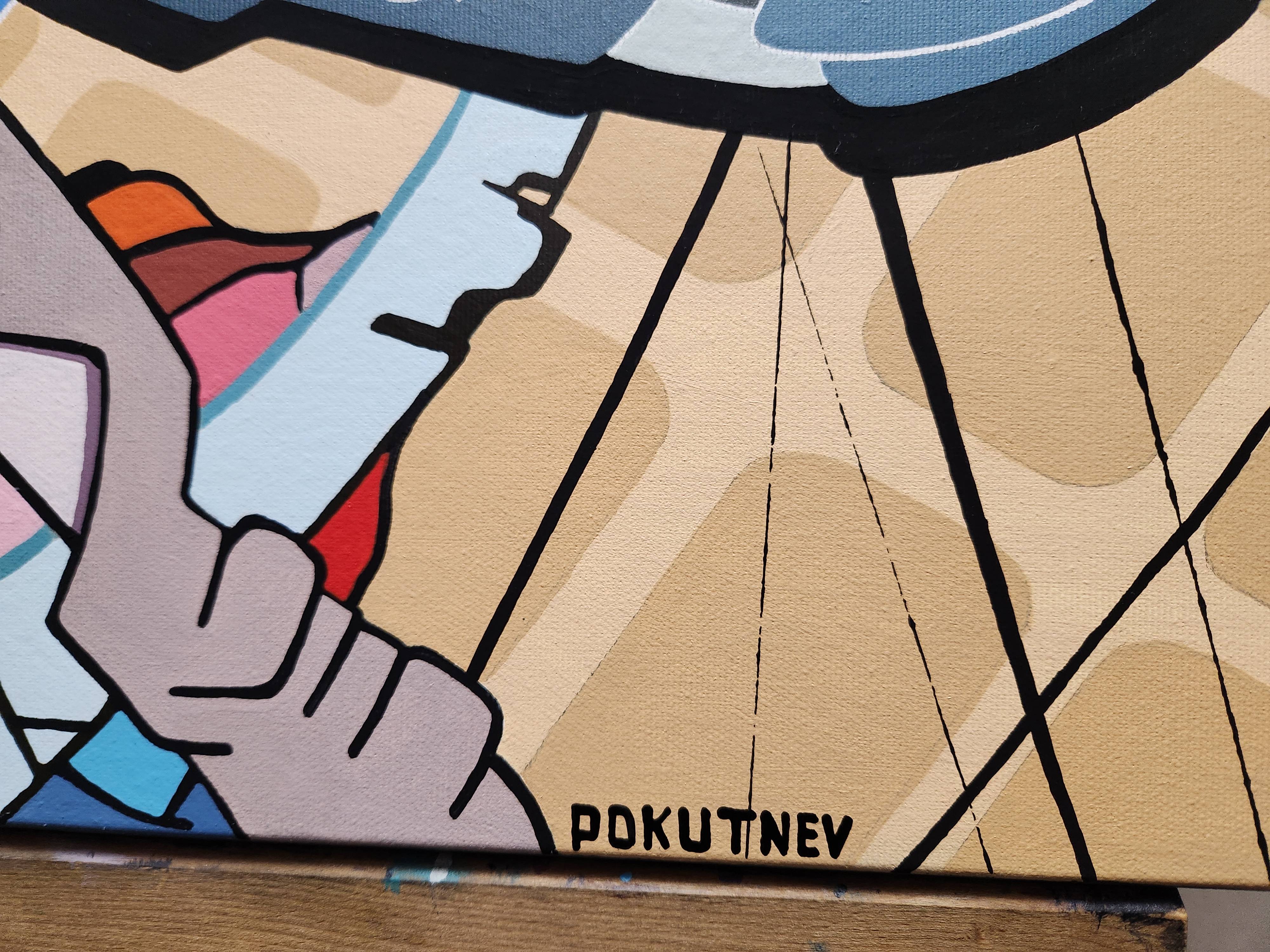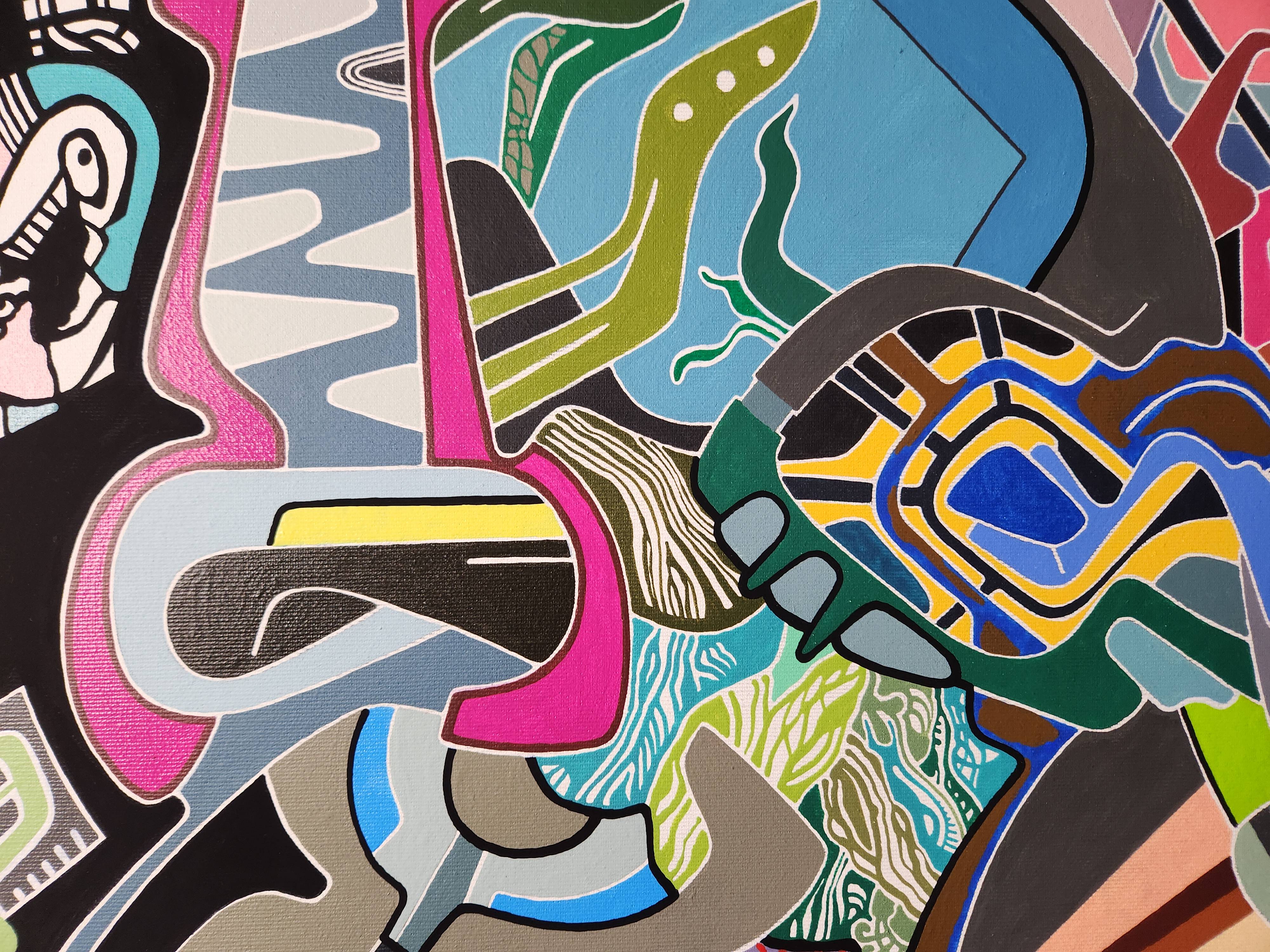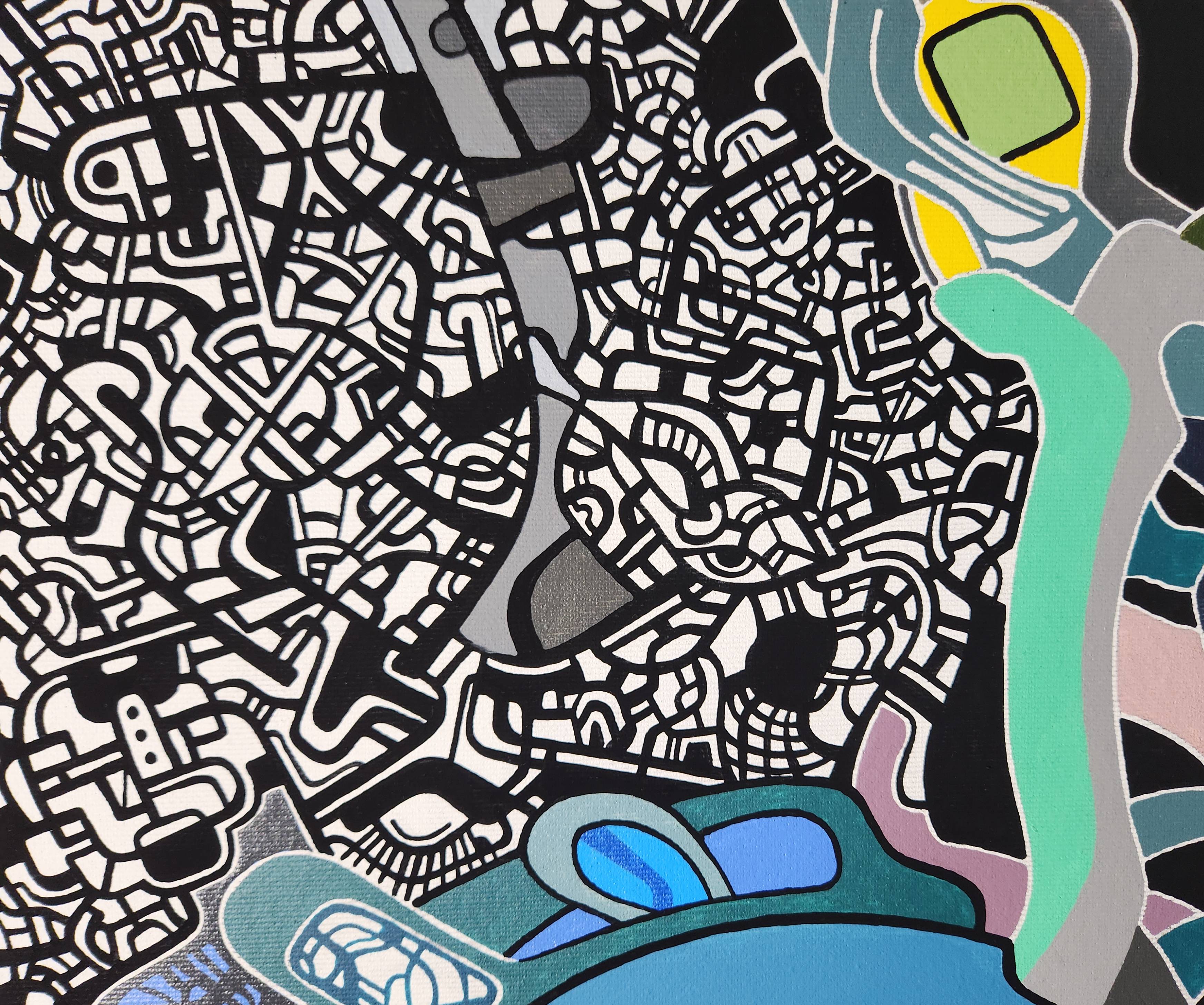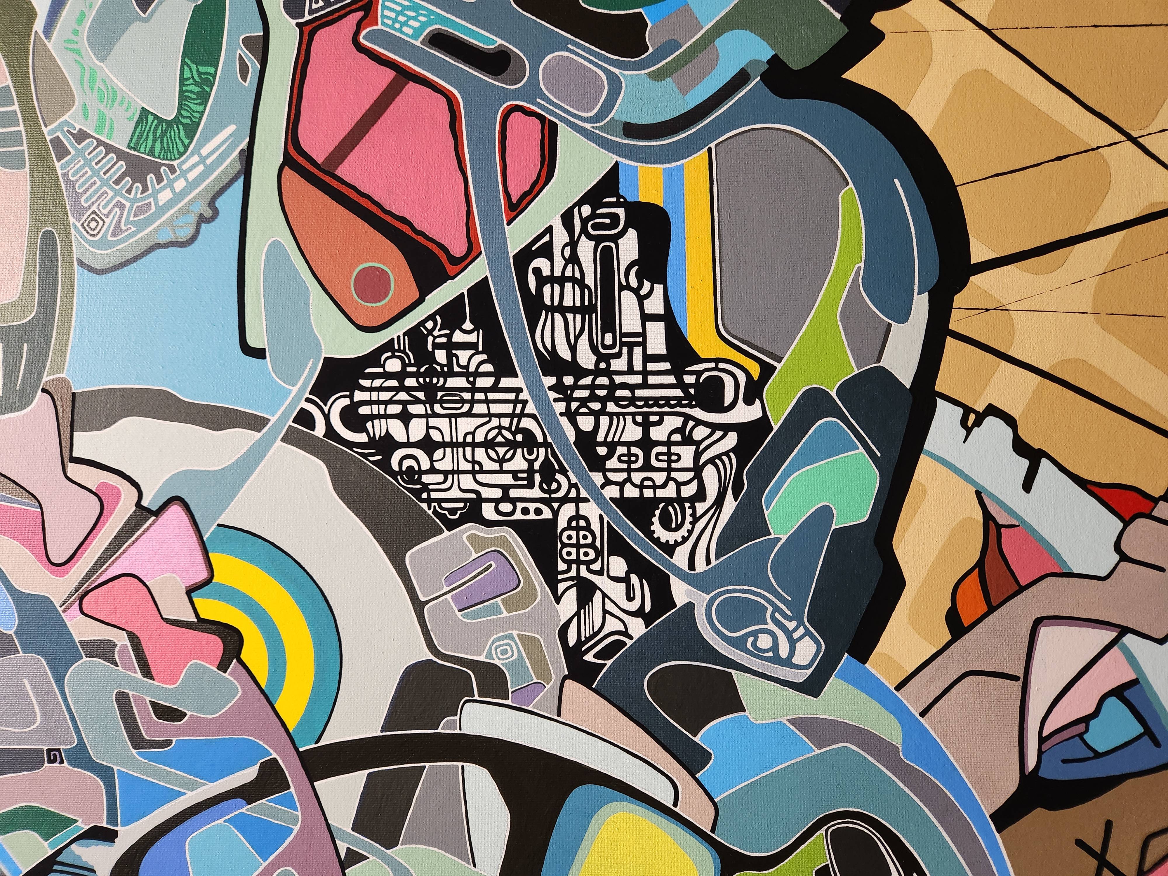 The composition presents a complex, multi-layered interweaving of organic and mechanical forms, vibrant color blocks, and monochrome digital patterns. It is a metaphor for the mind working at its limit: here, emotions (bright, fluid shapes) collide with logic and anxiety (rigid lines and fragmented graphics). The title invites the viewer to immerse themselves in this visual vortex and to trust the feeling of uncertainty as a driving force for cognition.