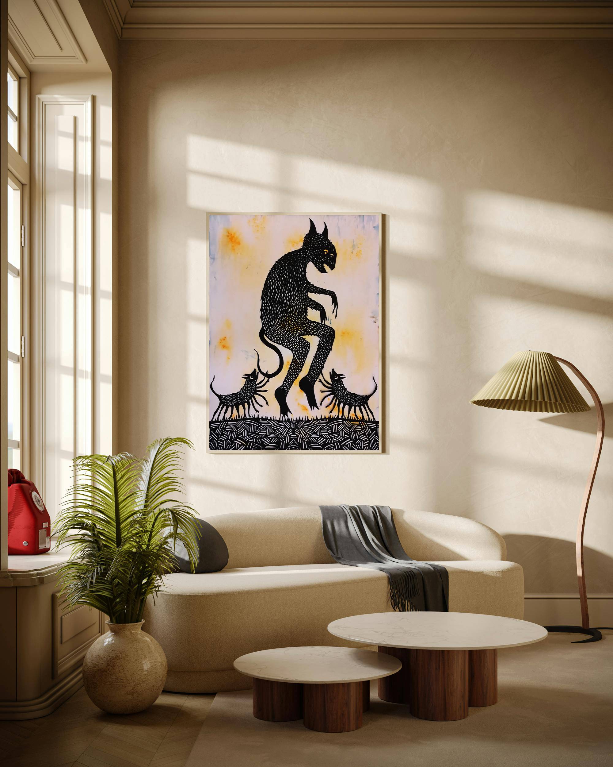 This papercut is inspired by the Slavic myth about the birth of evil forces. Drops fall from the fingers of a deity who has dipped his hand in living water, and from these drops dark creatures emerge—the future spirits of the dark forces. In Slavic tradition, the devil is one of the oldest demonic characters, the son of Chernobog and Mari, a representative of evil, but not omnipotent, subject to the laws of the universe. His story is a myth about the violation of balance, about the temptation to create life against the will of the gods.