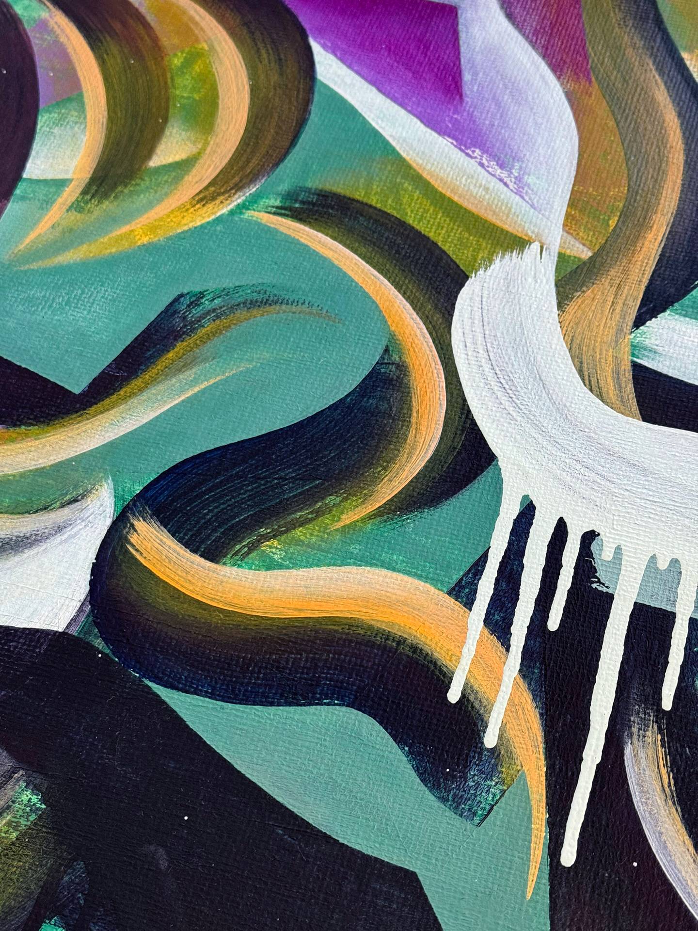 This painting is inspired by the daily processes of existence, where life and death continually intertwine. The coils of our development resemble a peculiar flower: they are non-linear, vibrant, and multi-hued. One form is tangent to the next, showcasing moments of sharp, definite boundaries alongside areas of seamless, fluid transition.