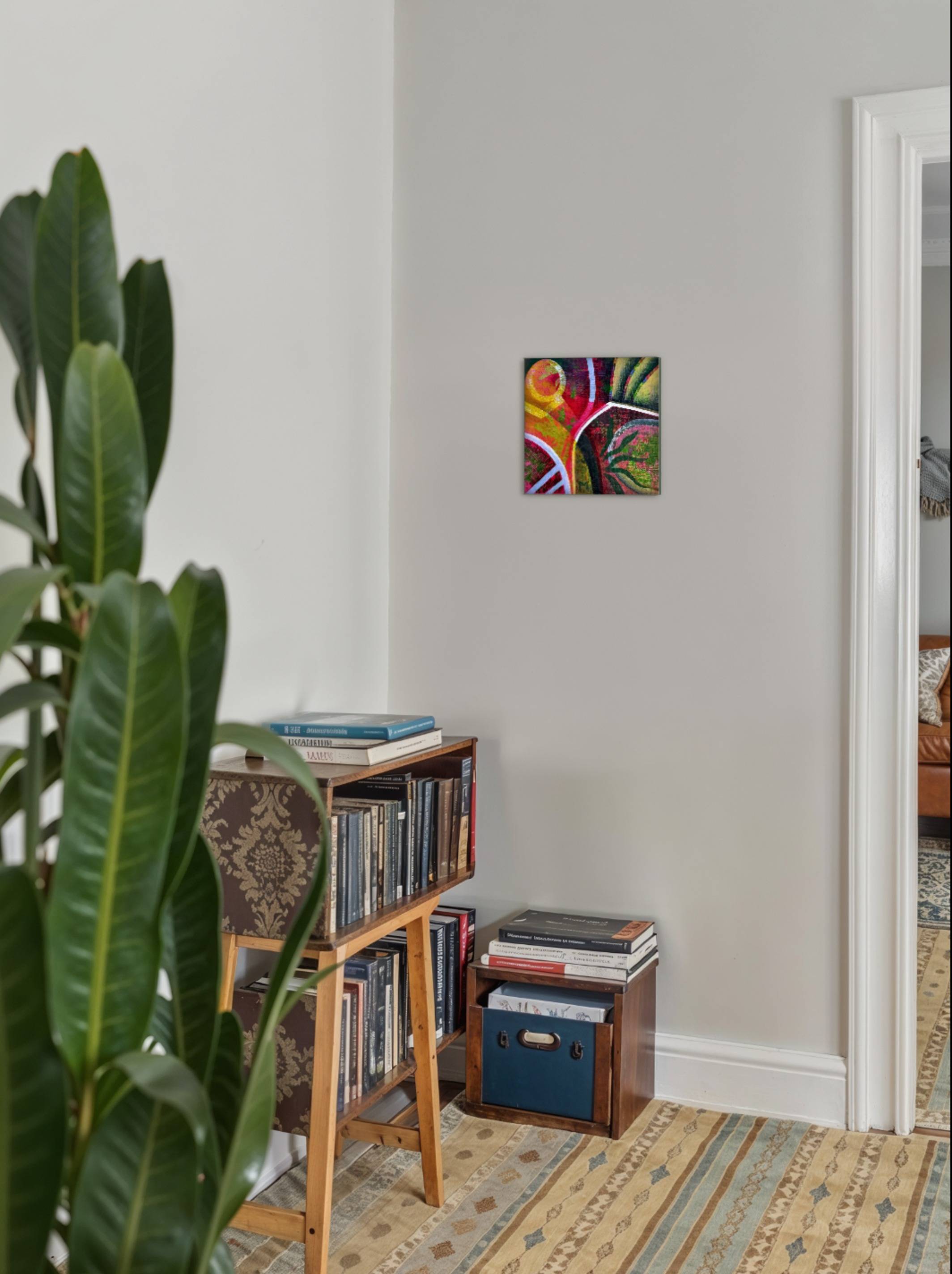 A dramatic small painting exploring concepts of life's forms and their vibrant colors. The piece features compelling and interesting textures.