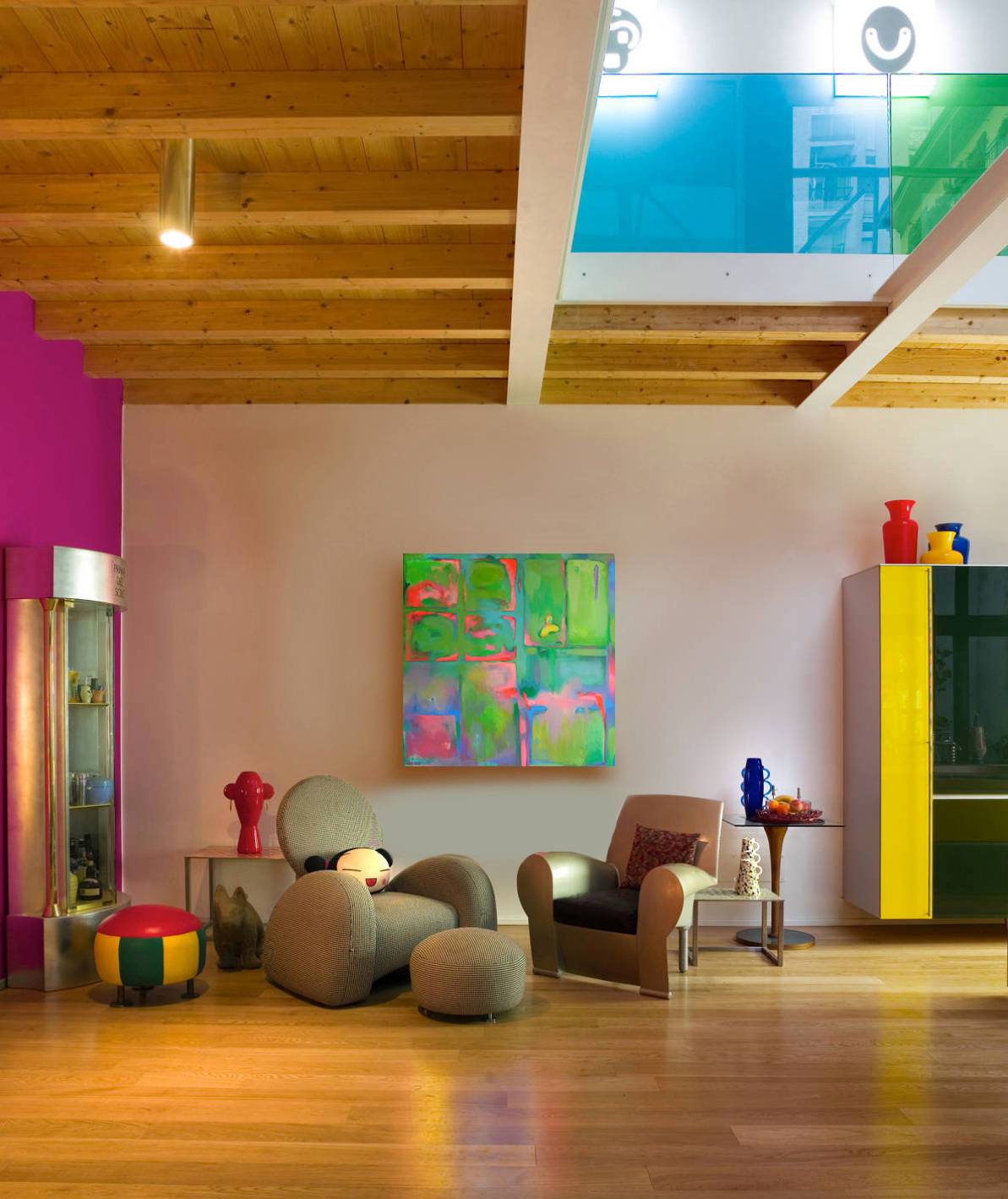 Abstract painting by Alena Kuznetsova (classic abstract period). Super-bright acidic colours that are perfect for even dark spaces. Reminds summer days, boosting your mood and cheering you up.
