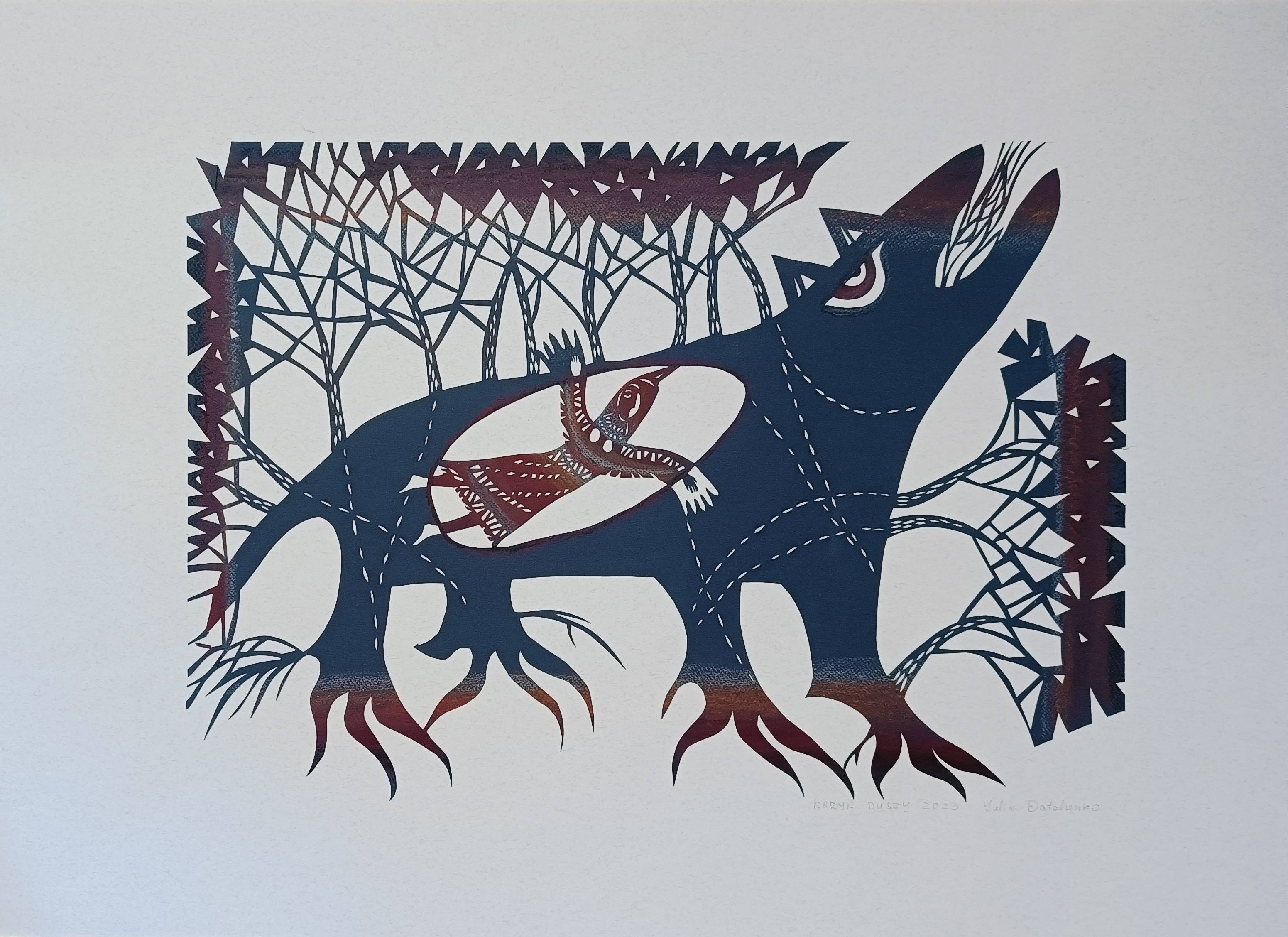 This papercut reflects the idea of unity between nature, instincts, and spirituality—the image of a totemic protector who carries the soul and preserves the vital connection between generations.