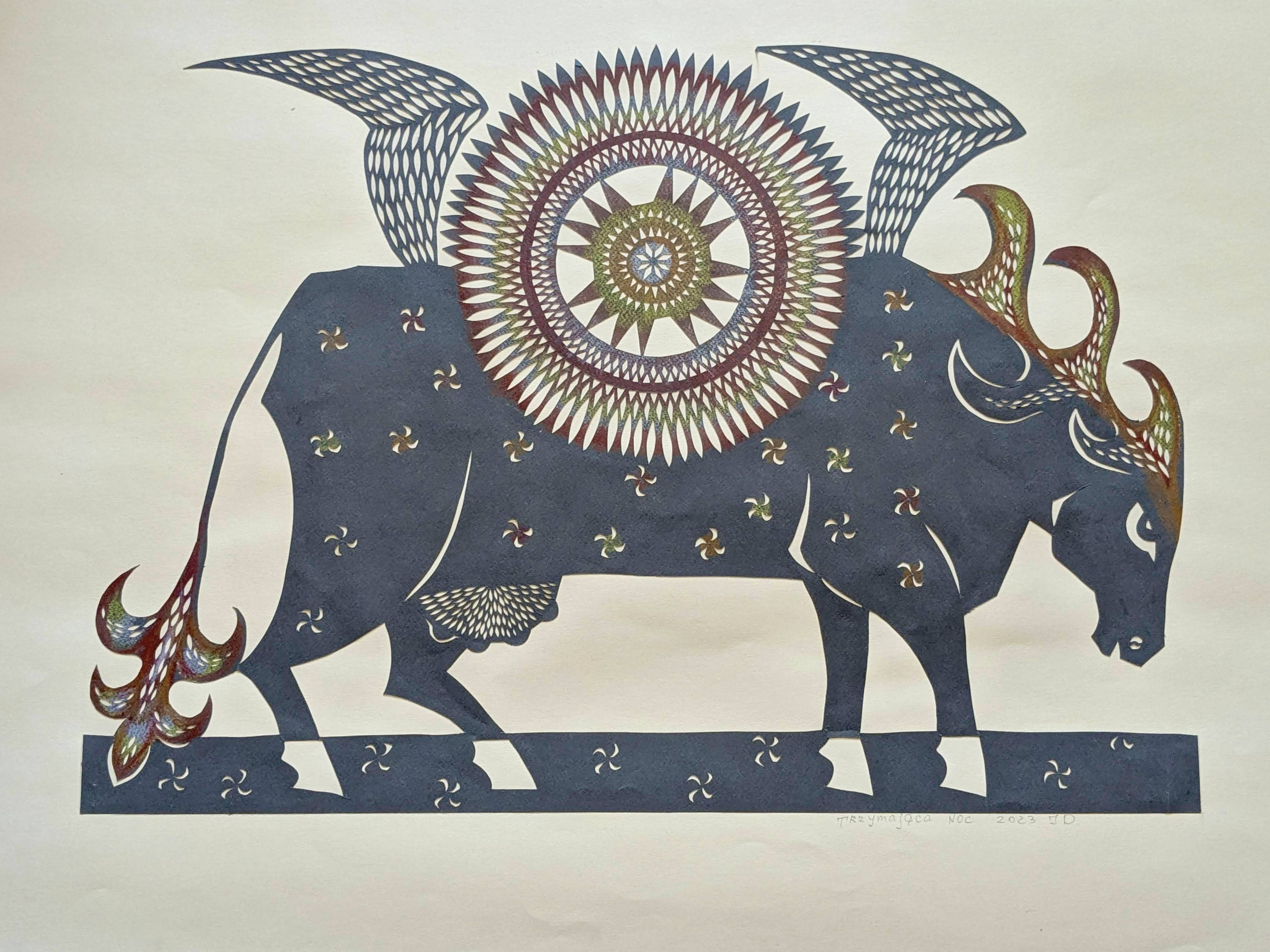 Two papercuts create a single cosmic composition—a pair of creatures that maintain the balance of the world.