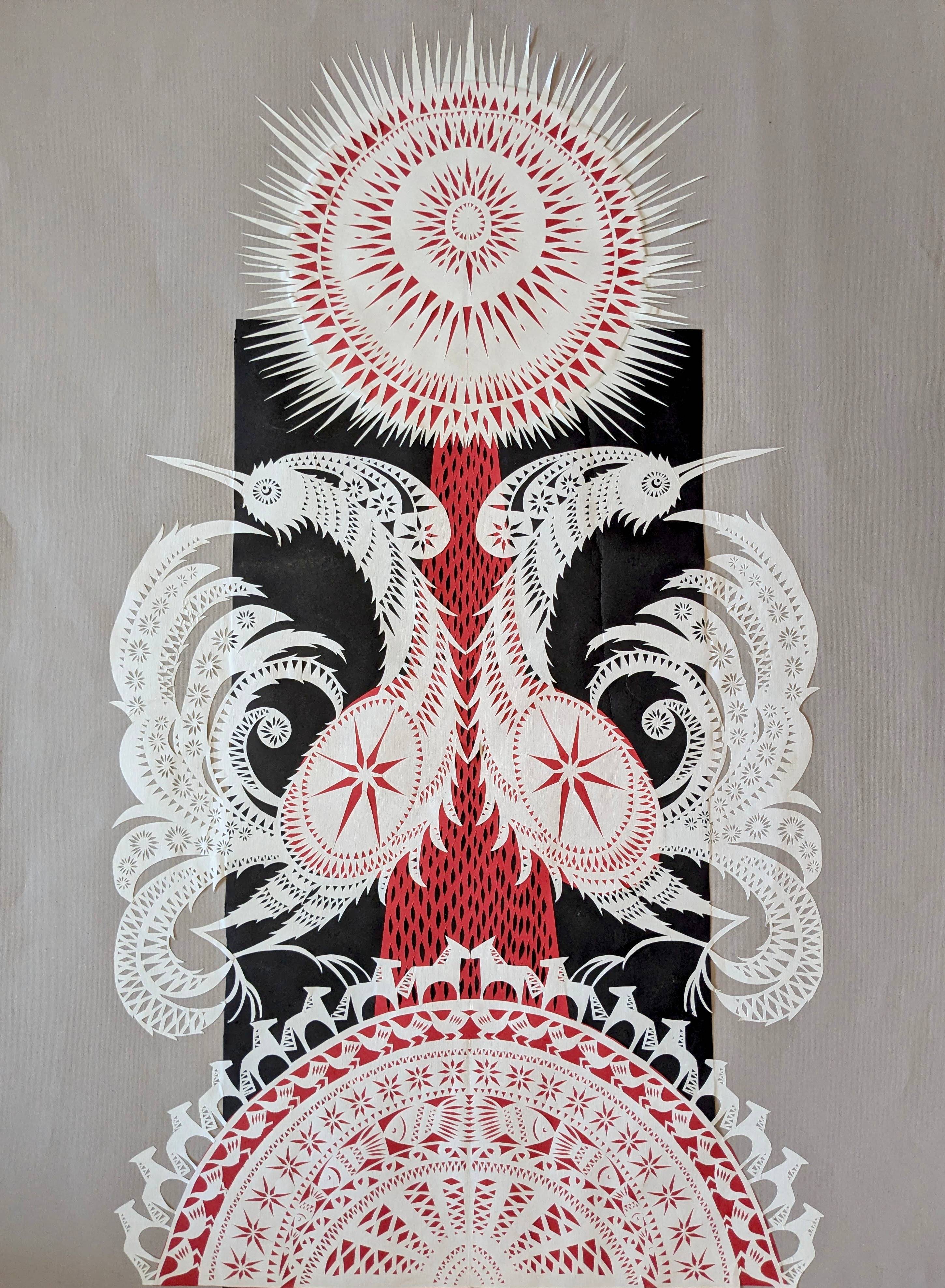 The vytynanka “From the Earth to the Sun” is a Ukrainian image of the universe, in which everything that lives is interconnected: from the depths of the earth to the radiance of the heavens. It symbolizes the path of human life and spiritual growth.