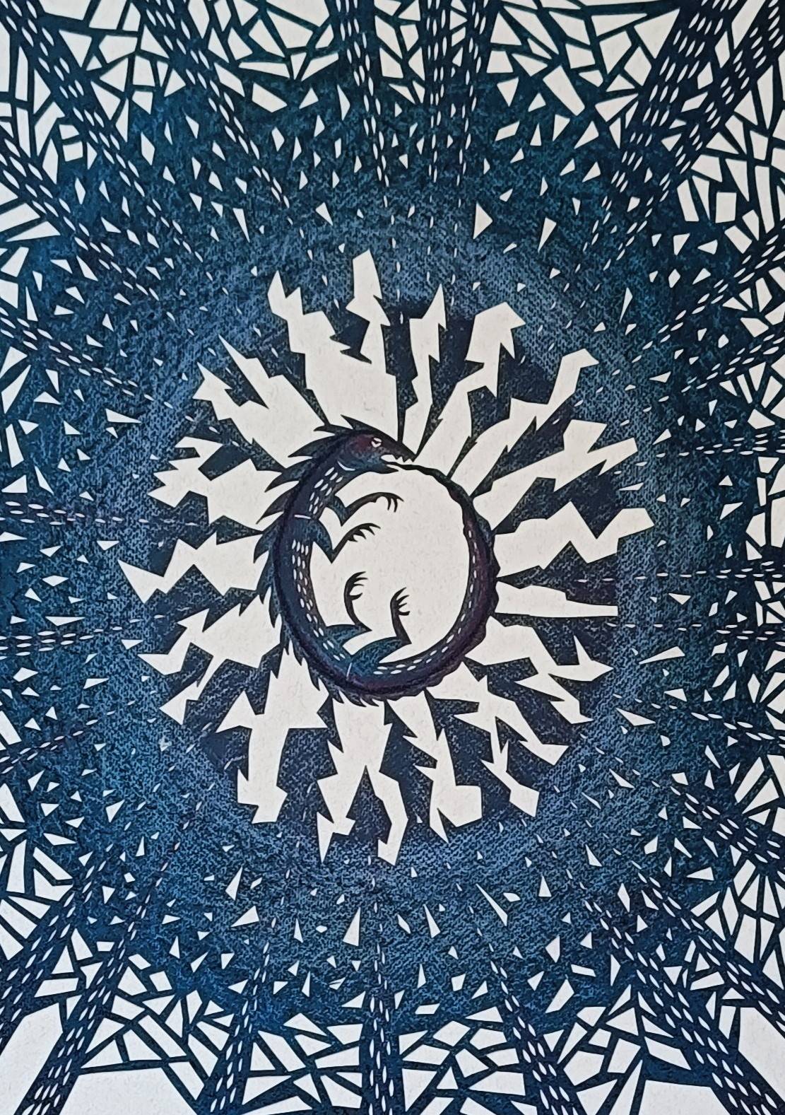 This papercut is a parable about the moment of creation, when the first movement, the first breath emerges from darkness. The snake maintains balance between the past and the future. Ouroboros is one of the oldest symbols of eternity, the continuity of life, and the cycle of birth and death. In the Slavic and Indo-European worldview, this image is associated with the guardian of world order, who embraces the earth so that the world does not fall apart. Here, he is both the Beginning and the End, the moment when everything is still indivisible.