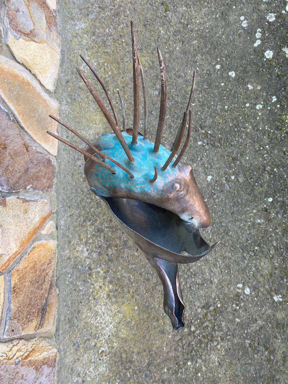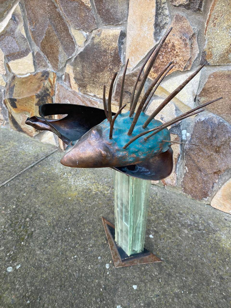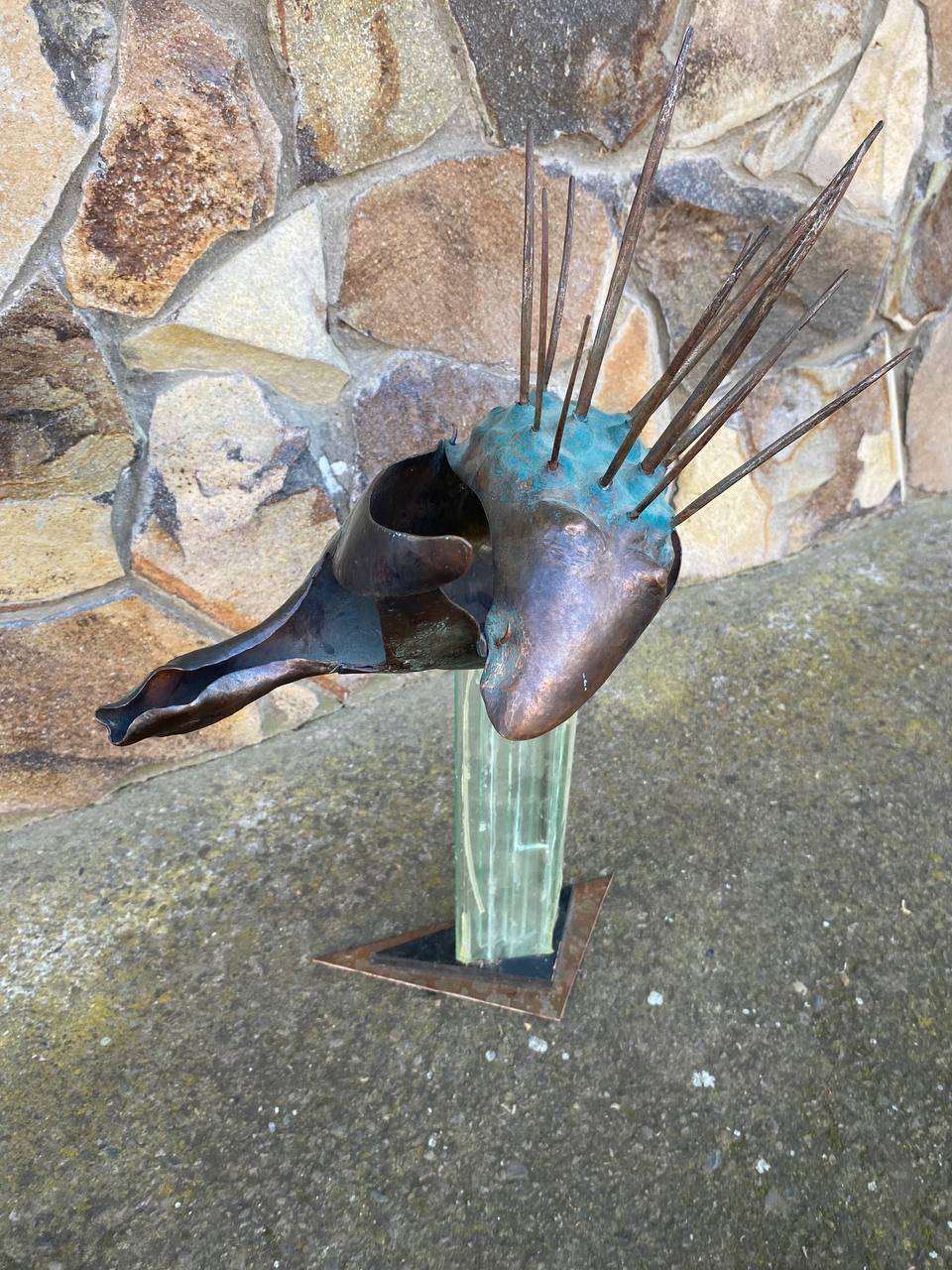 This striking bronze-and-glass sculpture explores the paradoxical relationship between softness and strength, vulnerability and defense. The form blends two symbolic creatures into a single abstract being: the fluid, flowing silhouette suggests calm and patience, while the sharp metal spines evoke resilience, protection, and the instinct to survive.