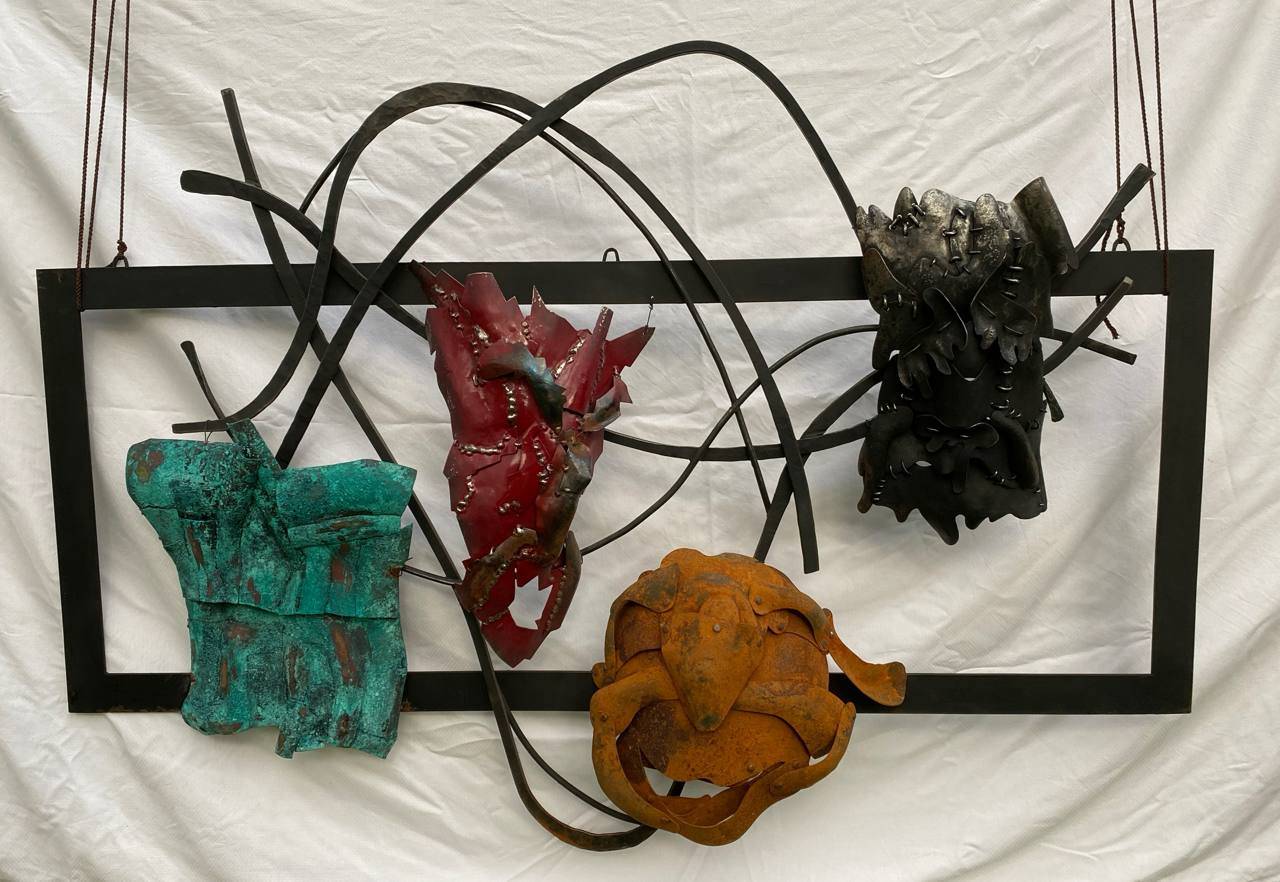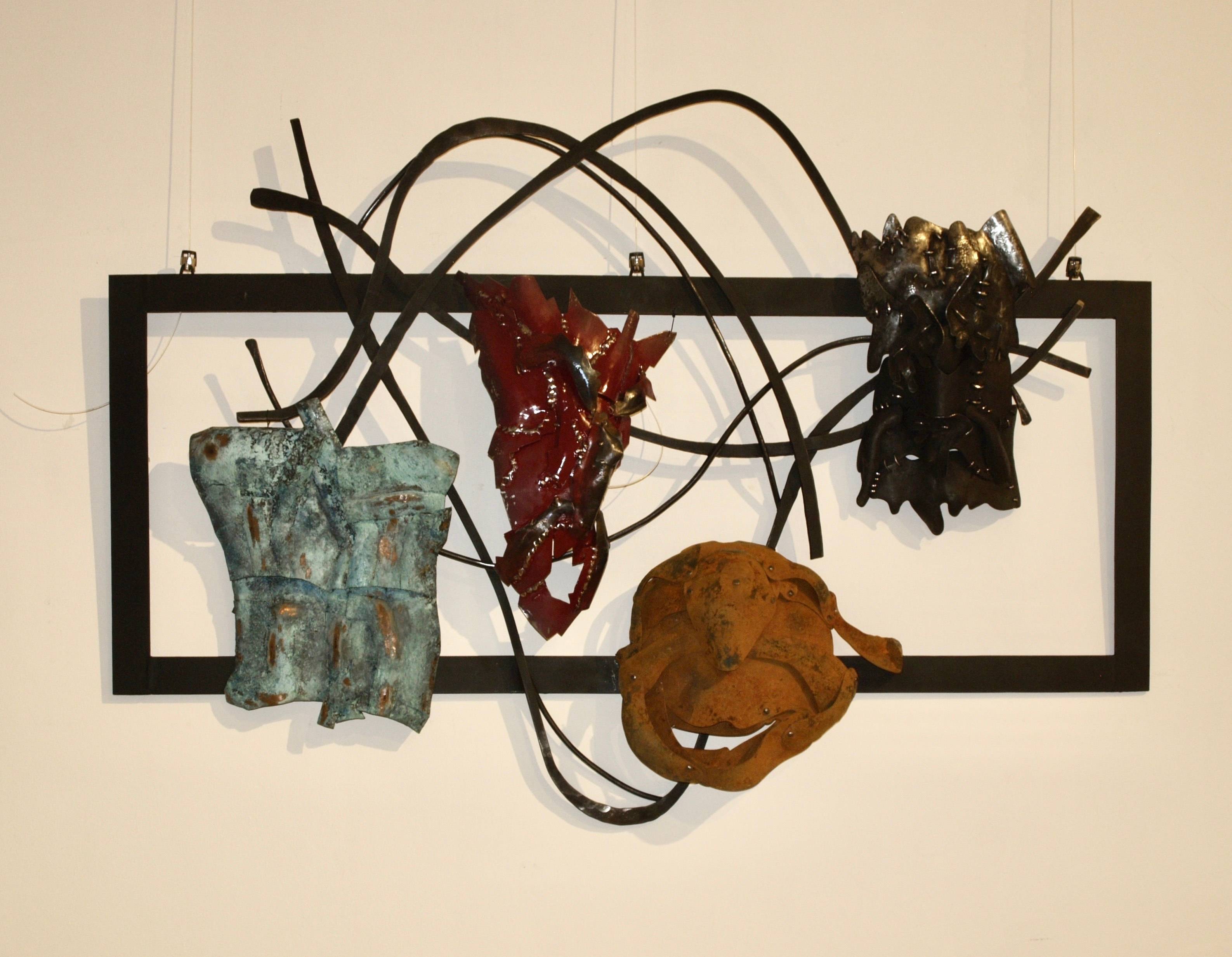 The composition consists of four expressive masks, each representing a distinct emotional state. Every mask is crafted from a different metal, emphasizing its character: copper, stainless steel, iron, and patinated surfaces.