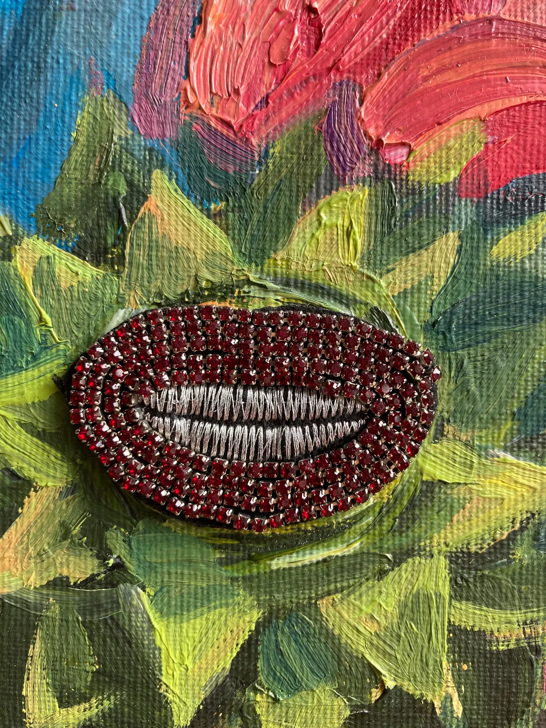 I consider this series a return to real life, which contains complex relationships, the ineffable, a premonition of the irreversible. On canvas, in addition to oil, I used collages, appliques, and beads, which became a tool for me to slow down time. With thoughts about beauty and fear, about my role: an artist, a woman, about the rules that limit your mind in this world.