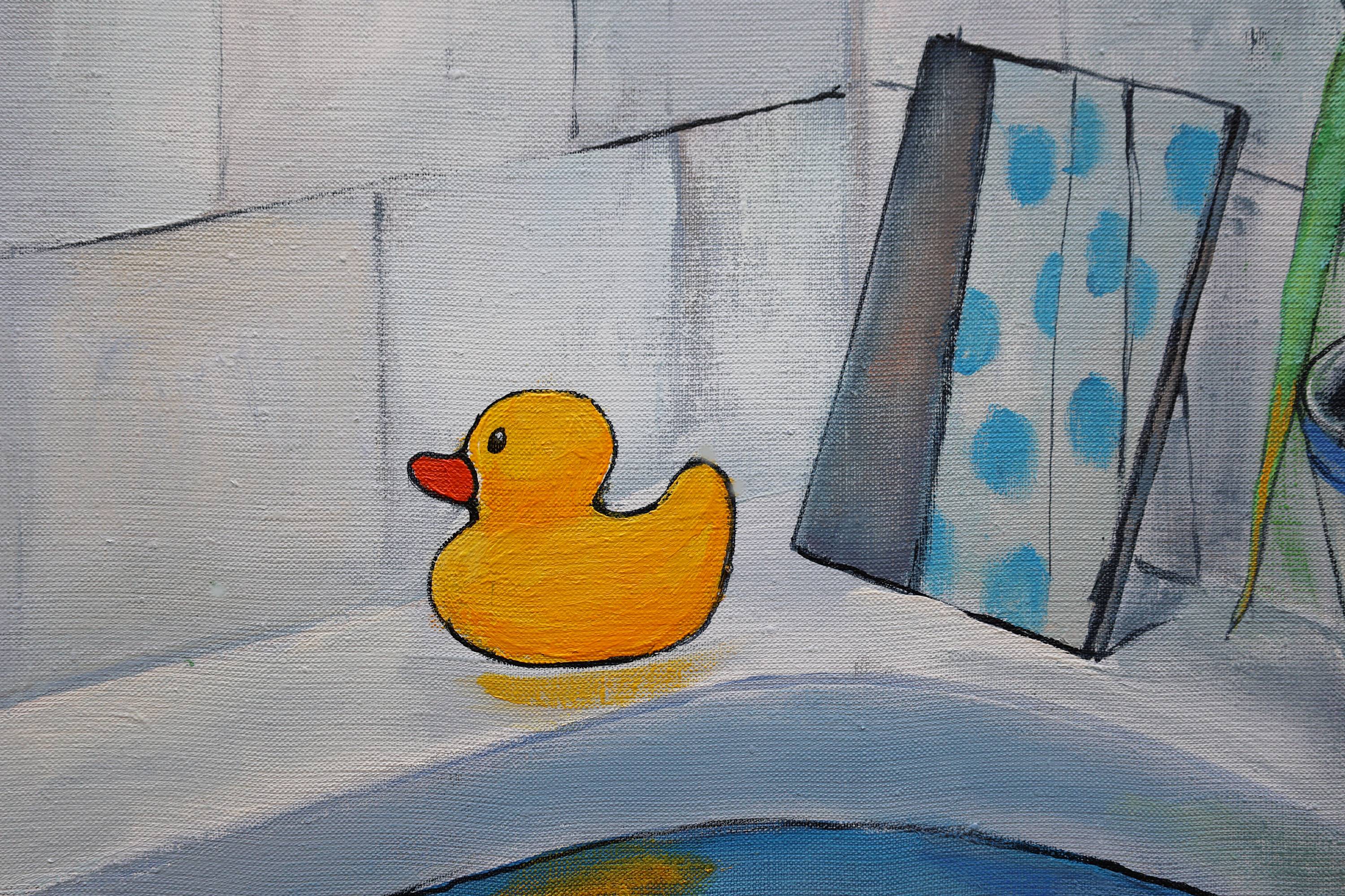 A quiet bathroom interior becomes an unexpected sanctuary, a place of refuge during nights filled with air-raid sirens and uncertainty. The soft pastel walls, the simple aloe plant, and the childlike rubber duck create a small island of calm amid the tension of war. The patterned shower curtain and everyday objects evoke the fragile normality people try to preserve while sheltering from Russian attacks. In this intimate scene, the bathtub represents a temporary safe space—where danger is kept outside, and a moment of stillness becomes an act of quiet resilience