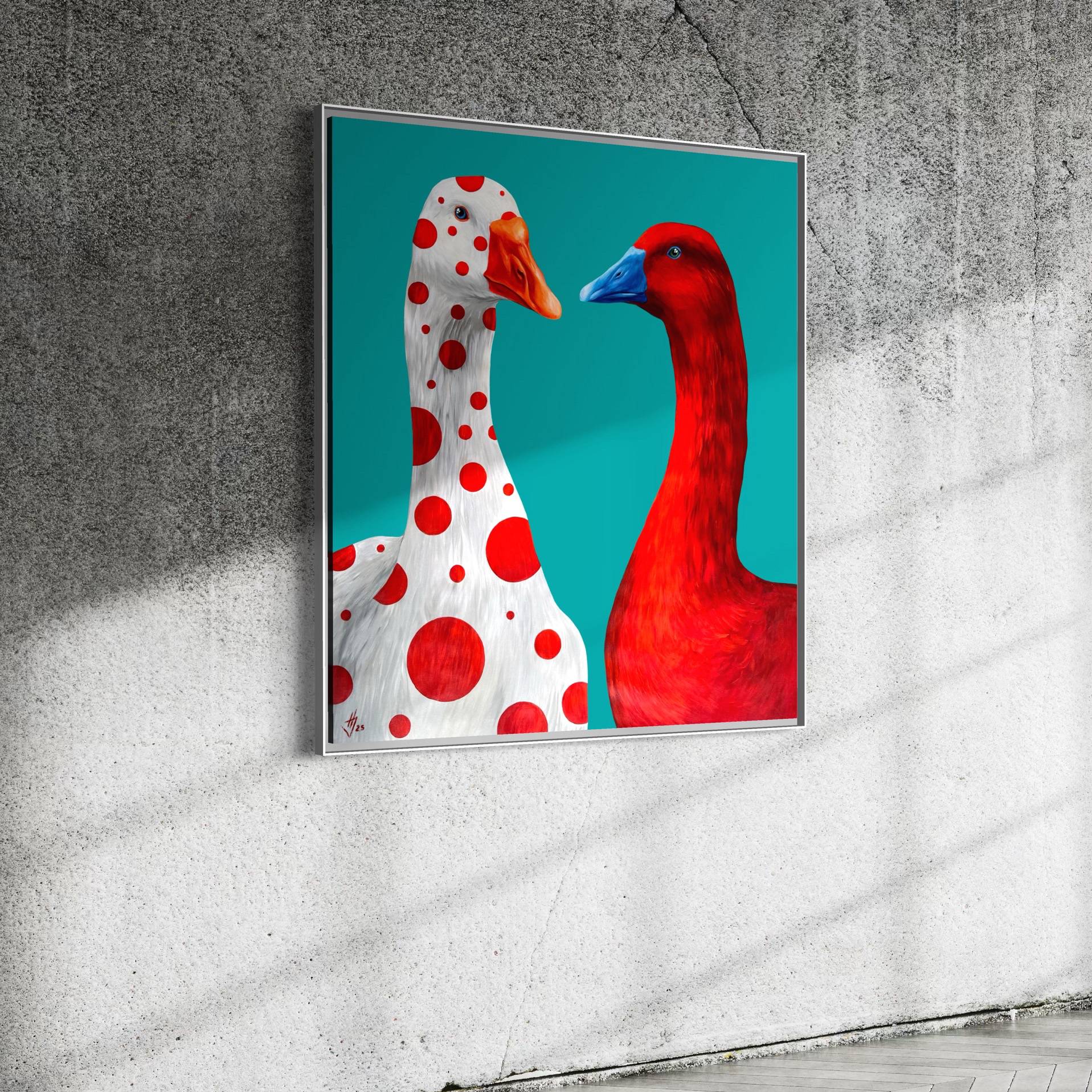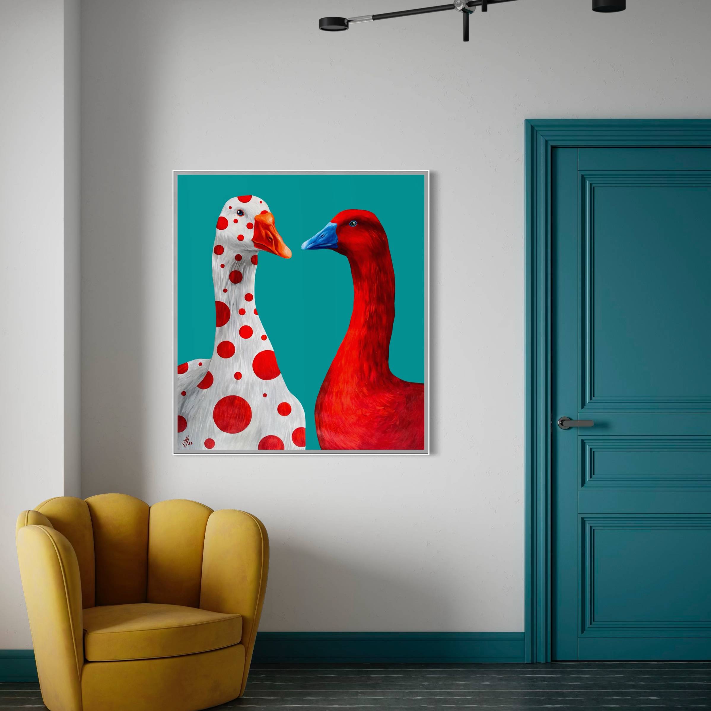 This piece tells the story of two beings standing side by side, each carrying a completely different energy. The red goose is vivid, dense, powerful — it almost radiates its own temperature. The white one is lighter, softer, more receptive. Its body is no longer a clean surface; it now carries the traces of the other’s presence.