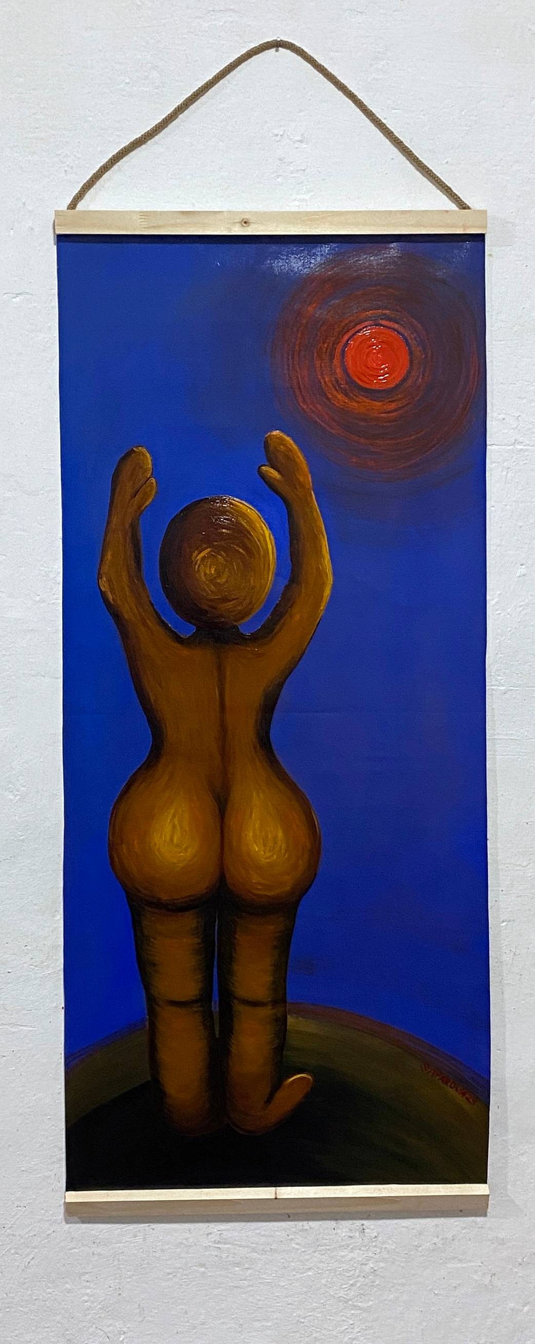 In my painting, Mother Earth extends her arms toward the sun in a pleading gesture, beseeching to preserve and protect her children. The viewer beholds her mighty presence, as if standing on the edge of the world. The clear expanse of the sky fills the canvas, emphasizing an ancient world where tranquility has not yet been disturbed.
