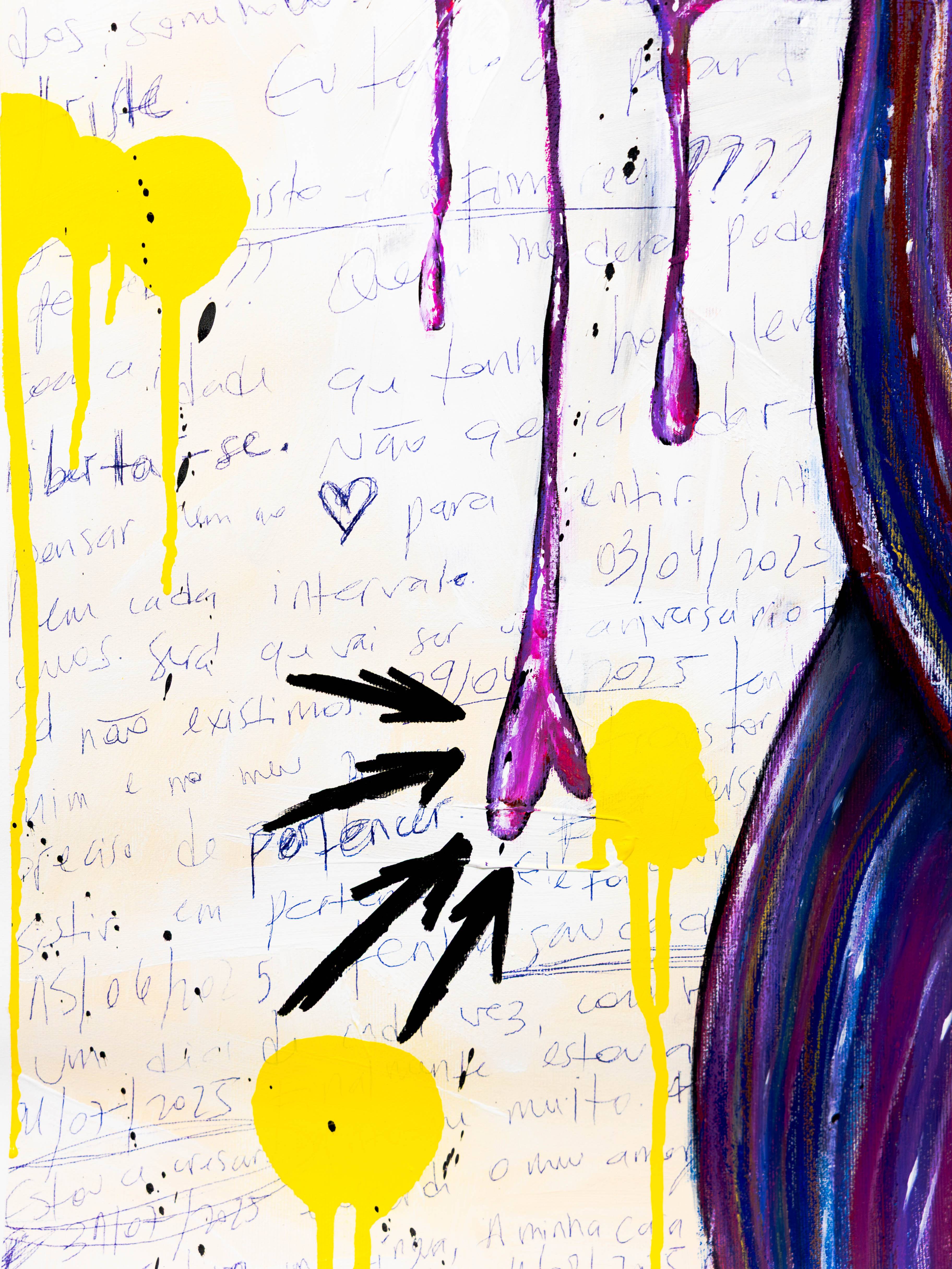 Her practice is an ongoing excavation of what it means to be human in its most unfiltered form. Through rawness, confessional writing, and symbolic imagery, she explores themes of identity, repressed desires, sexuality, and cultural constraints. Each piece becomes a site of tension between exposure and concealment, instinct and social order, fantasy and memory.