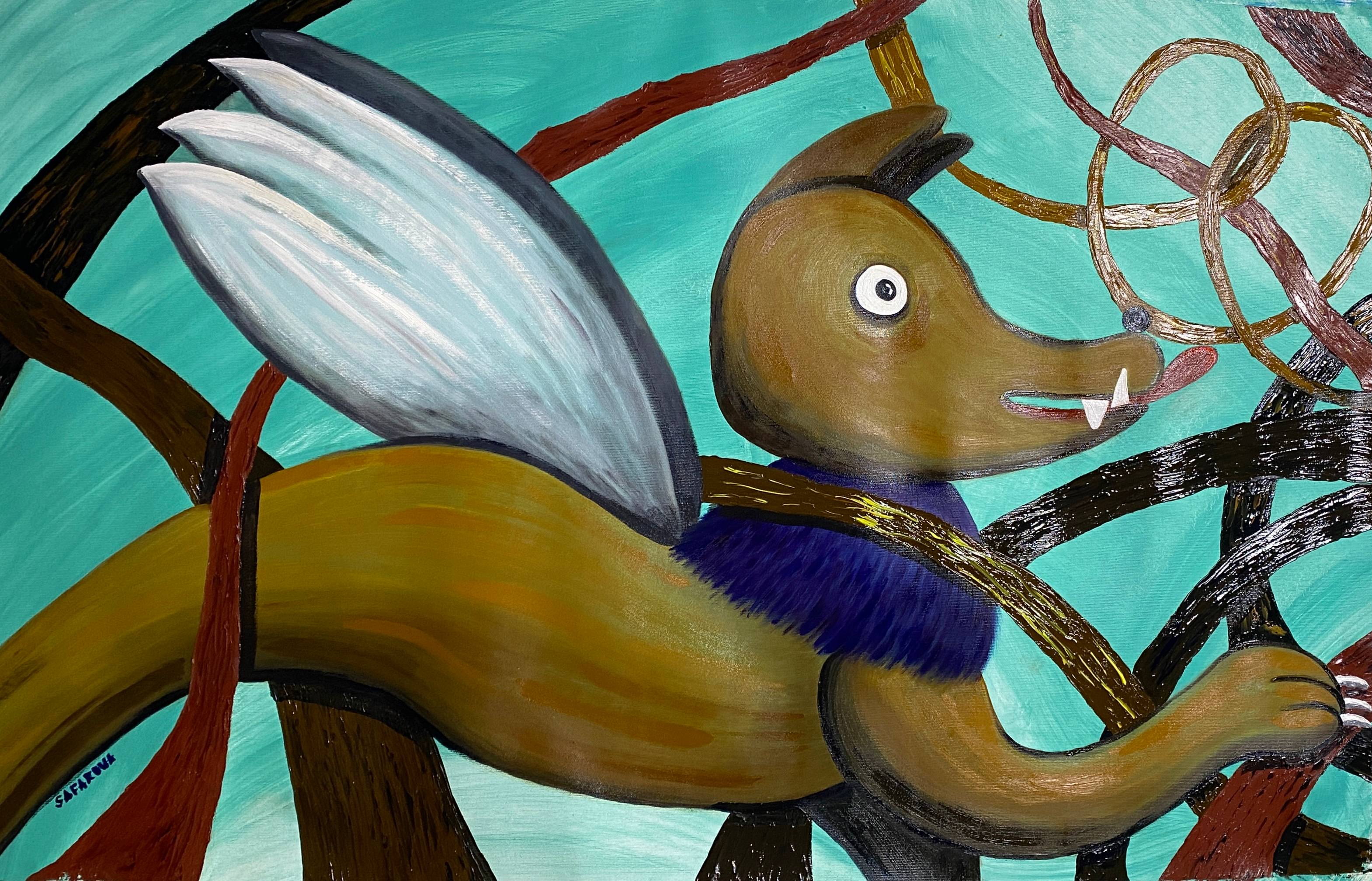 The painting depicts Simargl, the mighty guardian of the roots of the Tree of Life — half dog, half bird, embodying the strength of the soil and vegetation. He is the embodiment of "armed goodness," adorned with claws and fangs that emphasize his protective nature. The expression in his eyes is filled with hope and enthusiasm, seeking to awaken these feelings in the hearts of those who contemplate the artwork. The painting recreates an almost forgotten image, veiled by the deep layers of ancient belief. These insights reveal their relevance, contributing to the modern Ukrainian people in their struggle for freedom and self-determination.
