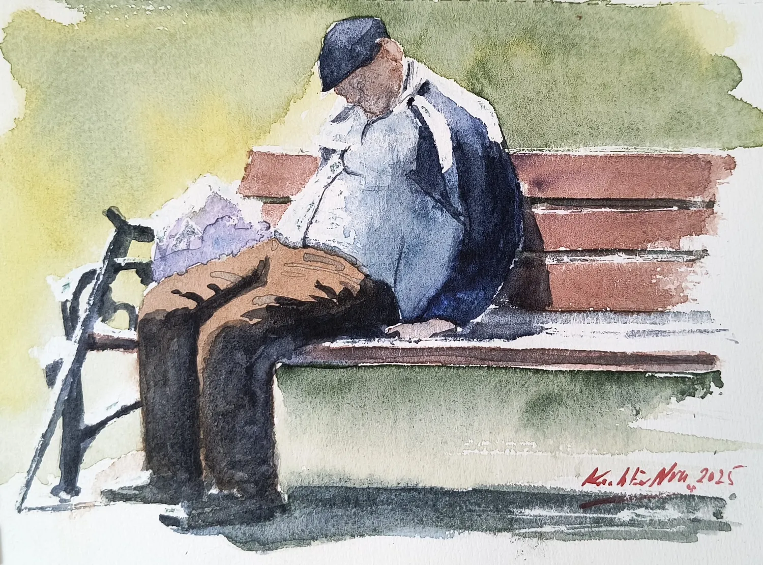 An elderly man resting on a bench in a park.