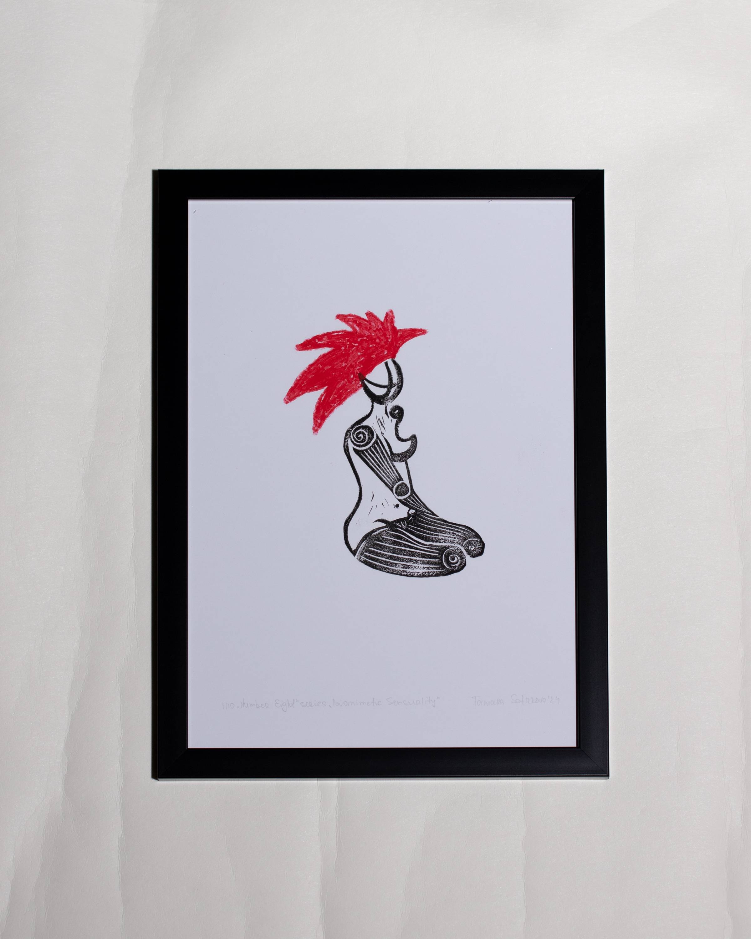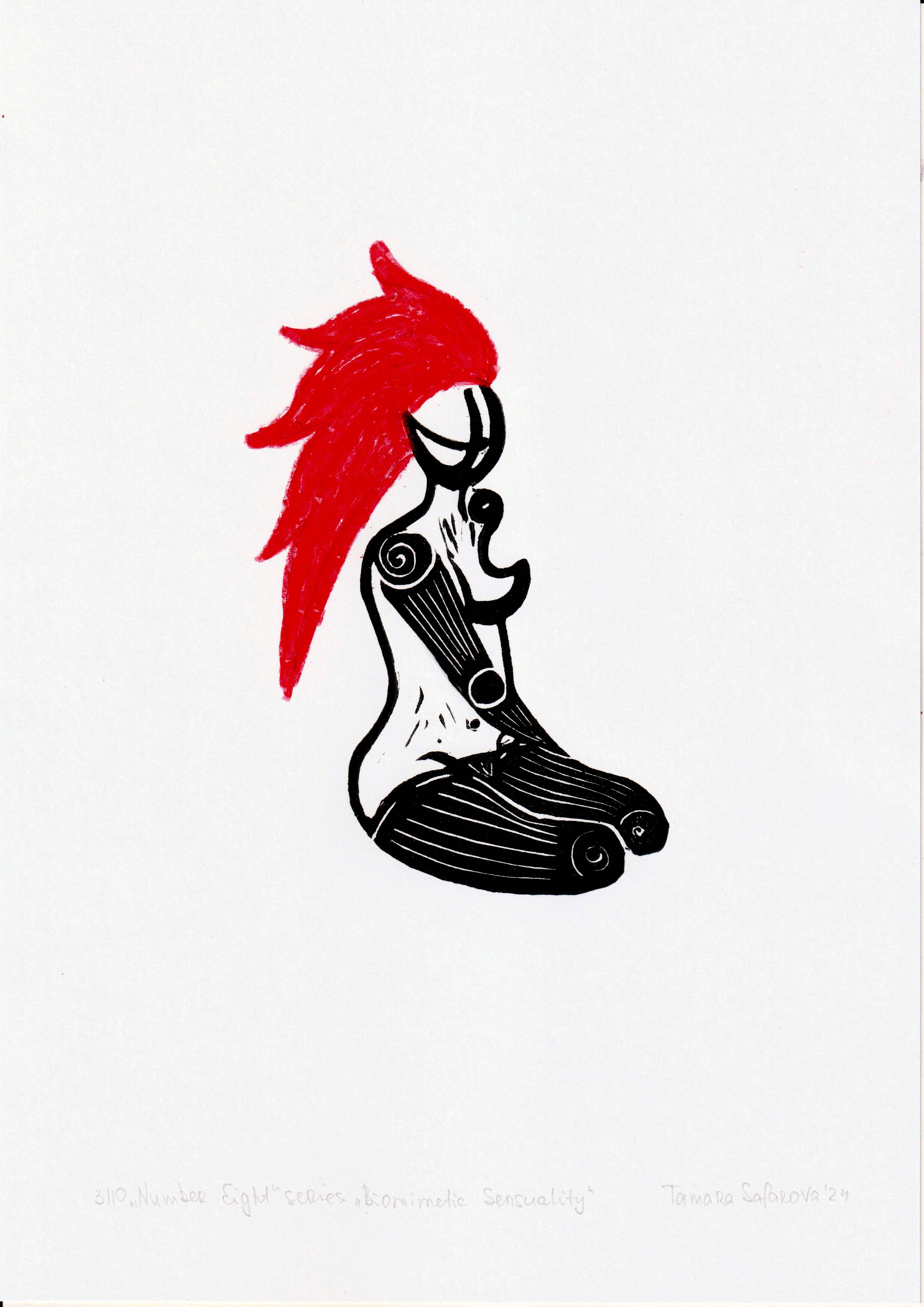 The series "Biomimetic sensuality" reflects on physicality and societal acceptance in the context of the ongoing war in Ukraine. This series delves into the new realities faced by people who have lost limbs and are forced to learn to live with artificial prosthetics. It explores societal reactions and perceptions of sensuality and emphasises the challenges that individuals face in reclaiming their sense of dignity and bodily autonomy. The series consists of 10 linocuts depicting nude female figures with artificial limbs. The figures are portrayed in relaxed, confident poses, symbolising the outward confidence. However, the internal emotional landscape of these figures remains a poignant question: are they as calm and confident inside as they appear on the outside? The use of red hair symbolises the explosions and violence of the war, which have caused both visible (external) and invisible (internal) traumas. Edition: 1/10