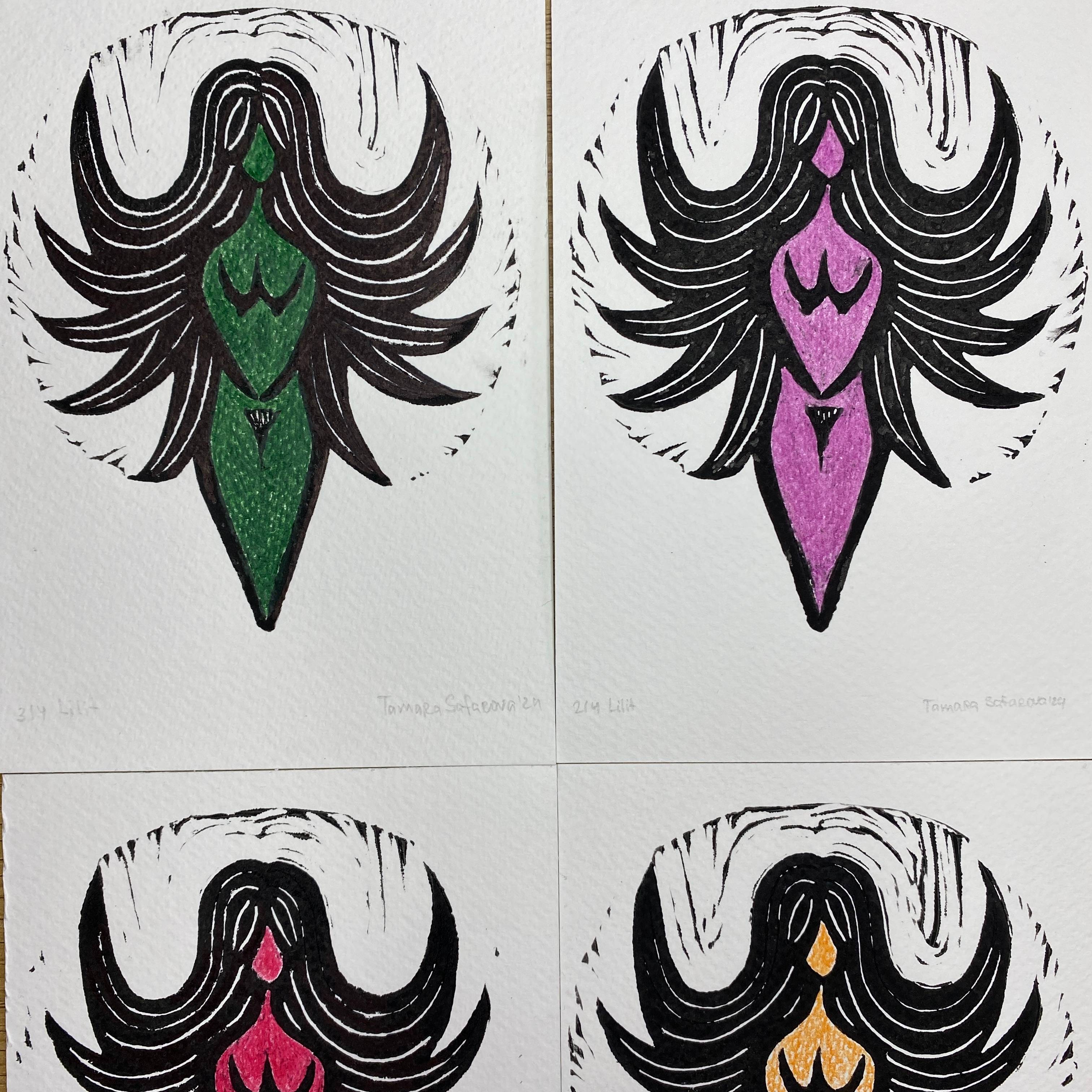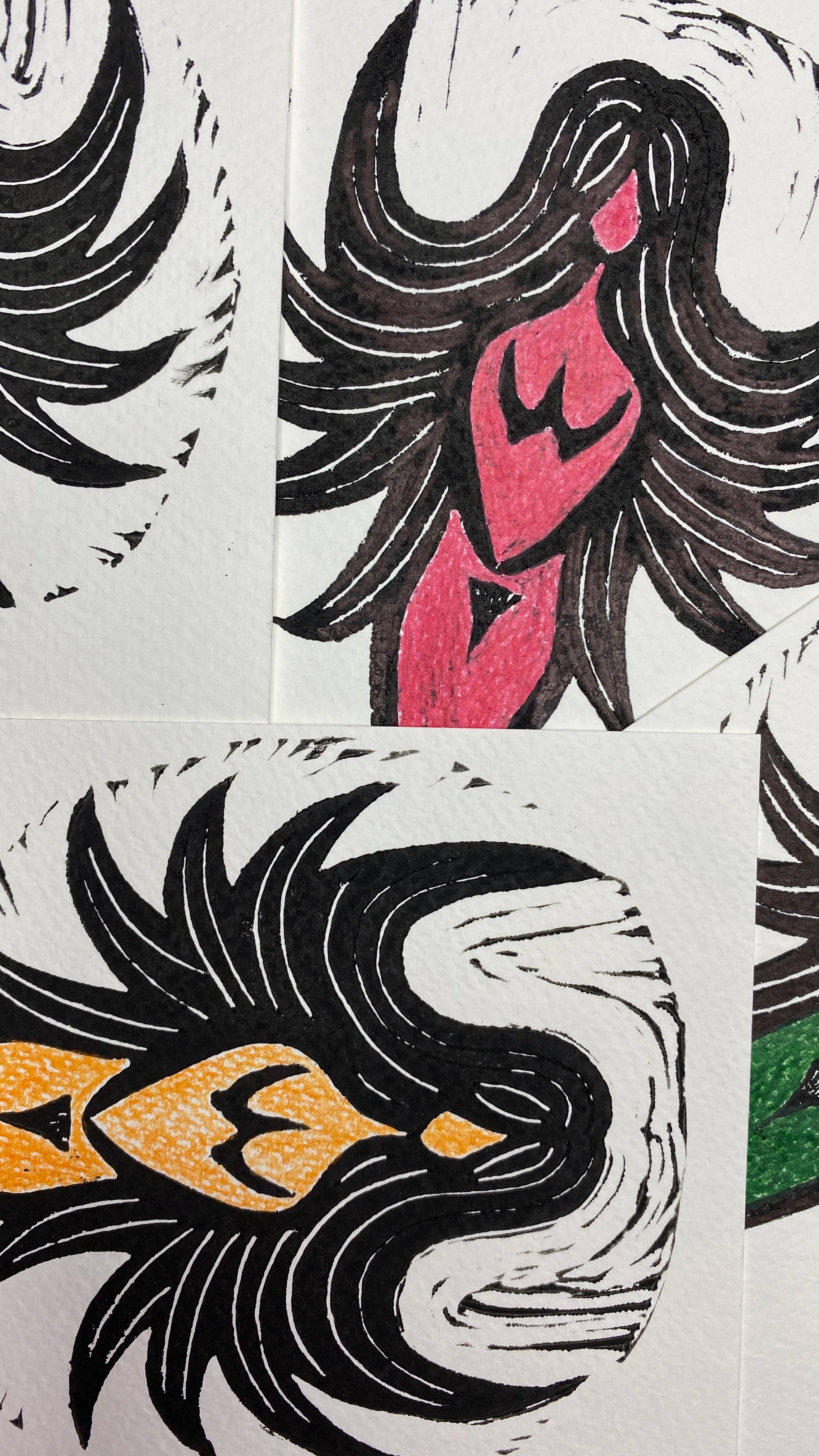 Linocut, colored pencils