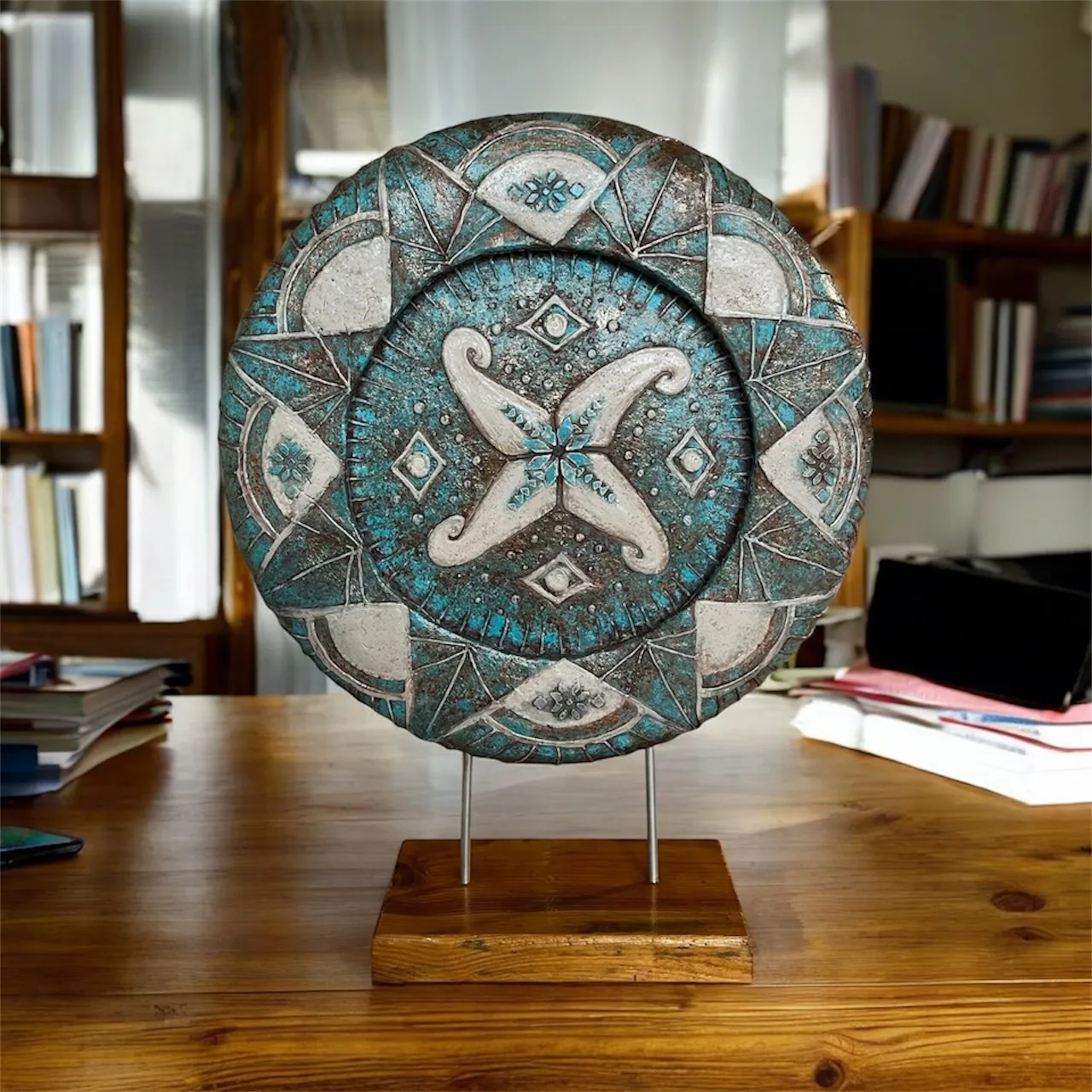 The surface is finished with a patina effect, making the object look as if it has been preserved in the earth for centuries. This adds a feeling of time, history, and depth.