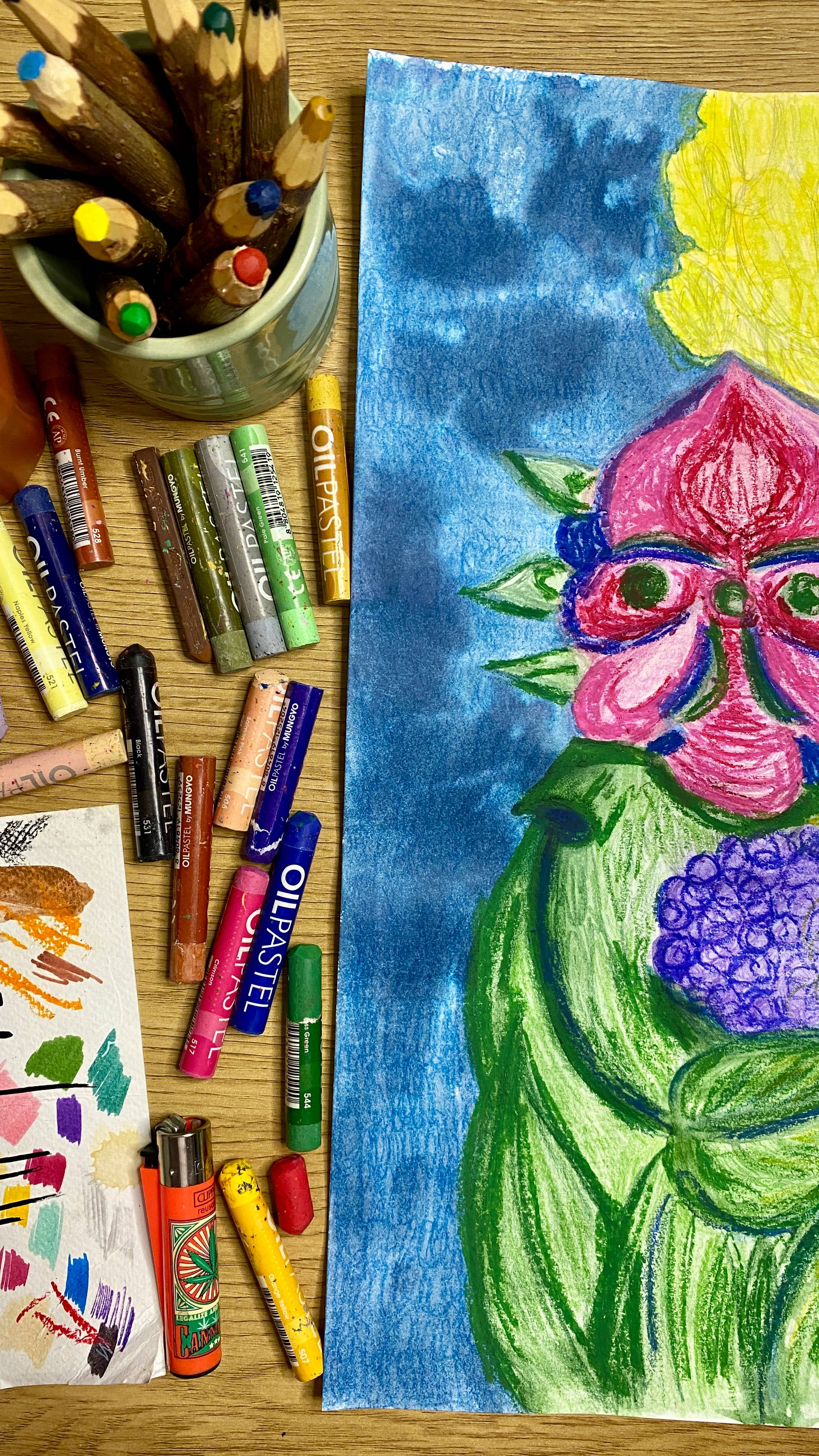 29.7 x 42 cm • Watercolor, Oil stick, Colored pencils