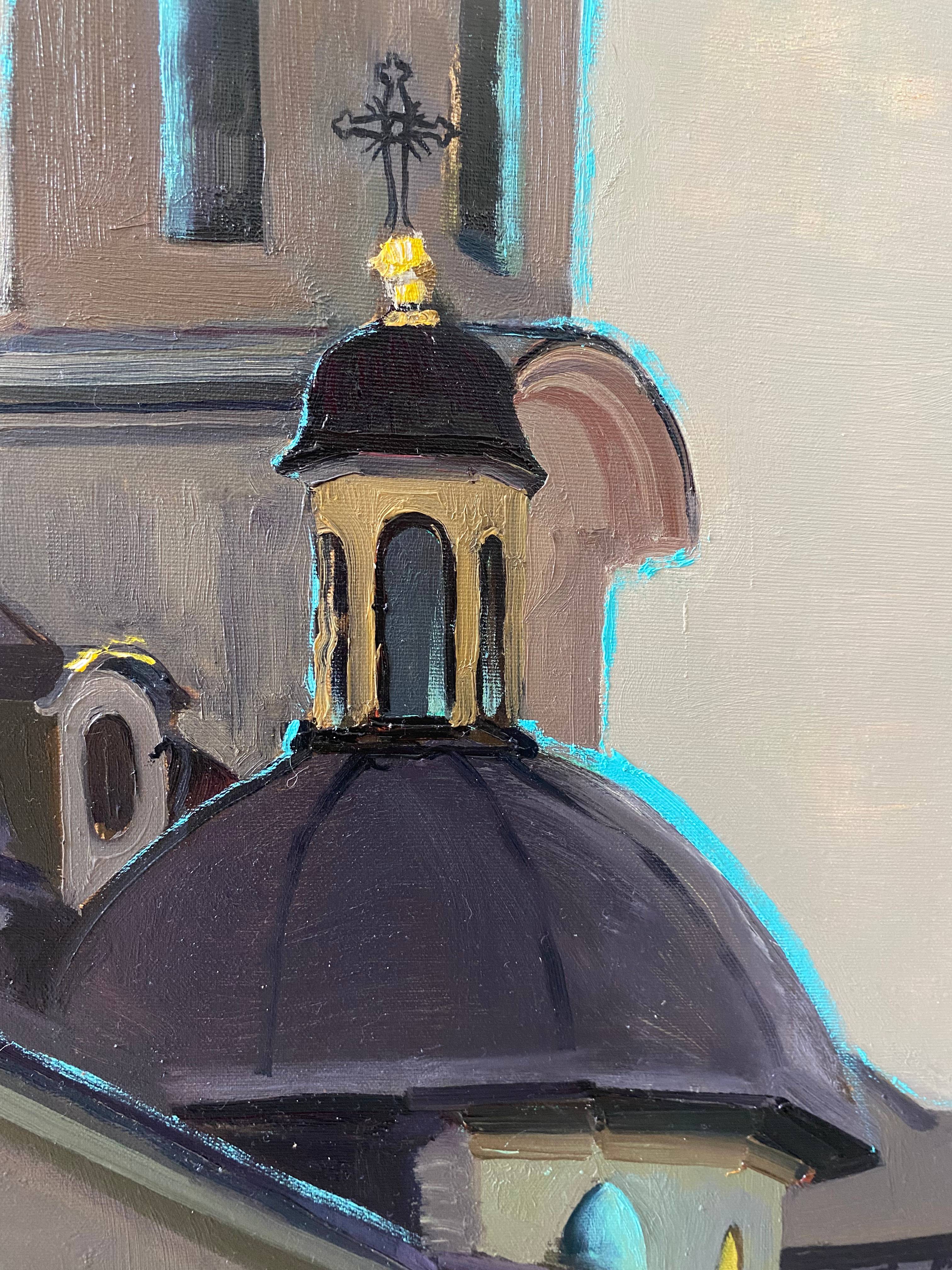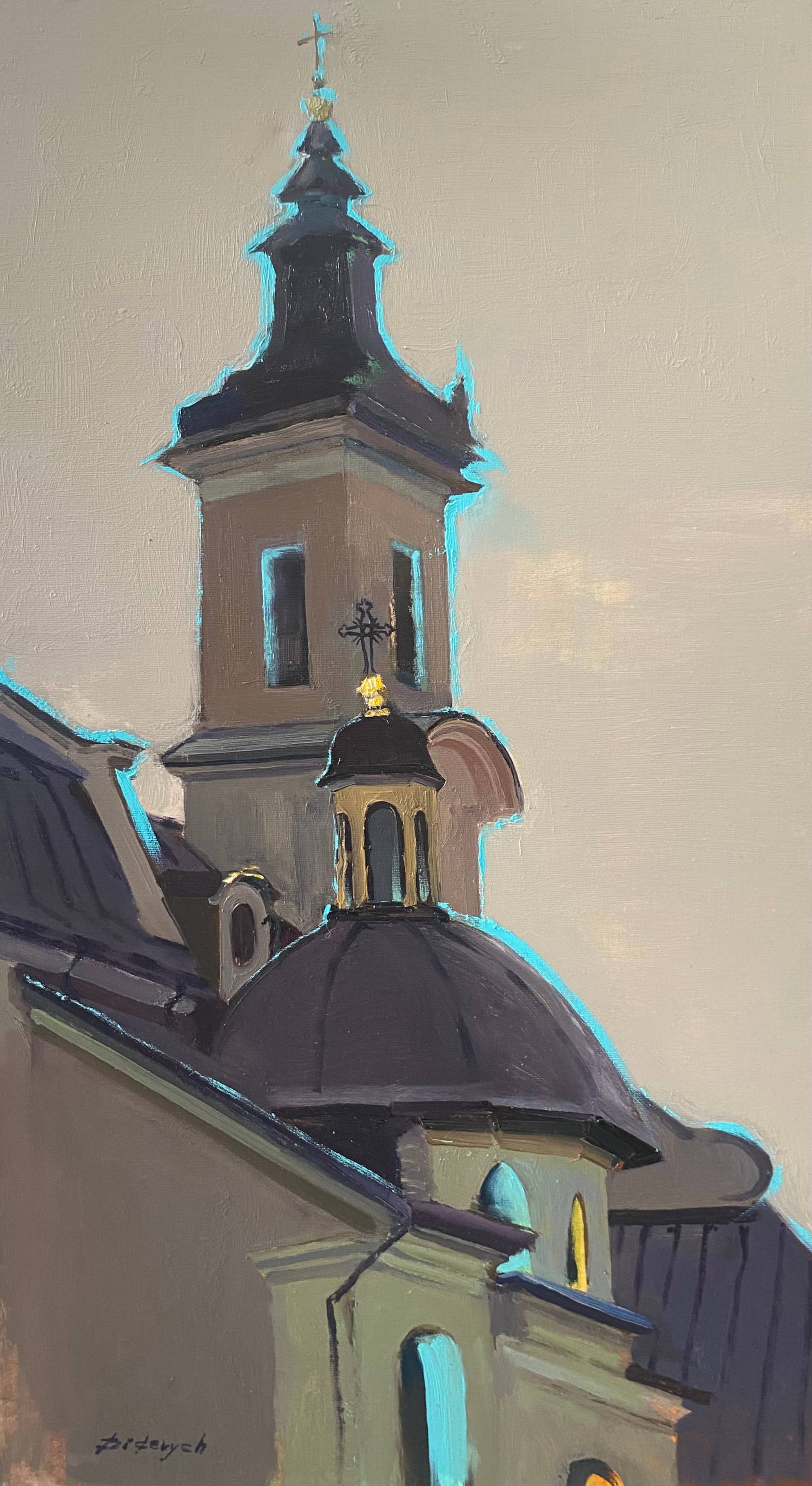“Evening in Kamianets” captures the quiet, poetic atmosphere of Kamianets-Podilskyi at dusk. Soft evening light gently outlines the church domes and towers, highlighting their elegant silhouettes against the fading sky. Warm window glow contrasts with cool turquoise reflections, creating a subtle interplay of mood and color.