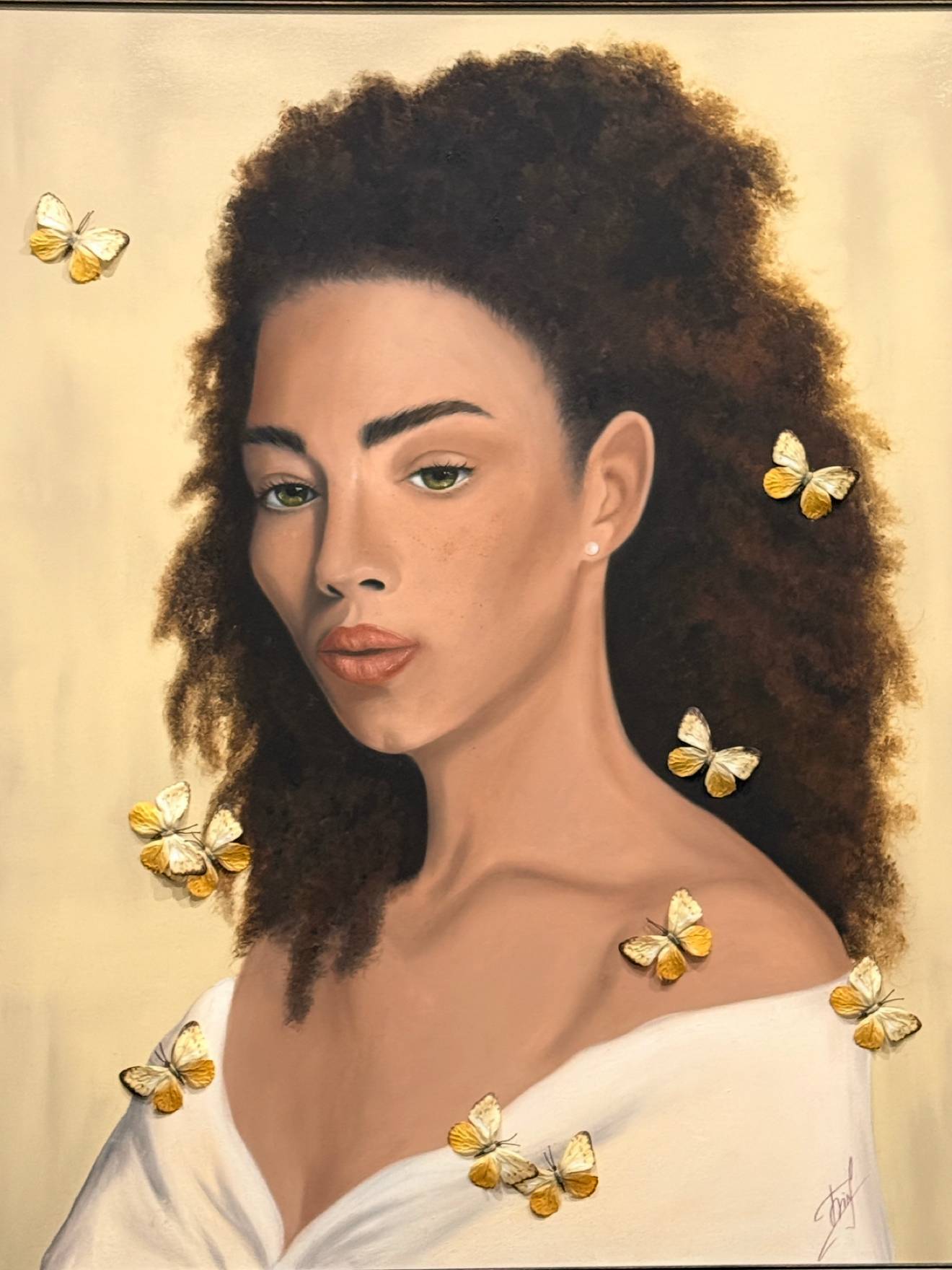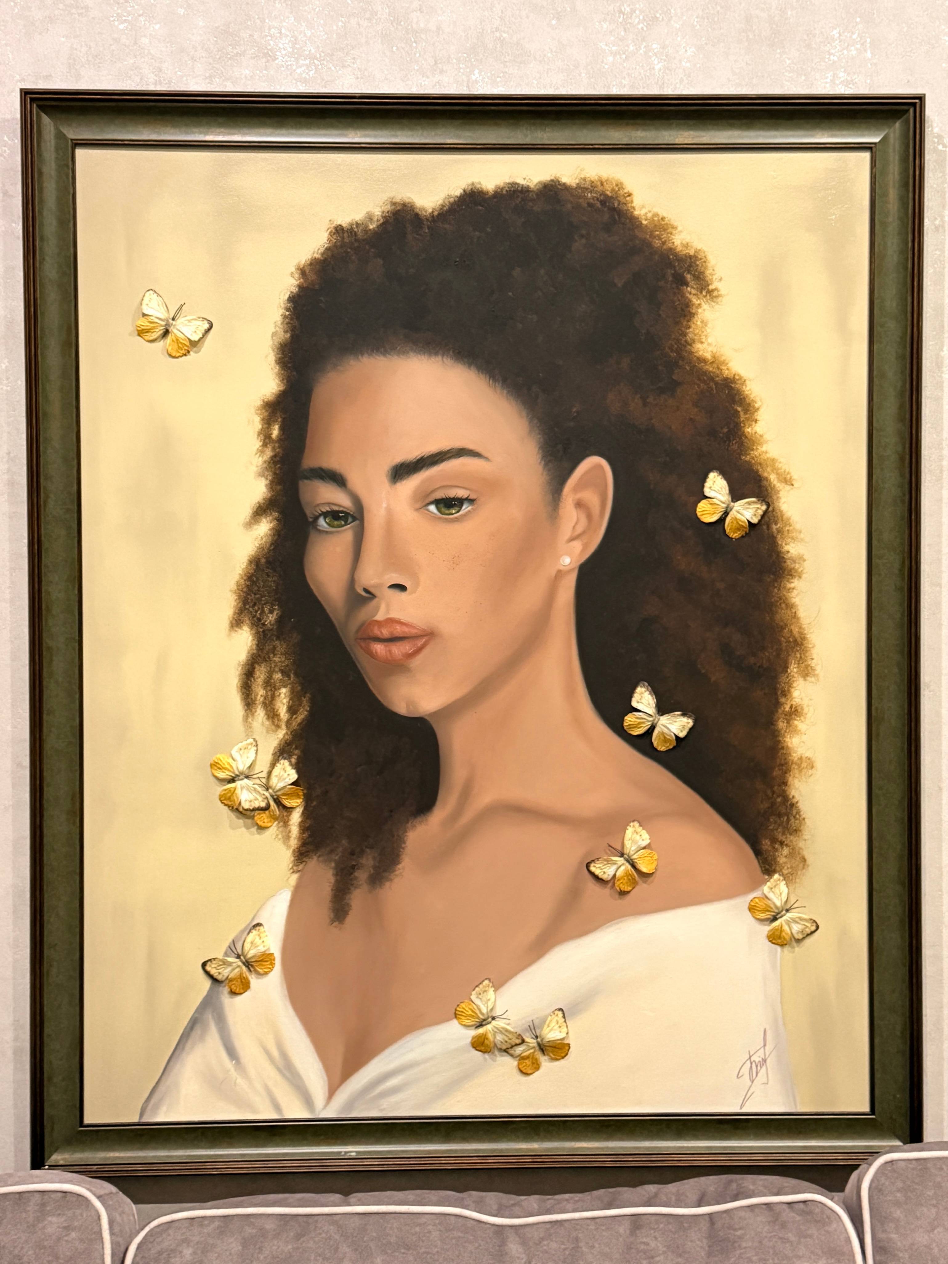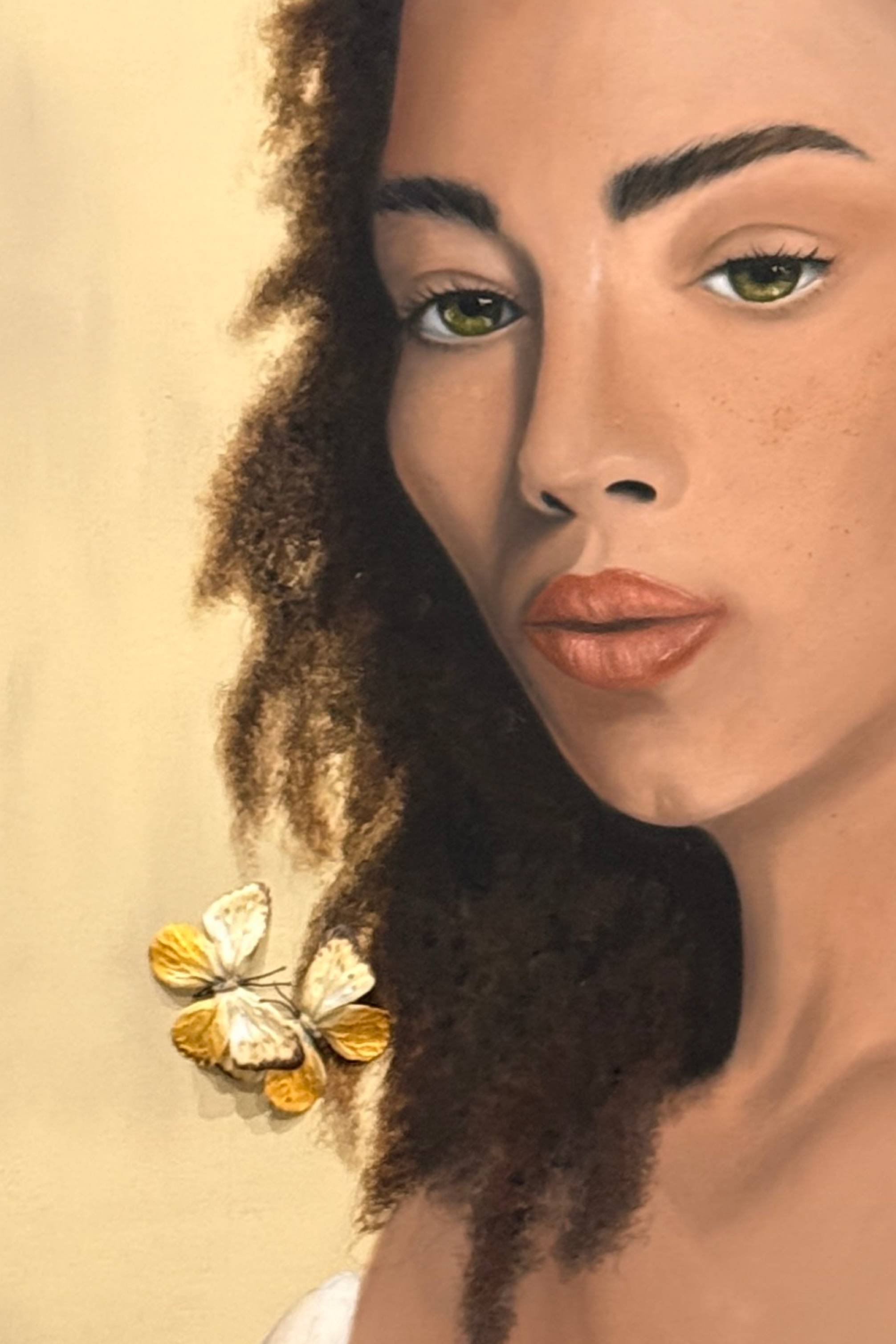 The butterflies surrounding her symbolize fragility, sensitivity, and vulnerability — the parts of herself she keeps protected. They represent her true nature, hidden behind composure and independence.