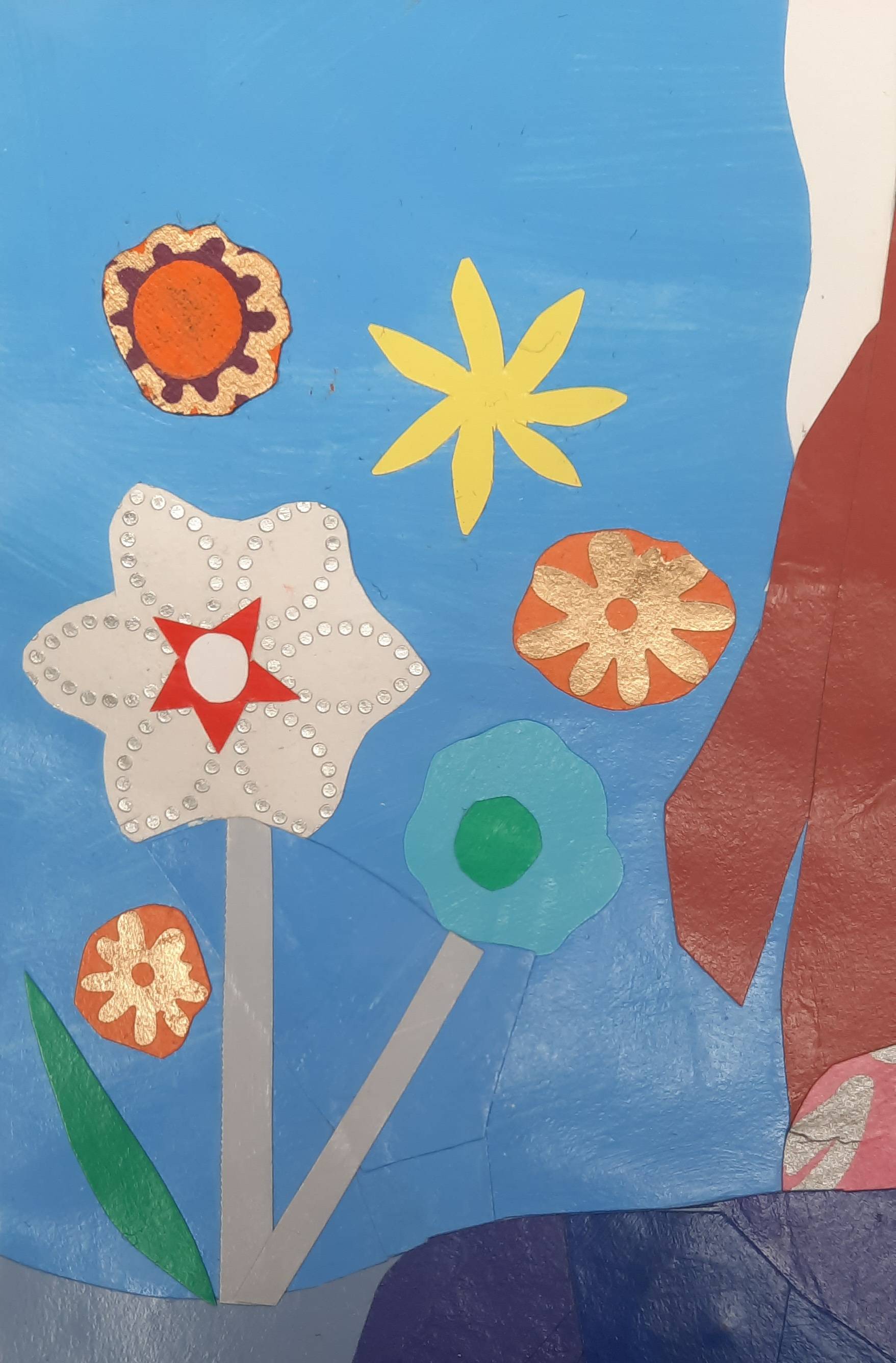 It is a collage of acrylic painted paper and Indian hand made paper.
