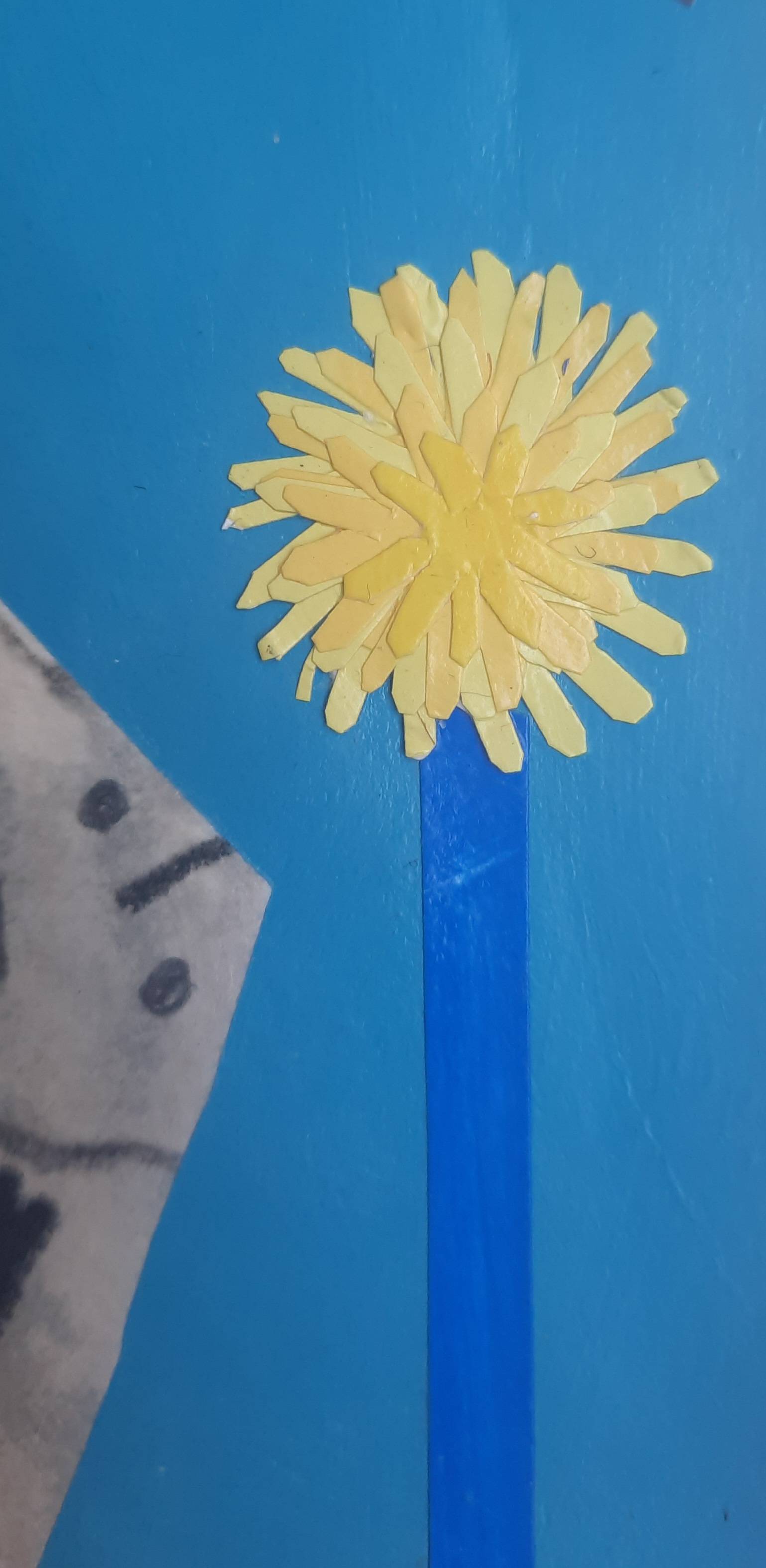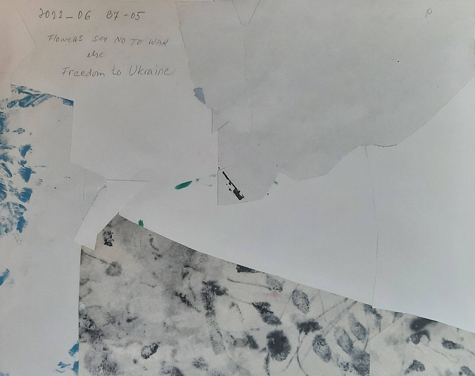 This is a collage of acrylic painted paper and India ink painted rice paper. You can see on the detail that I sometime cut very small pieces to convey reality. The back shows that I do not use flat surface to attach pieces to but instead attach one cut out piece to another until my collage grows to a finished artwork.