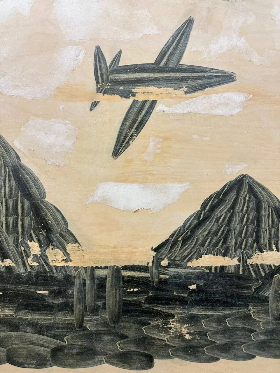 The works were created using the author's technique. They consist of scanned sunflower seeds, a collage created in Photoshop, large-format printing, and decoupage transfer to a plywood tablet. The work, made from two tablets, measures 360 x 125 cm in total.