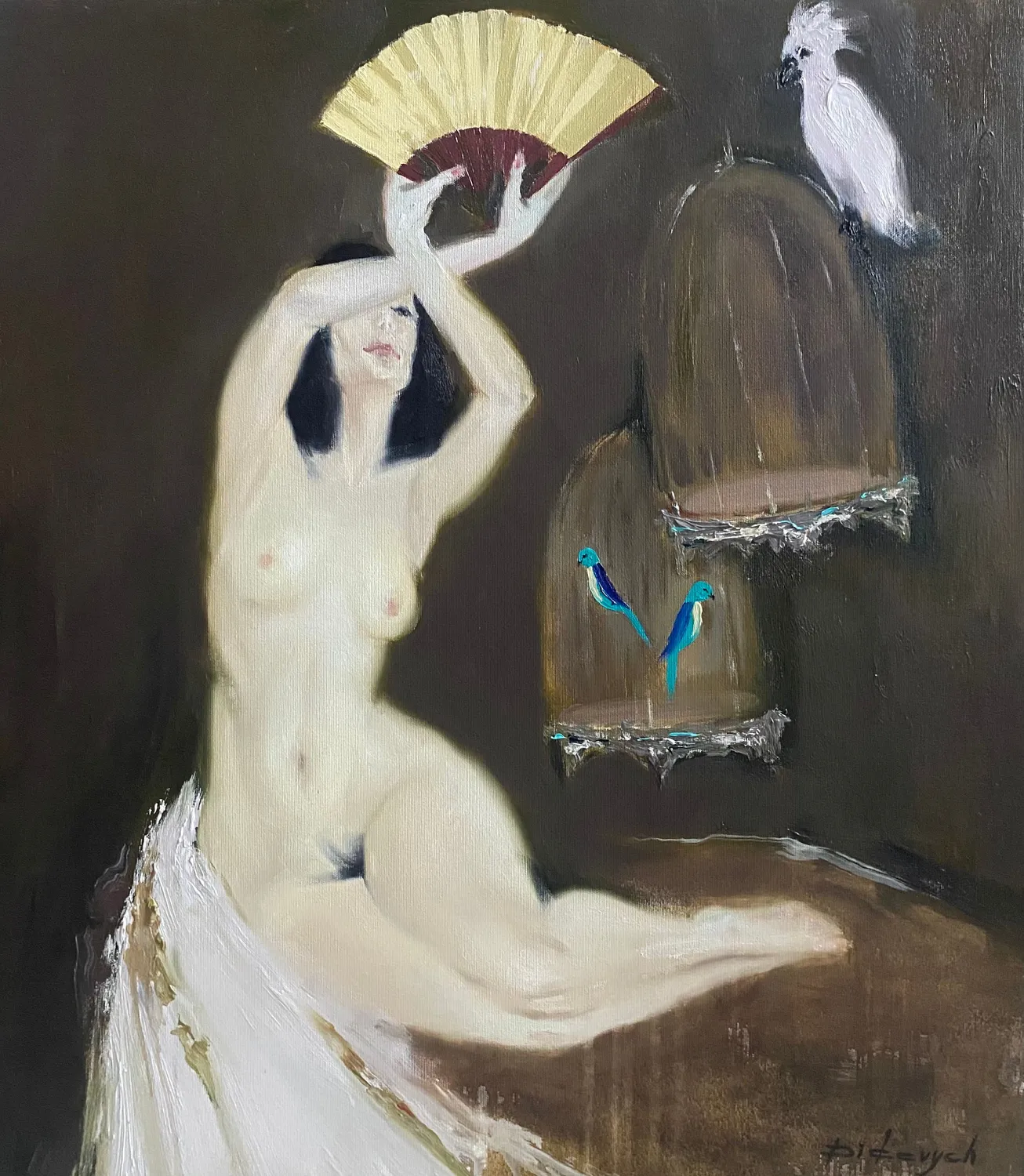 The fan in her hands becomes a gesture of protection and ritual, a delicate boundary between openness and detachment. The entire scene is immersed in half-darkness, where the light of the body and the vivid accents of the birds create a dreamlike, almost remembered atmosphere.