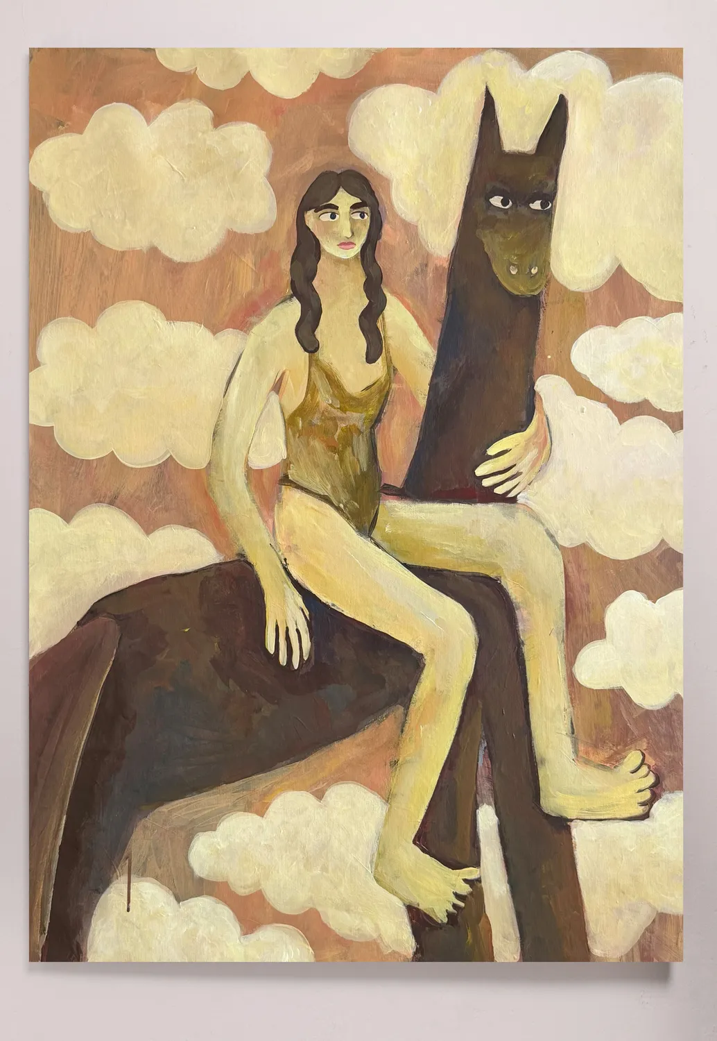 The expressive portrait of a woman and animal amidst clouds evokes a sense of mythic folk art. This piece is a visual representation of navigating the unseen forces within. The naive art style enhances the emotional depth and invites viewers to contemplate their own inner landscapes.
