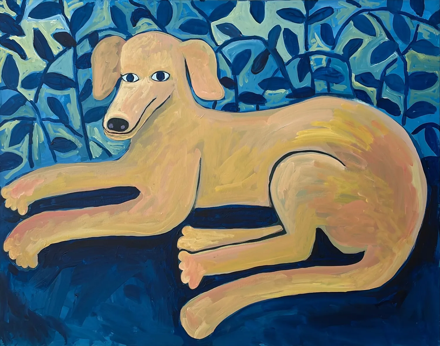 Dog Shilo sits in the bushes. The picture is drawn from my sweet dog