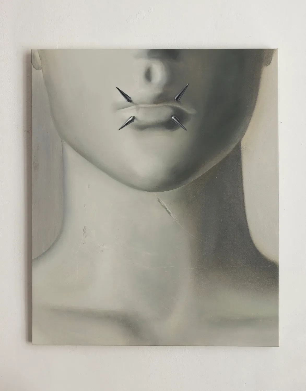 A plastic mannequin with sharp lip piercings which imitates sprouting thorns, draws the viewer’s focus to the mouth, where the artwork seems to hold something unspoken. The artwork embody a word frozen within the still, inanimate form of the mannequin. What this word is remains open — left for the viewer to choose. It may be something one longs to hear, something one wishes to say to another, or perhaps something addressed to oneself.