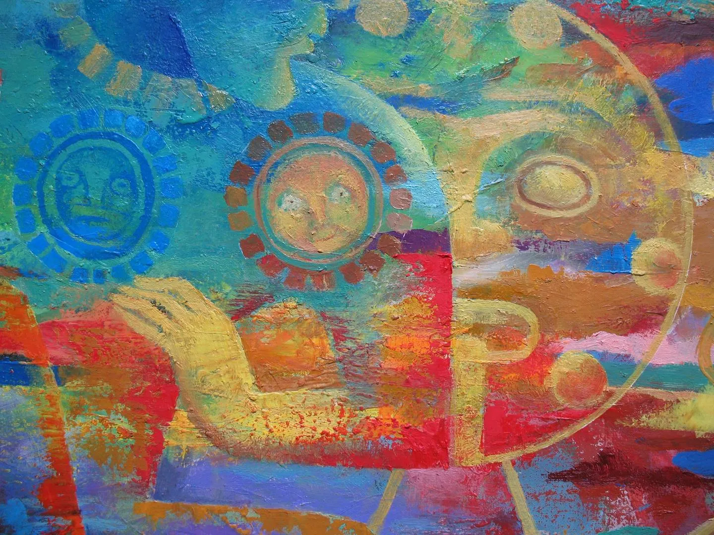 Another of the artist's works, which showed her interest in the themes of ancient civilizations and their myths. What is important, as in the "Allegory of Continuity", "The Sixth Sun" does not express only ancient ideas about the world, but proves that they are still applicable to the current historical moment. The Maya had a rich cultural and mythological heritage. Like many other peoples, their divine pantheon was organized around the practice of calendar rituals. The sun is depicted in the center of the picture, because it is thanks to it that the calendar systems of all supporters of the solar cult are built. The stylization of the image of the sun corresponds to the way it was captured on the “Stone of the Sun” monolith. The Maya sun cannot be called good-natured, it incinerates what he does not like, like a stern sovereign. The Mayans made sacrifices to him to appease him. The period of the "fifth sun" ended in 2012. Perhaps the transition to a new era is taking place right now. The very word "Maya" exists in ancient Indian philosophy. It has two meanings: "the source of this world" and "illusory world". Apparently, illusions are dispelled, the sun destroys everything that has lost its relevance - according to the predictions of the ancient Mayans. The man sitting in the foreground is not a priest of a cult and is not even typical representative of his people. This is the god of the sky and the sun - Tonatiuh. He ruled the fifth era that ended. The artist depicted this god by slightly changing his iconography. Tonatiuh was painted as young men with a red complexion. To maintain strength and preserve youth, he must receive the blood of his victims. In the picture, his face is green, this expresses the hope that the sixth sun will be benevolent towards humanity.