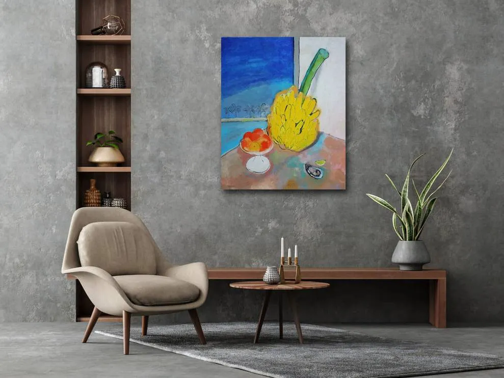 This still life depicts a branch with bananas, oranges and an oyster with lemon. Fruits are placed on the table against the backdrop of an open window. The picture is clearly dominated by the yellow color of bananas, which sets the mood and dynamics of the whole picture. Bright and open colors go well together. The decorative and expressionistic approach hints to the viewer that the artist may have been inspired by the art of the 60s.